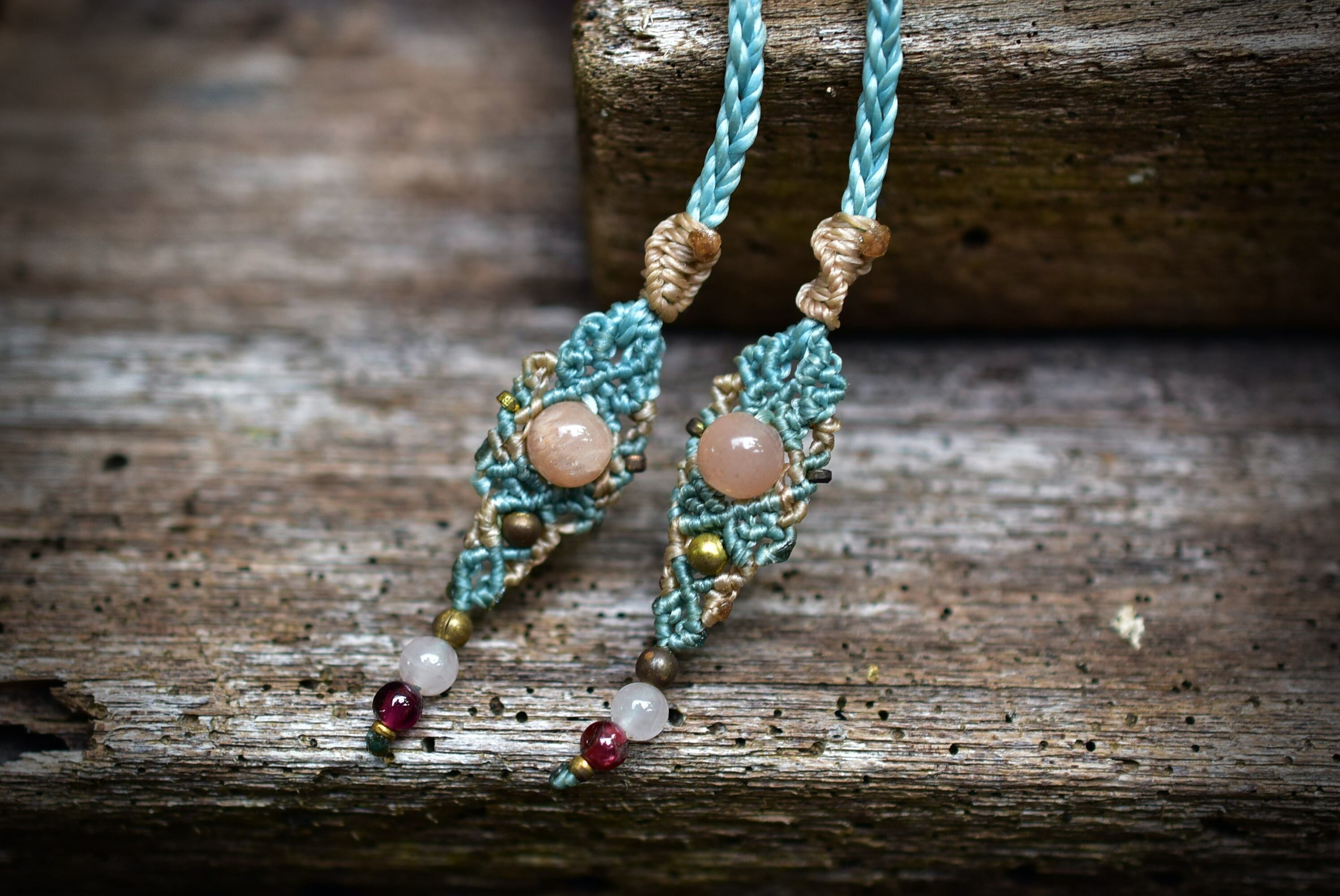 紐の先のエンドの部分にはピンクが愛らしいピンクムーンストーンを使用し、細やかなマクラメ編み装飾を施しています。