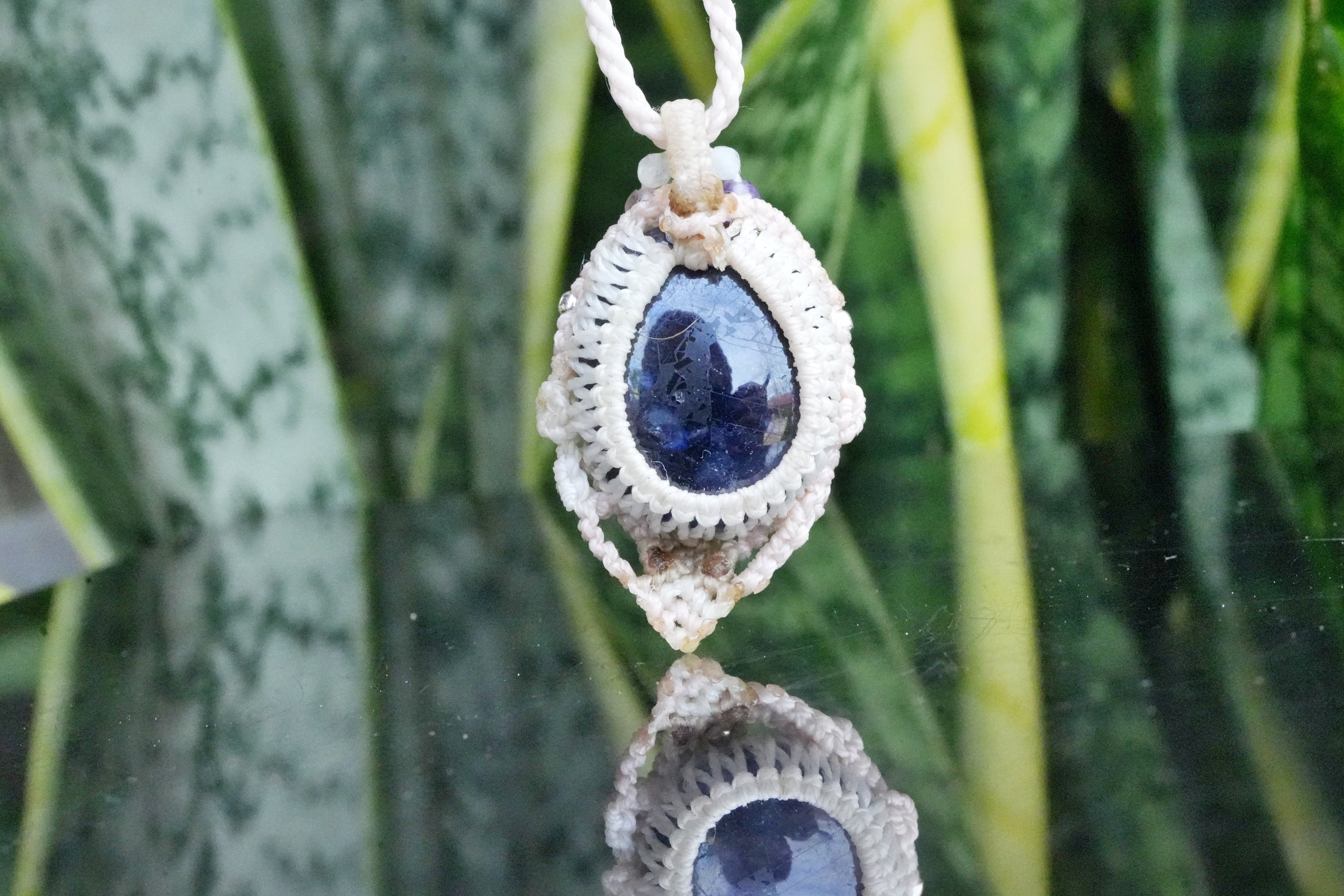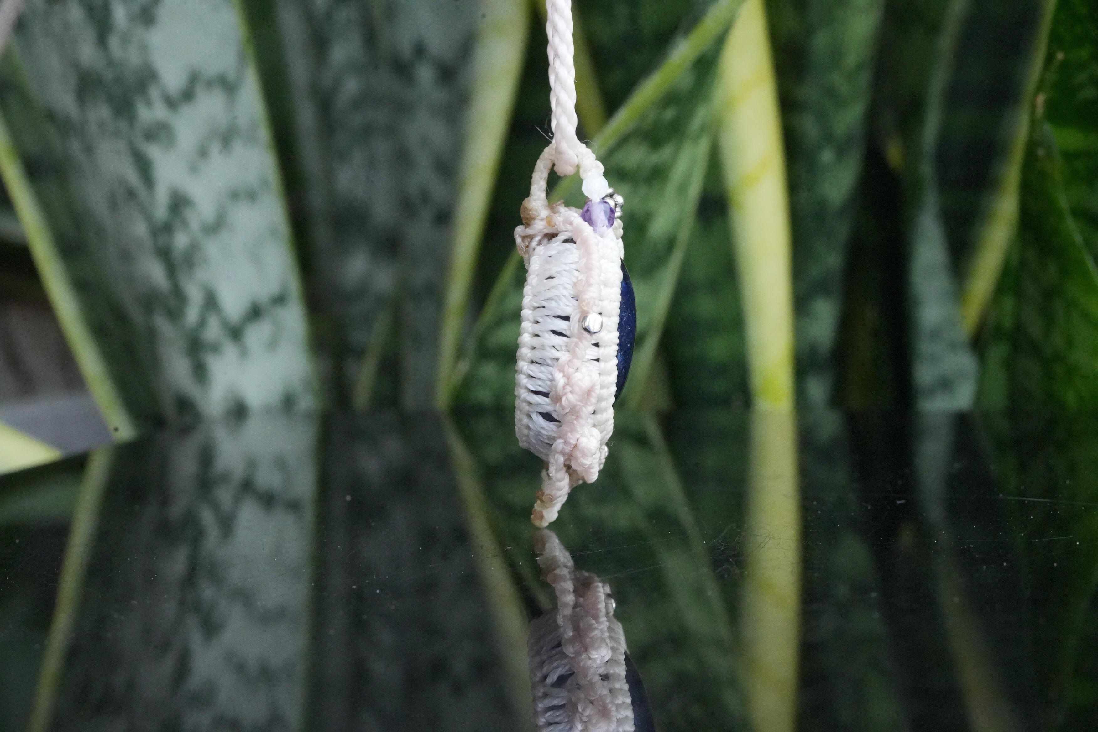 ◆このたびはナチュラルホワイト、ヘンプ、ホワイト色の蝋引き糸を使用しマクラメ編み装飾を施しました。