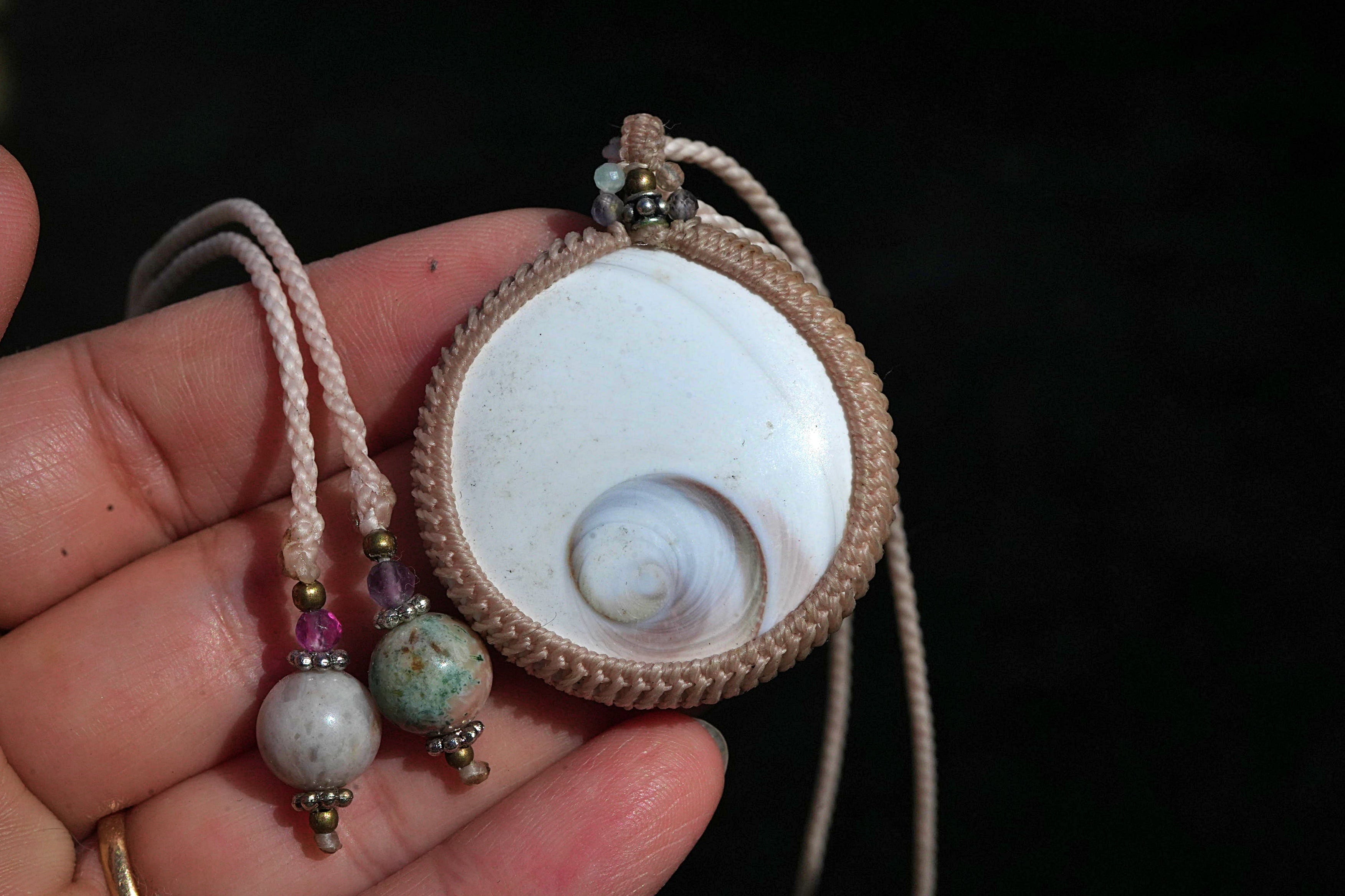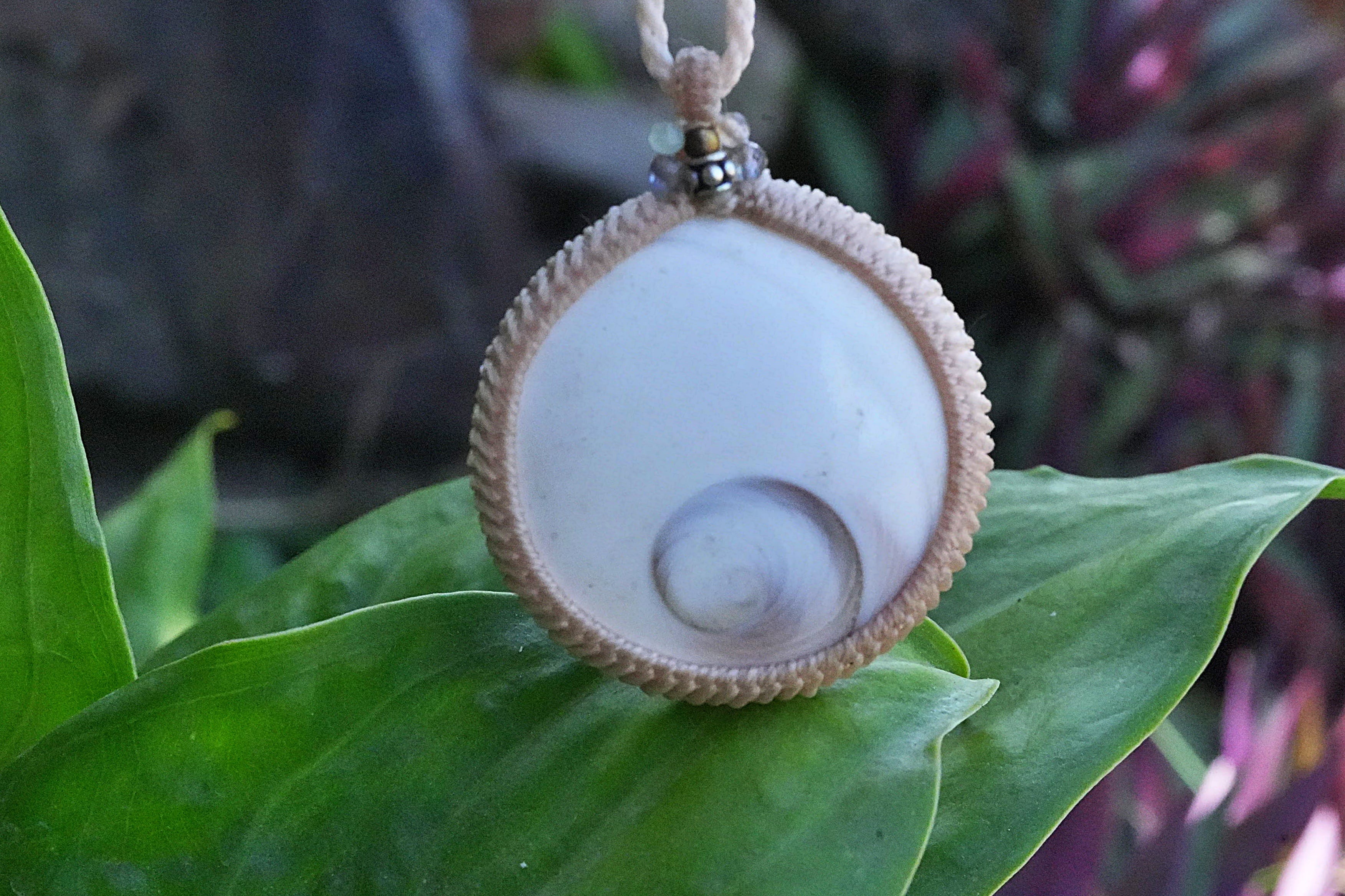 ◆このたびは ナチュラルホワイト・キナリ色の蝋引き糸を使用しマクラメ編み装飾を施しました。