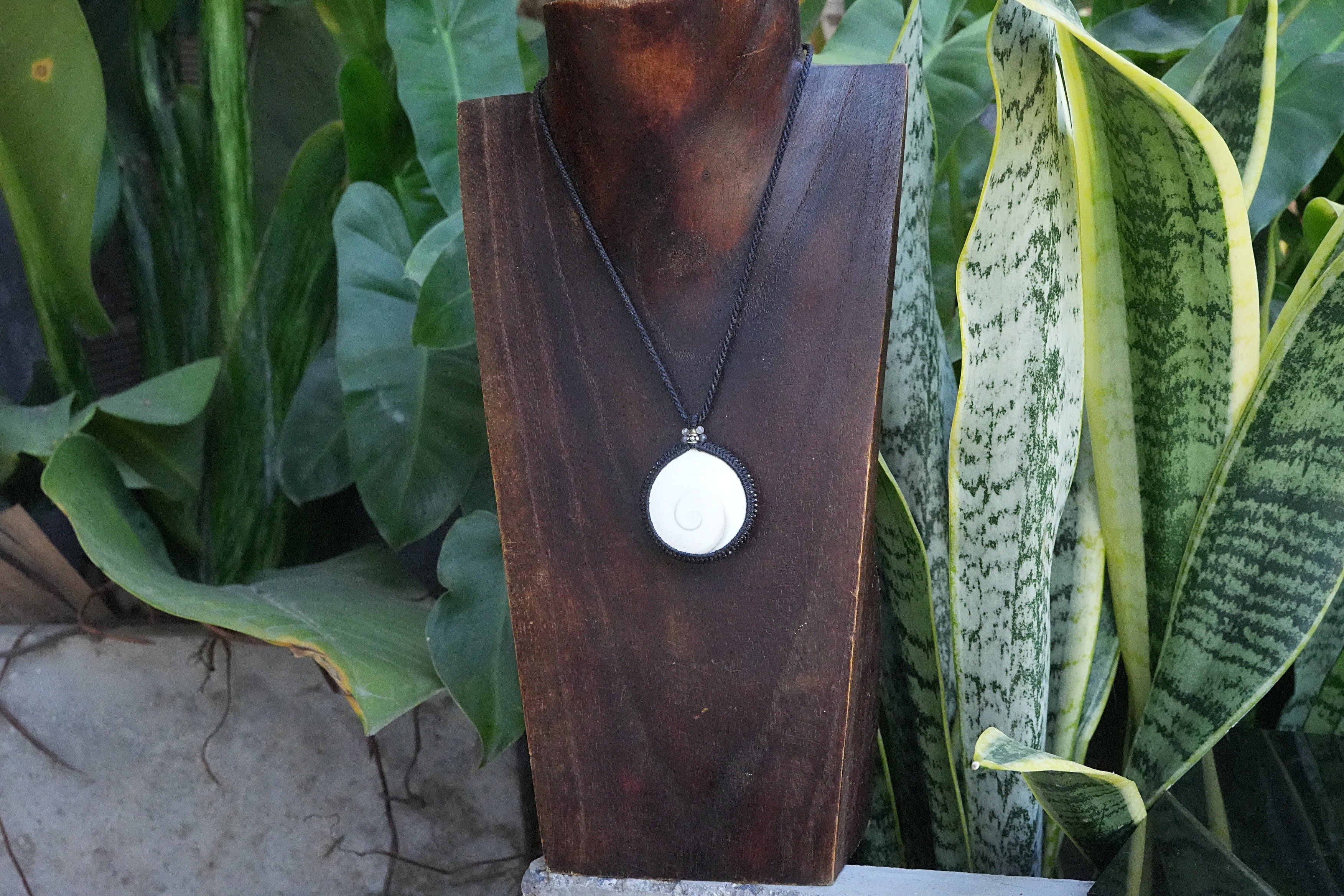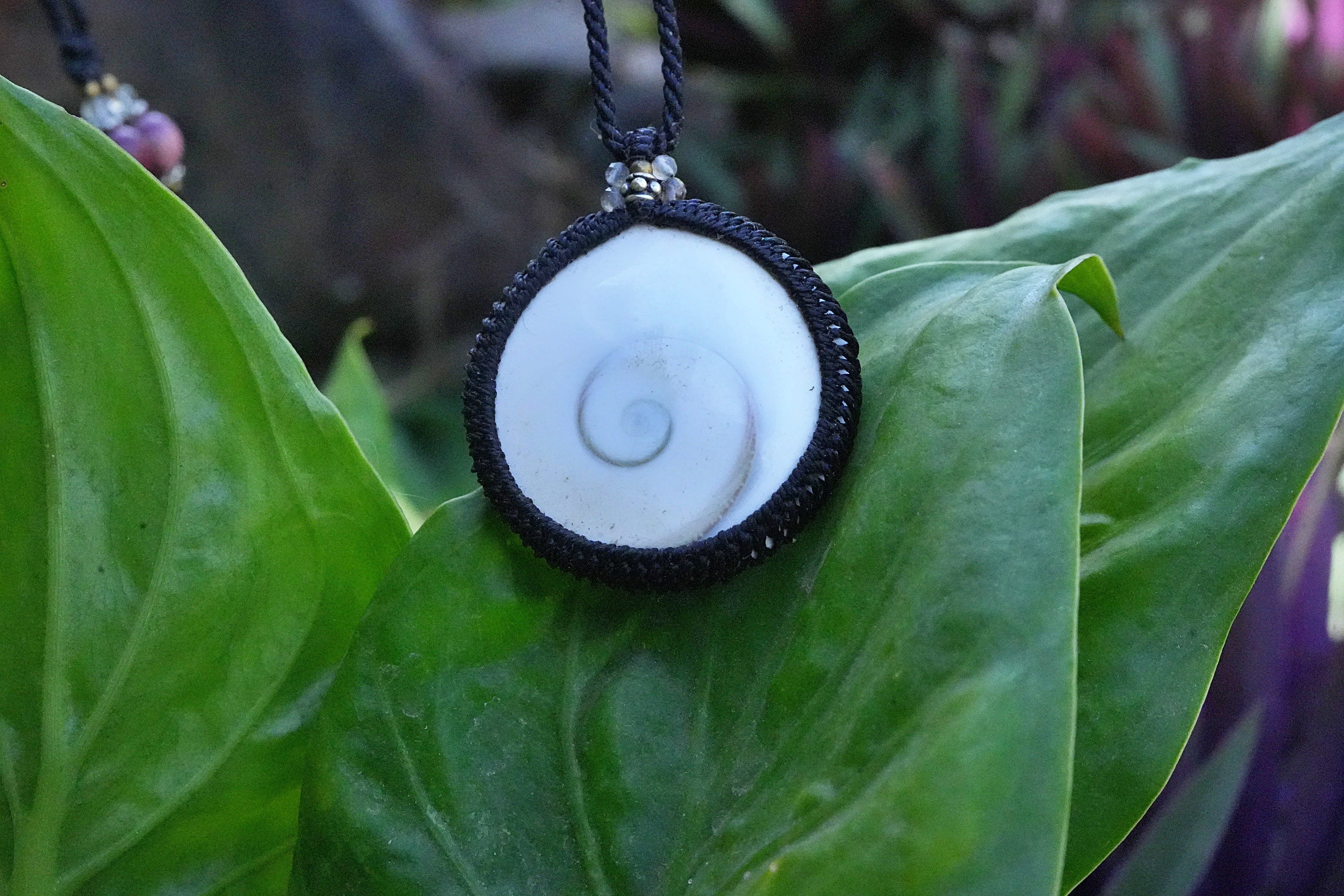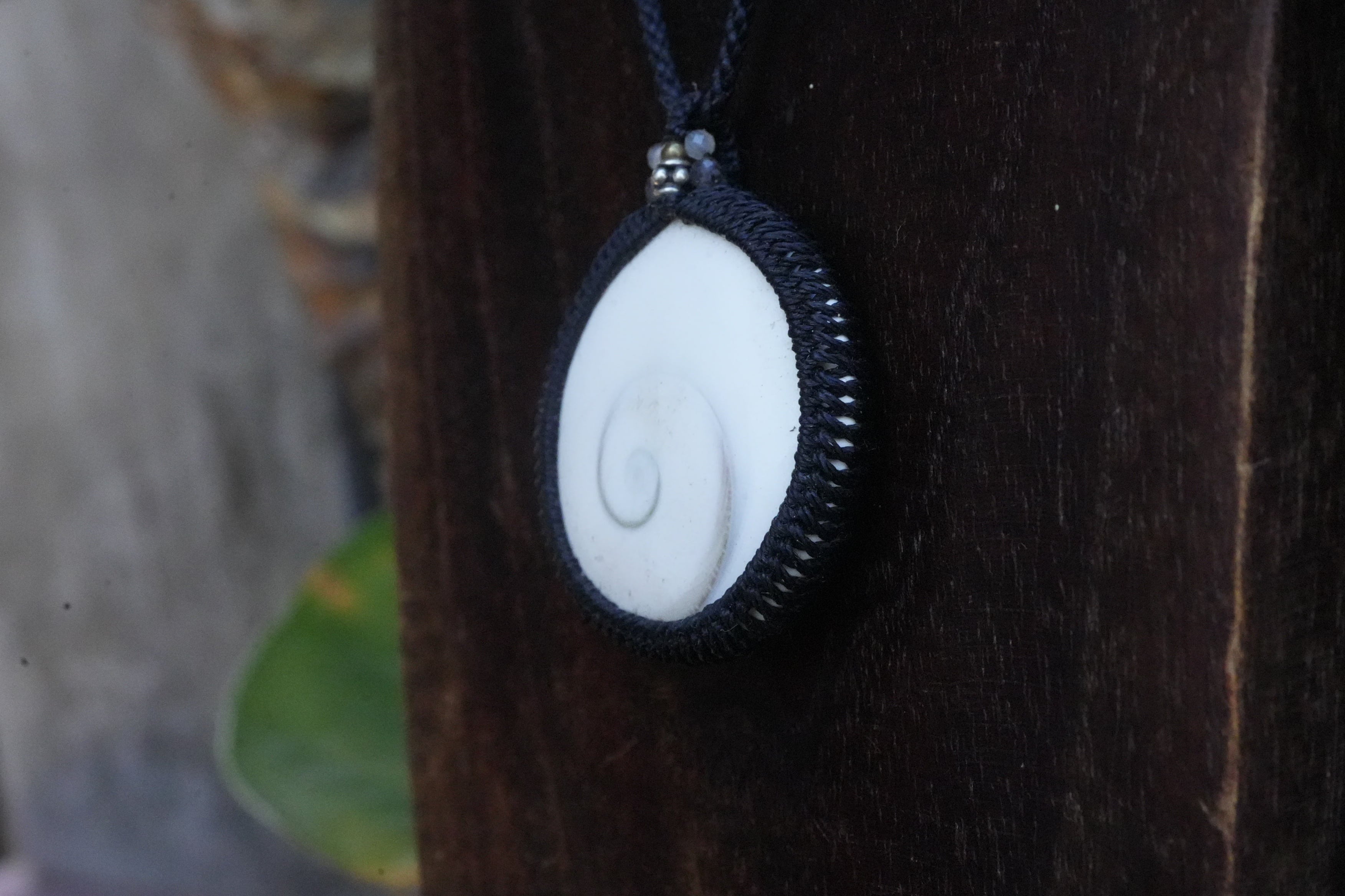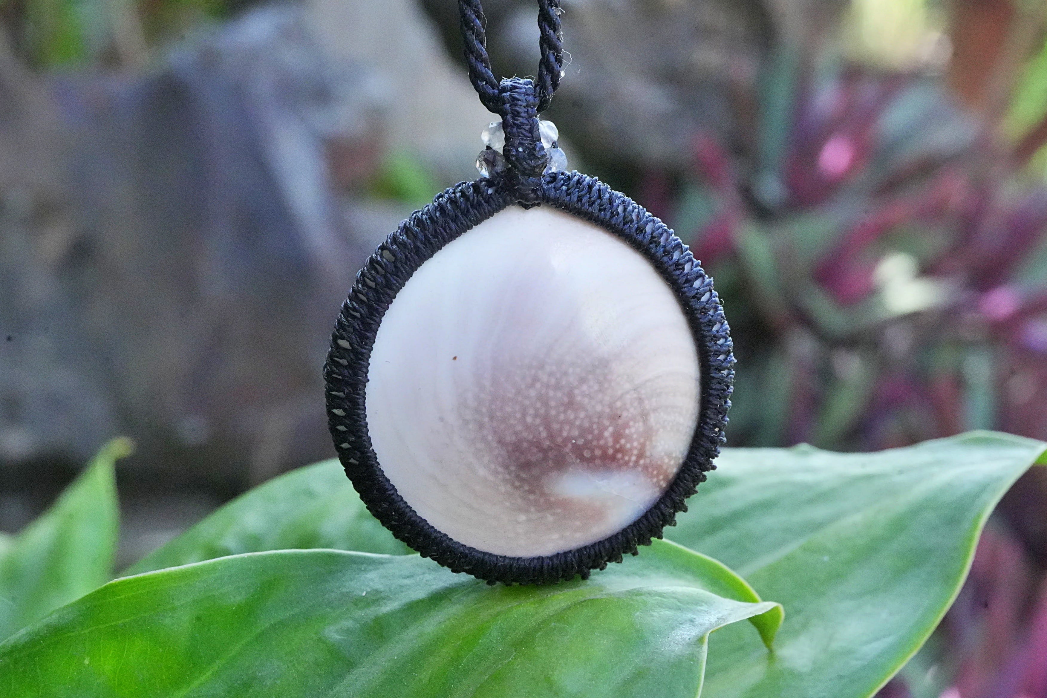 ◆このたびはブラック色の蝋引き糸を使用しマクラメ編み装飾を施しました。