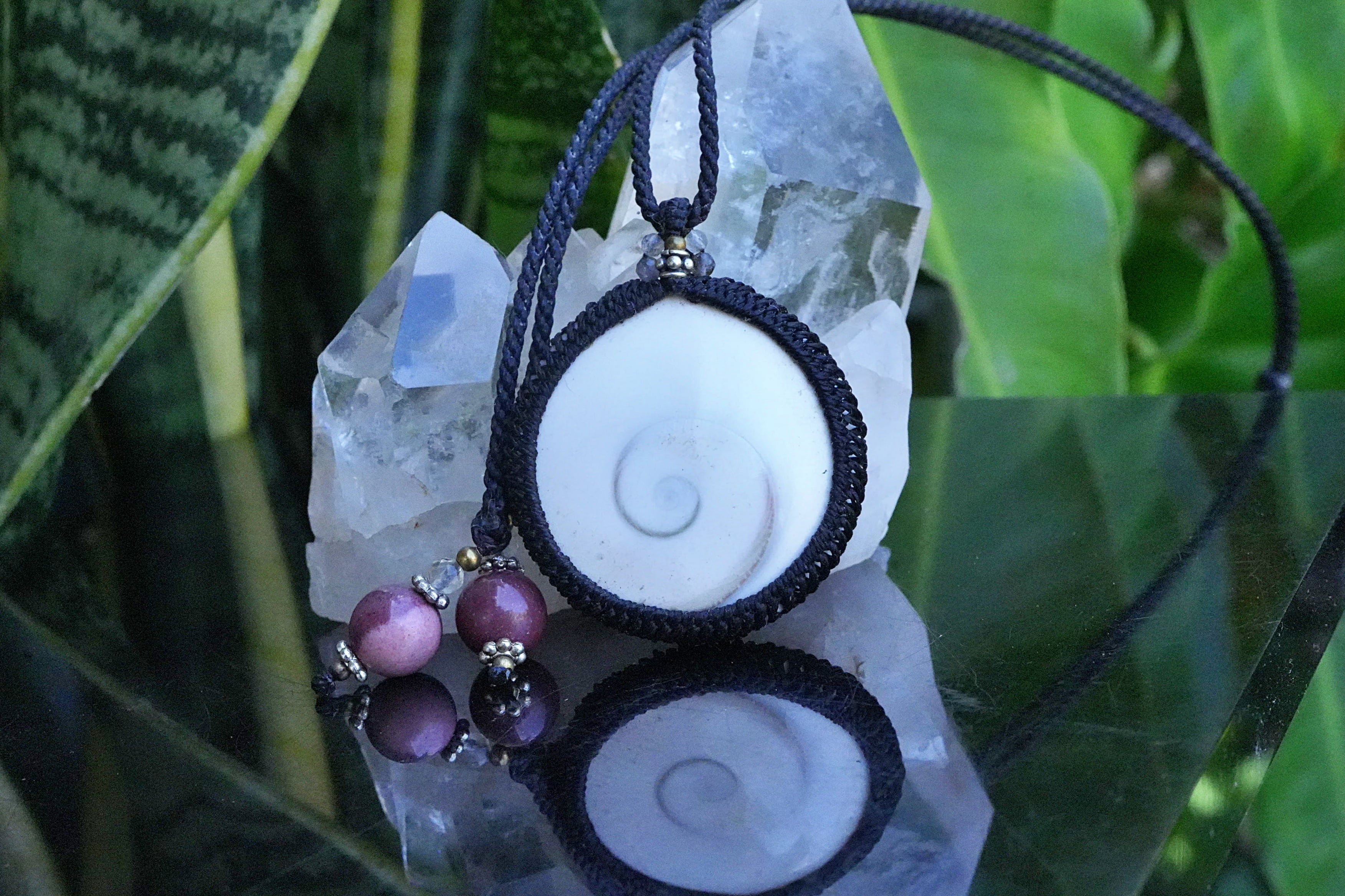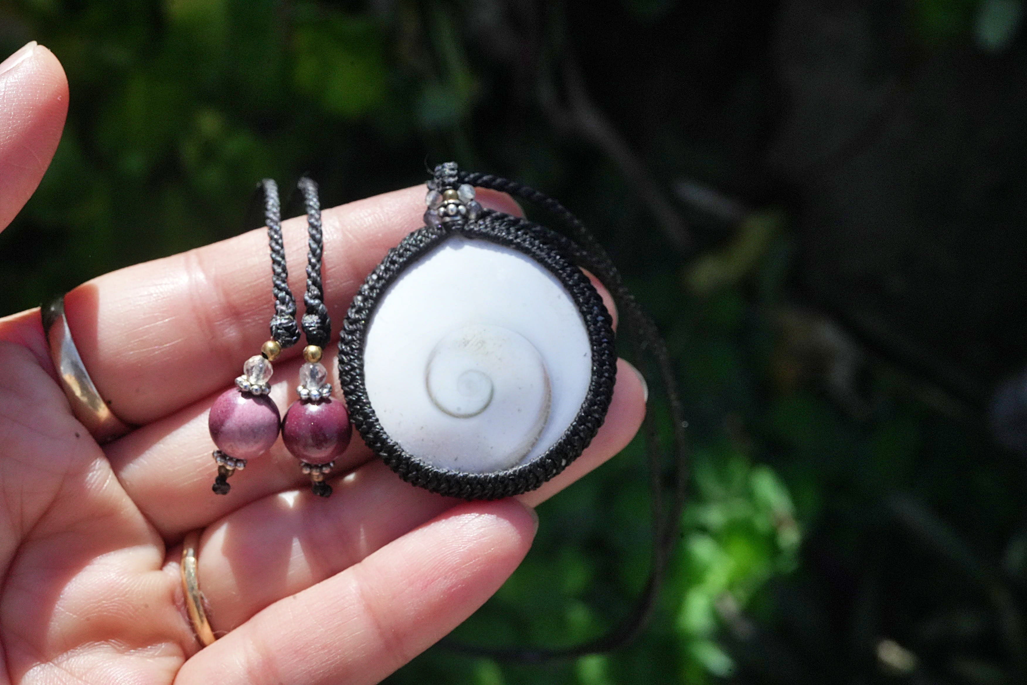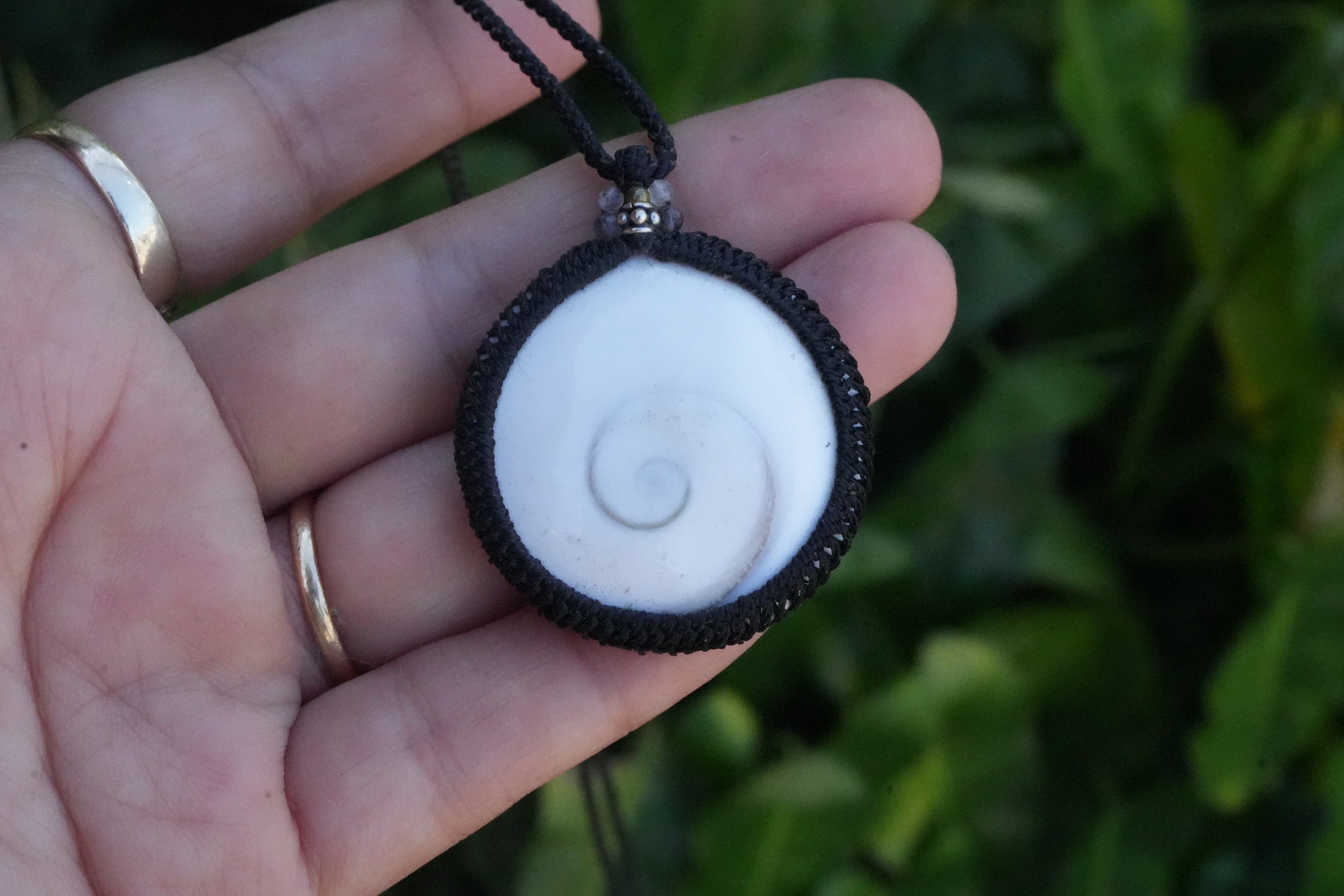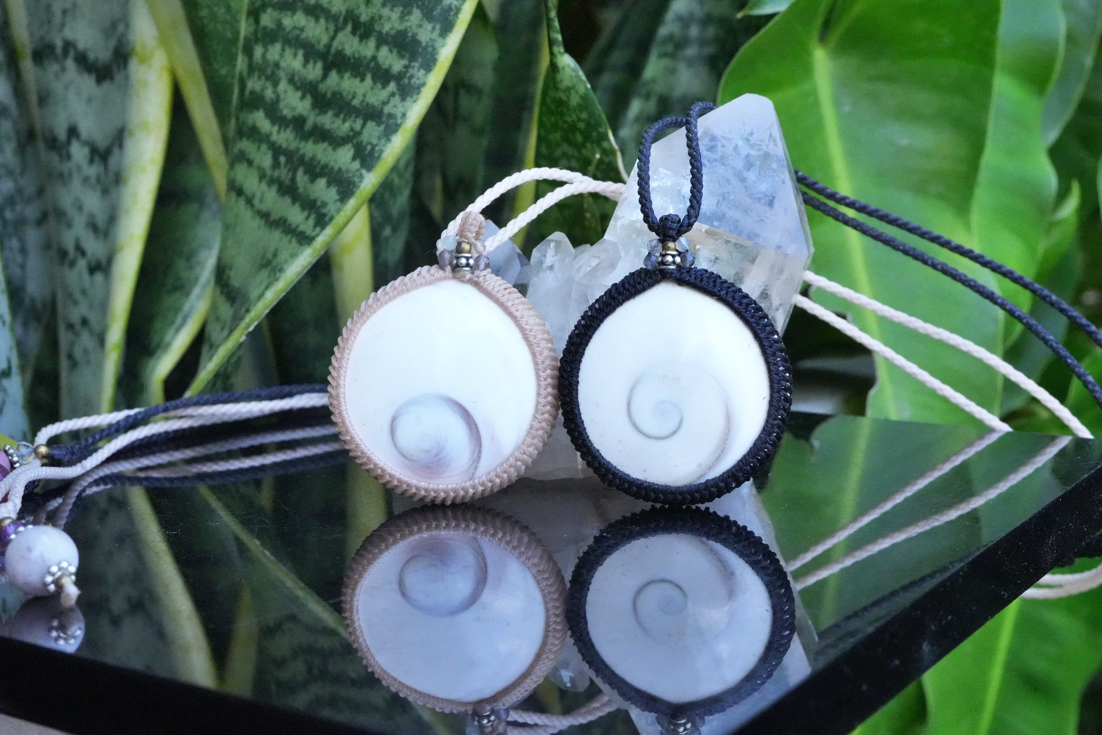 ◆このたびはブラック色の蝋引き糸を使用しマクラメ編み装飾を施しました。