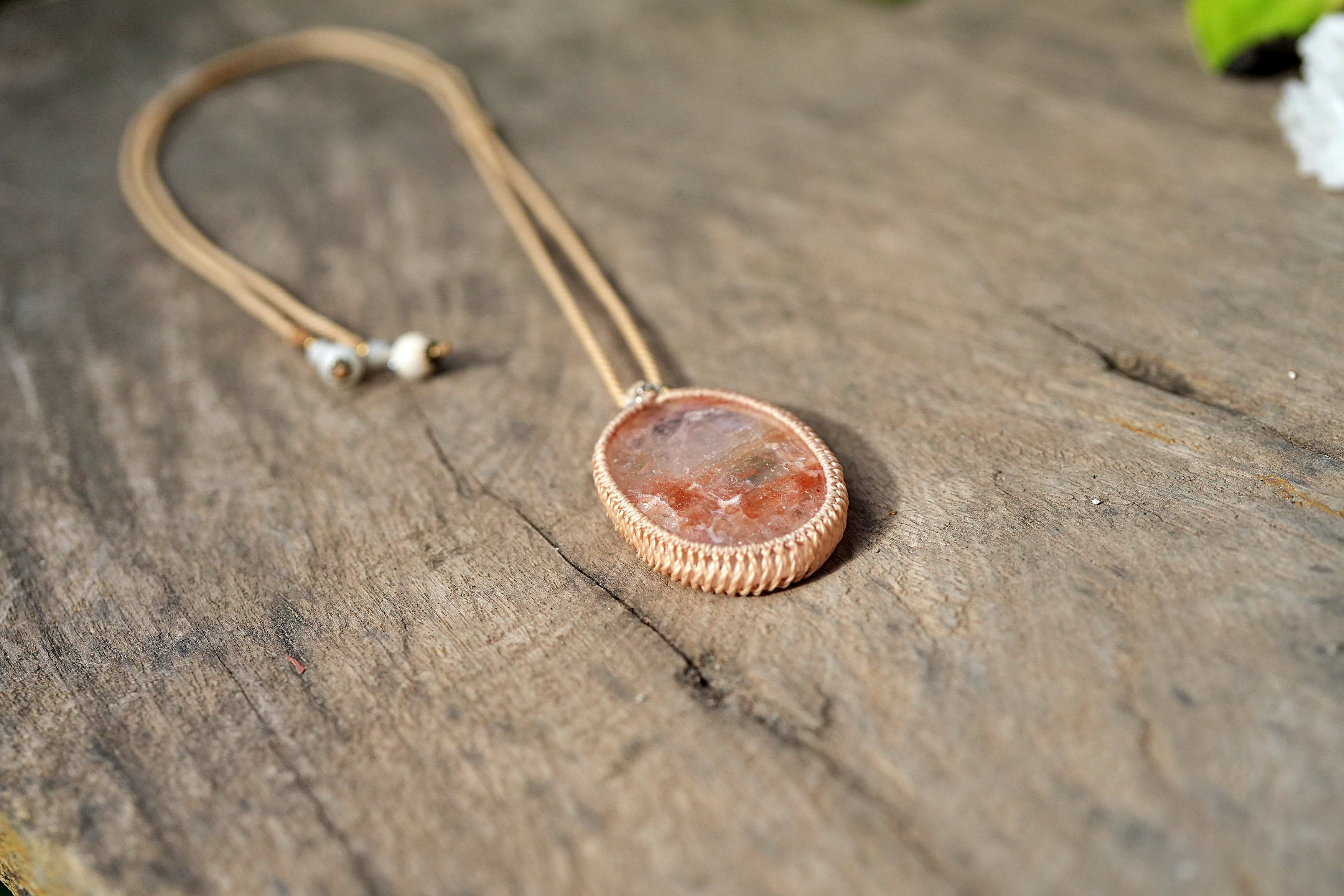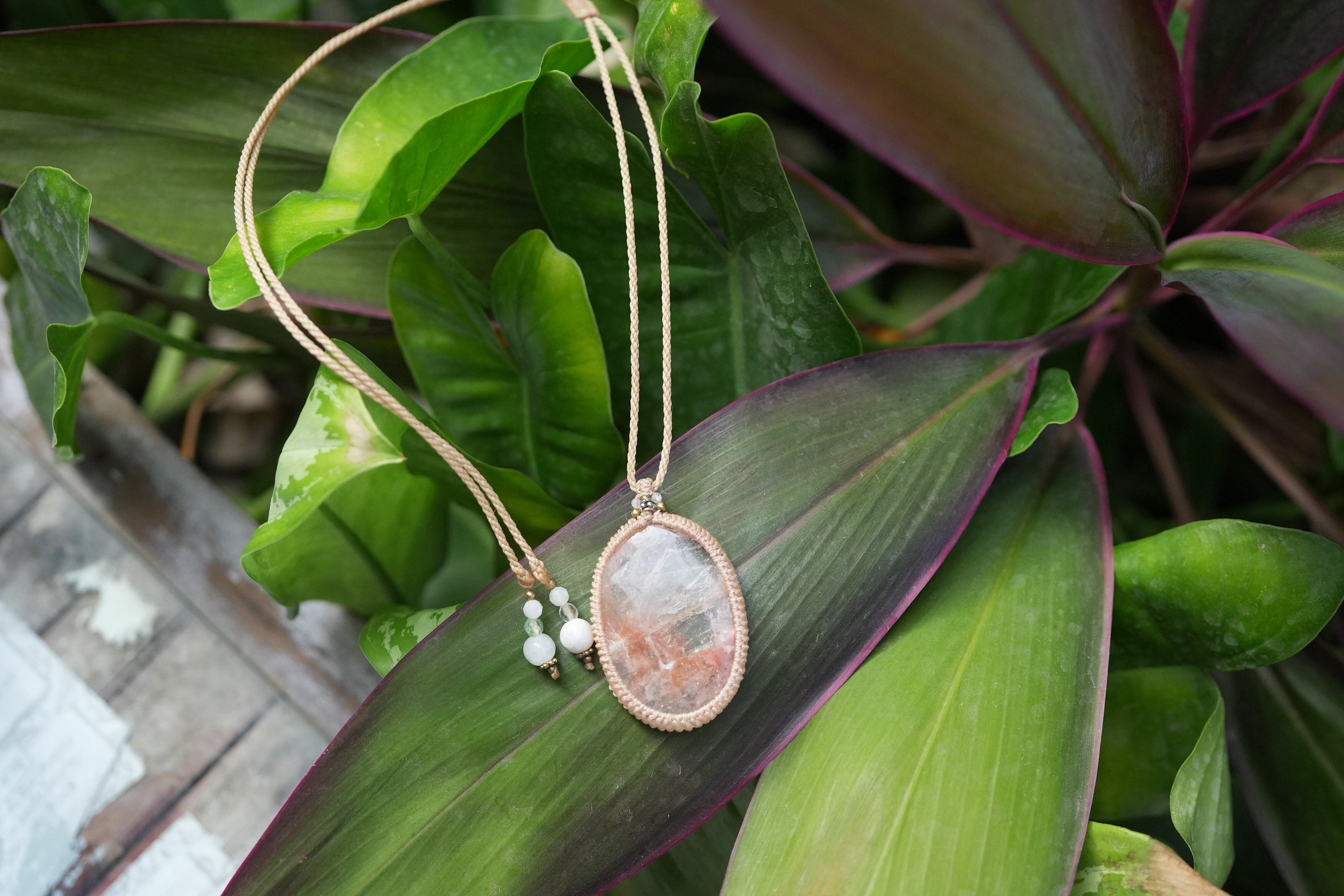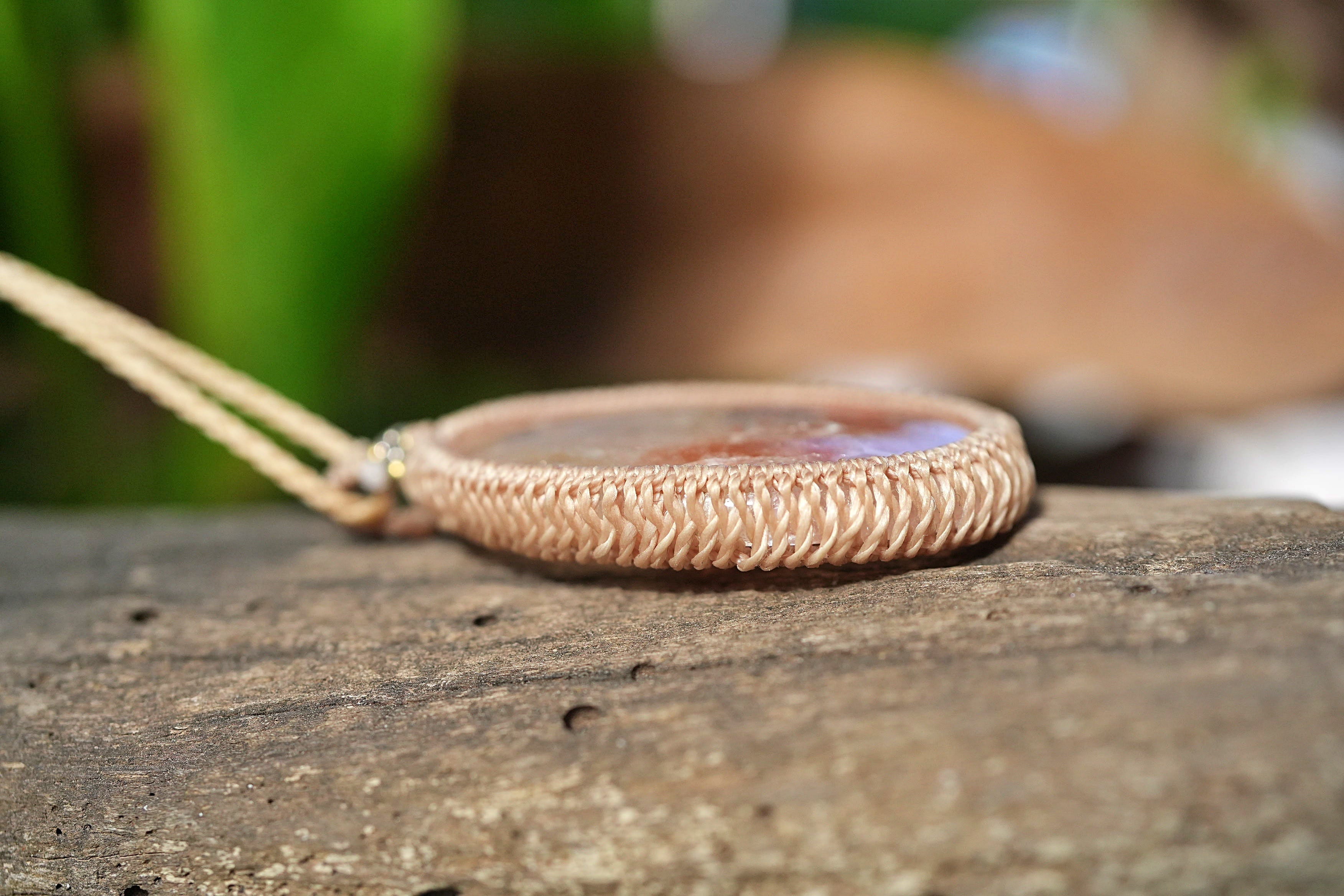 ◆このたびはキャラメル色の蝋引き糸を使用しマクラメ編み装飾を施しました。