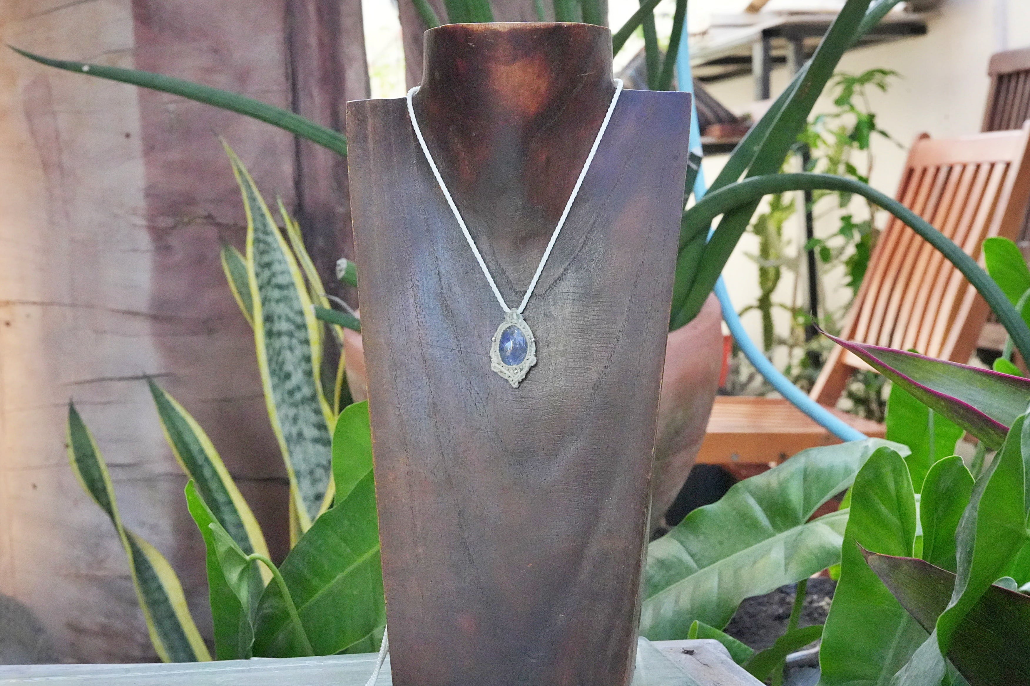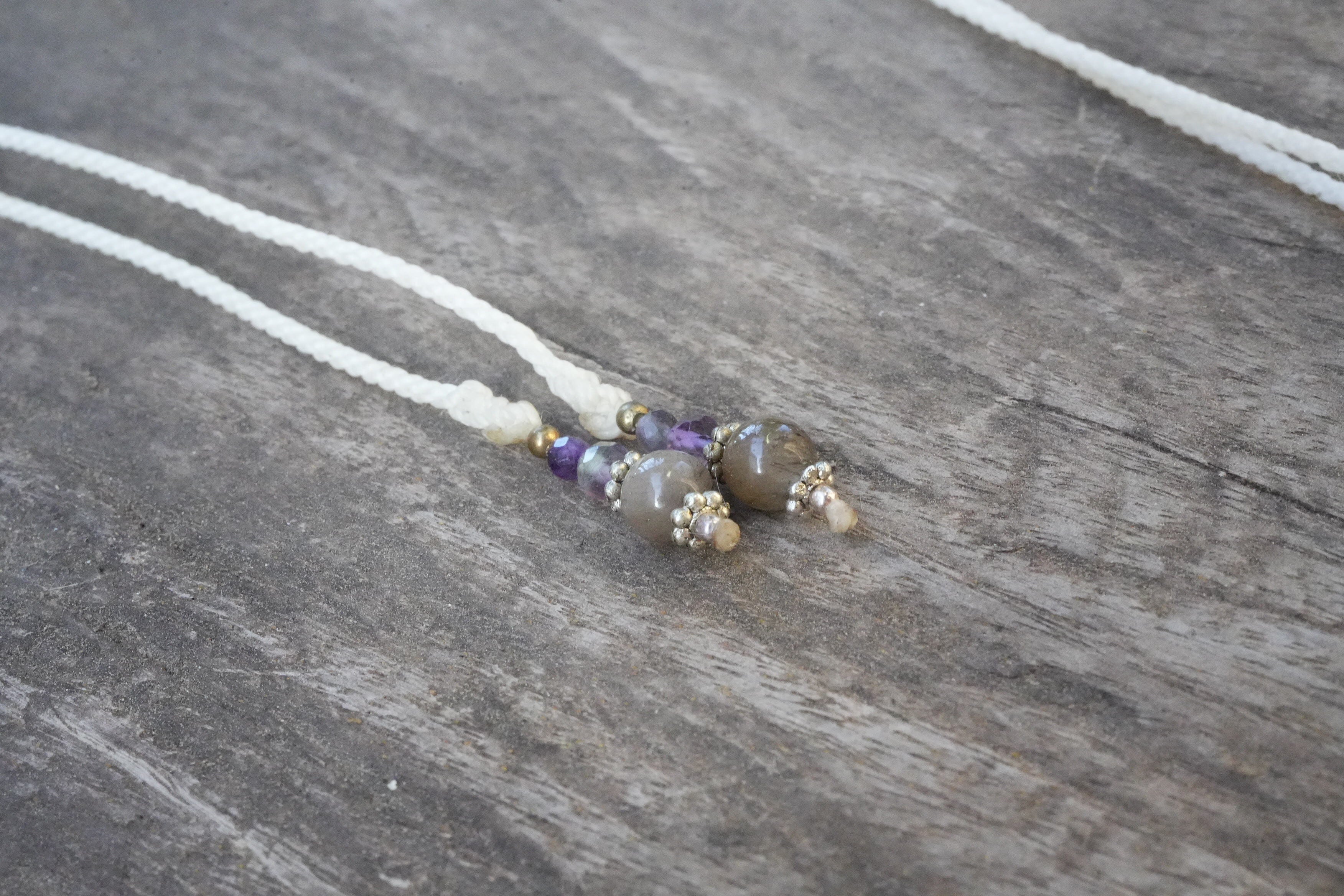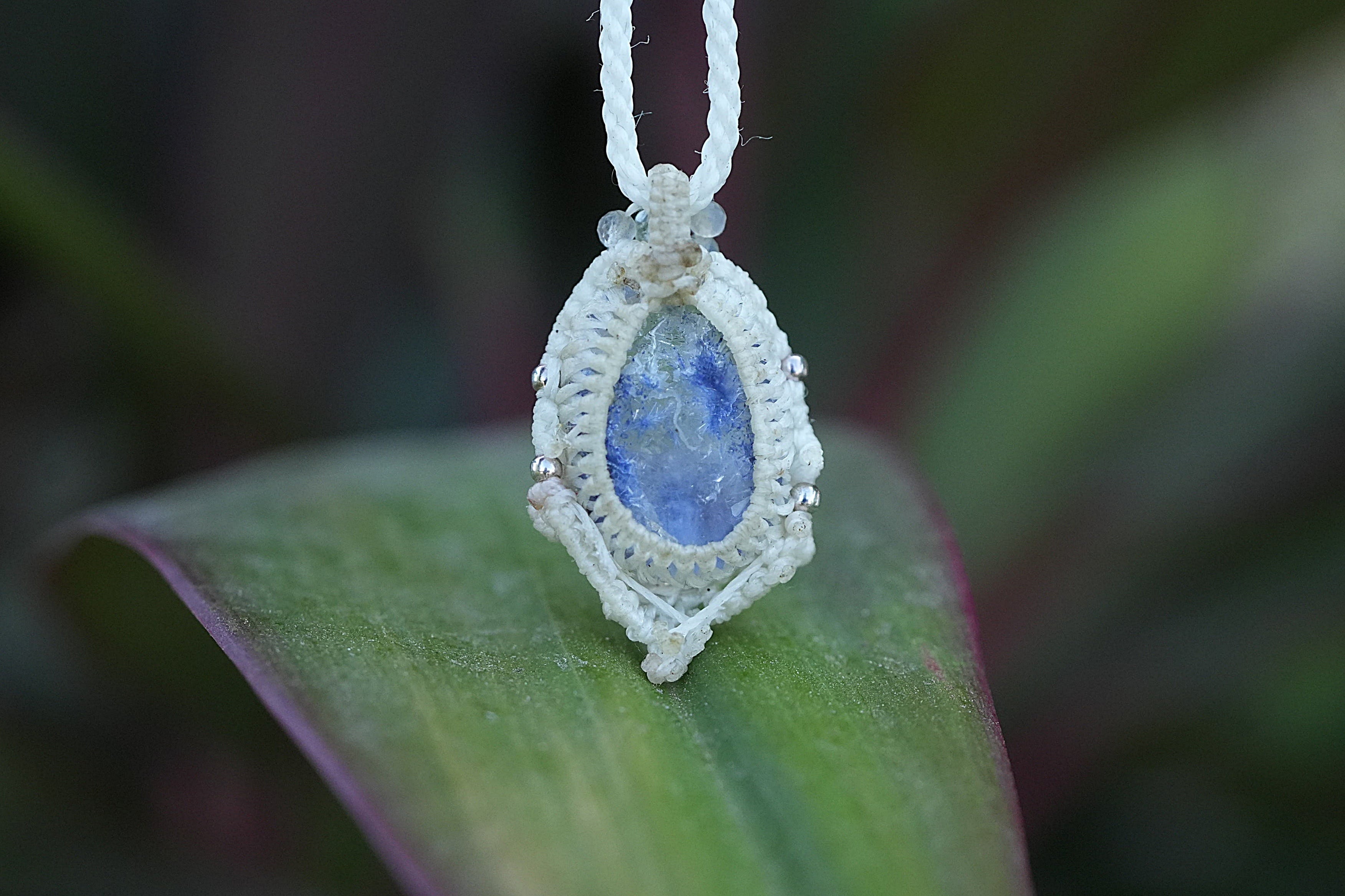 ◆このたびはホワイト色の蝋引き糸を使用しマクラメ編み装飾を施しました。