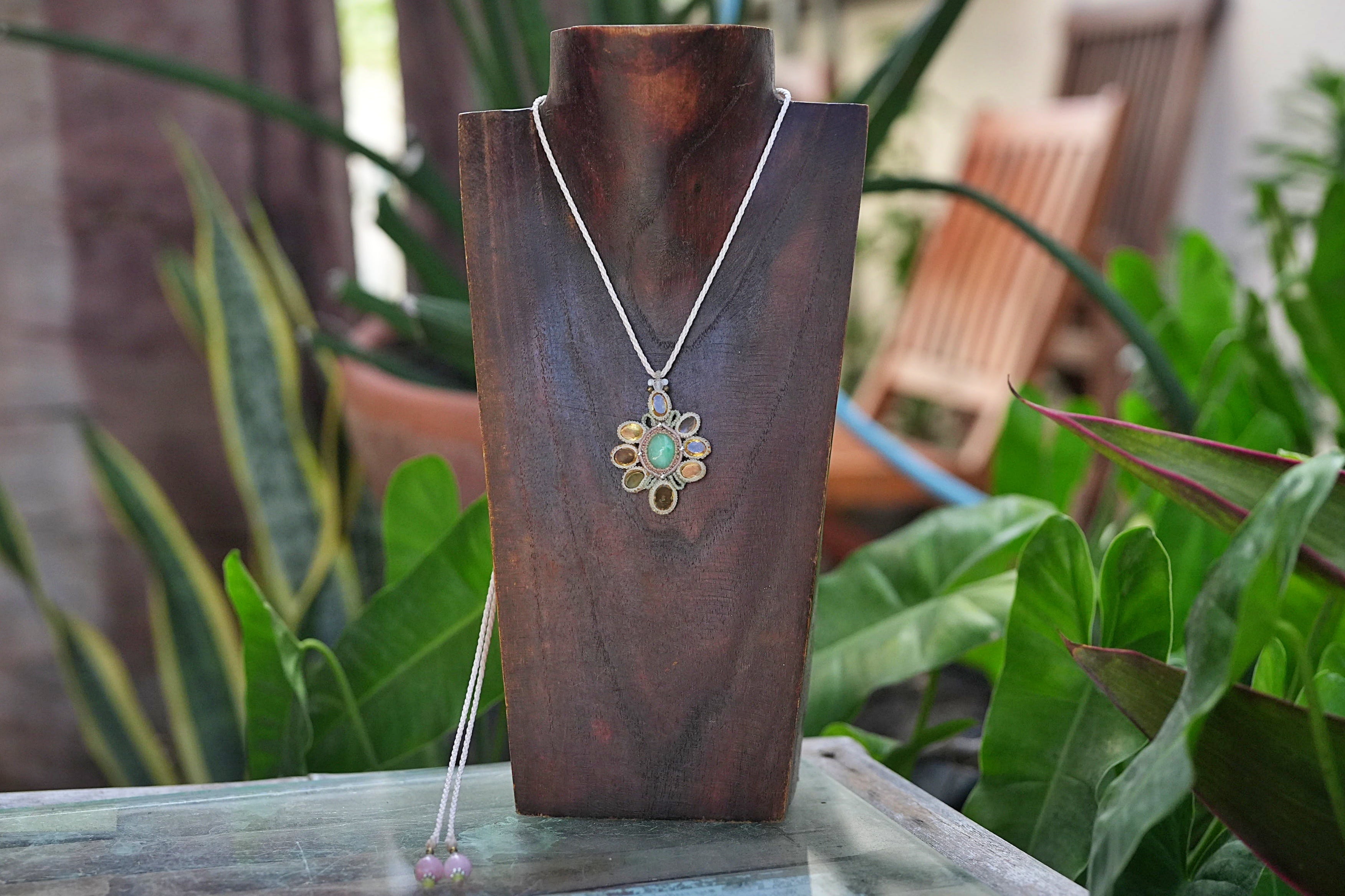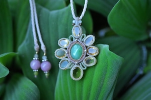 ◆このたびは首紐部分にナチュラルホワイト、ミント色の蝋引き糸を使用しマクラメ編み装飾を施しました。