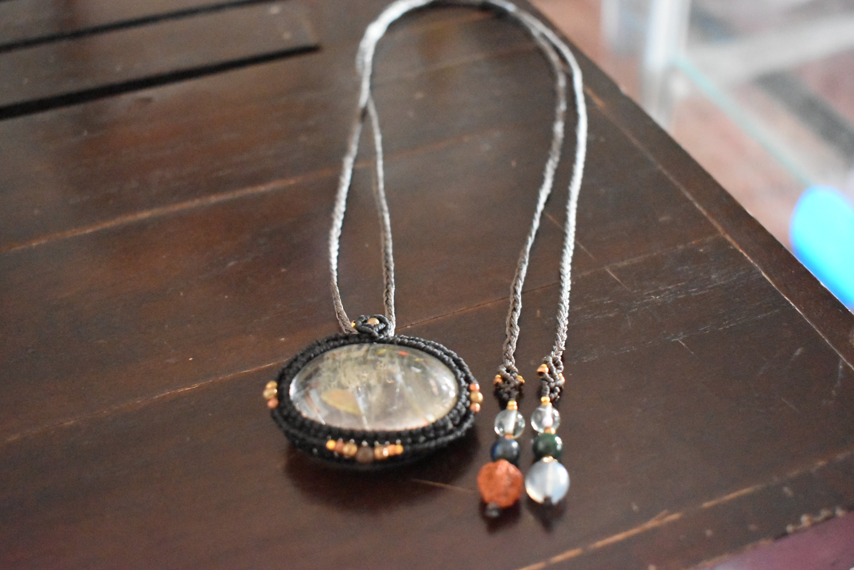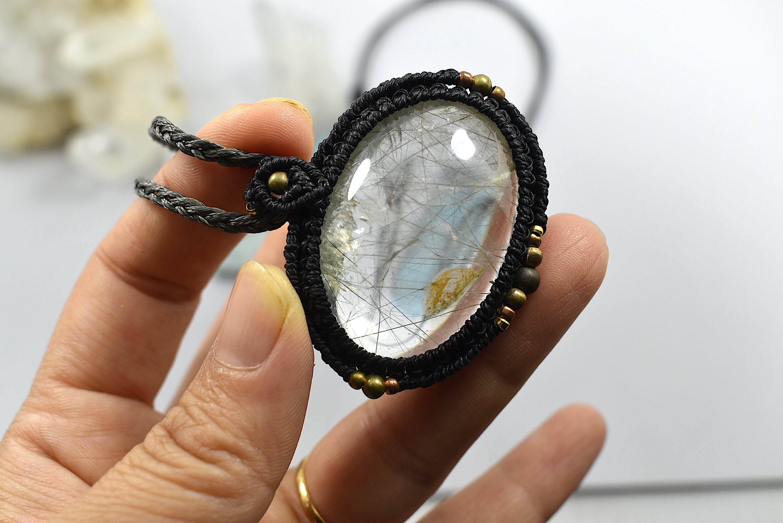◆このたびはブラック、ダブグレイ色の蝋引き糸を使用しマクラメ編み装飾を施しました。