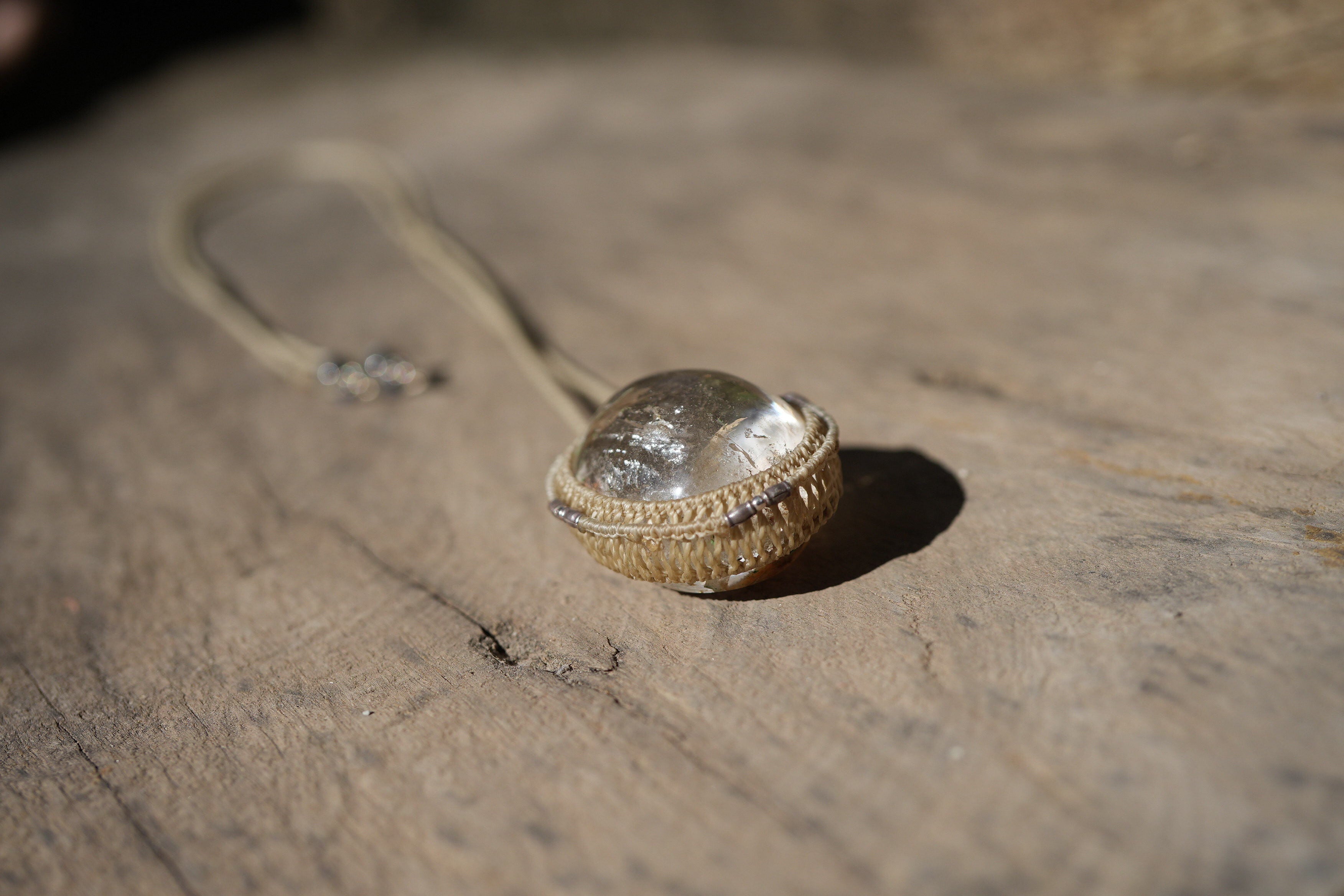 ◆このたびはキャラメル・キナリ色の蝋引き糸を使用しマクラメ編み装飾を施しました。