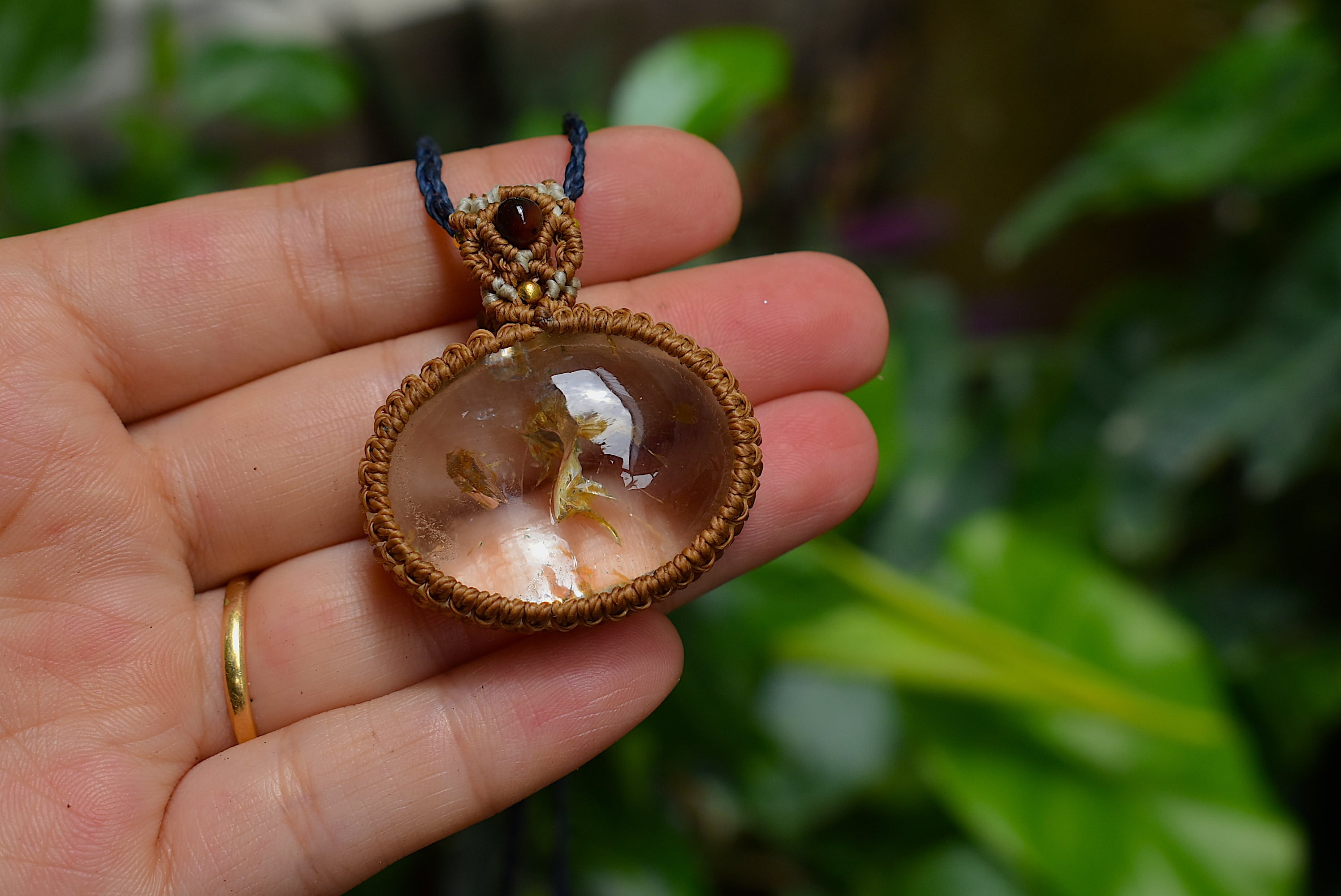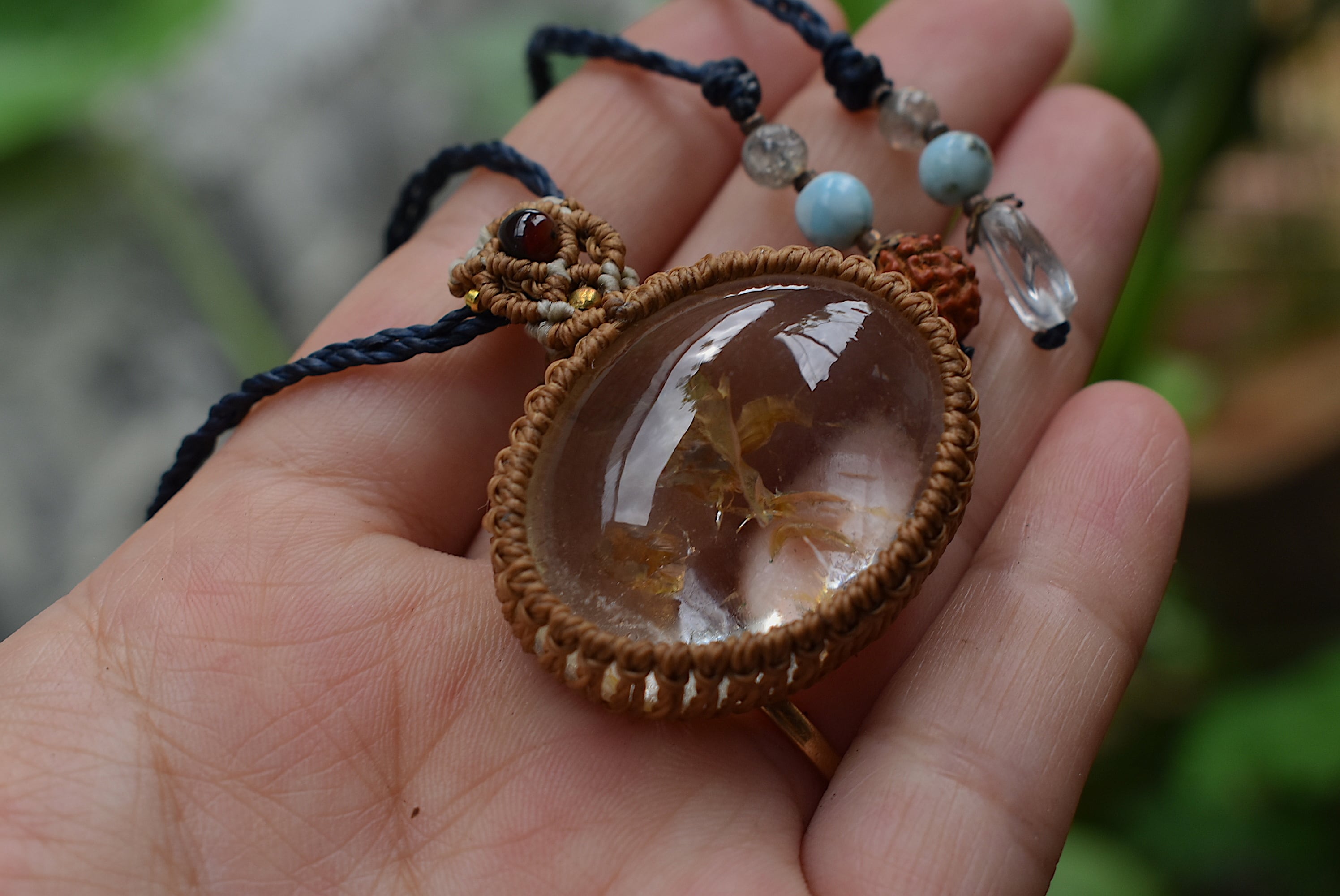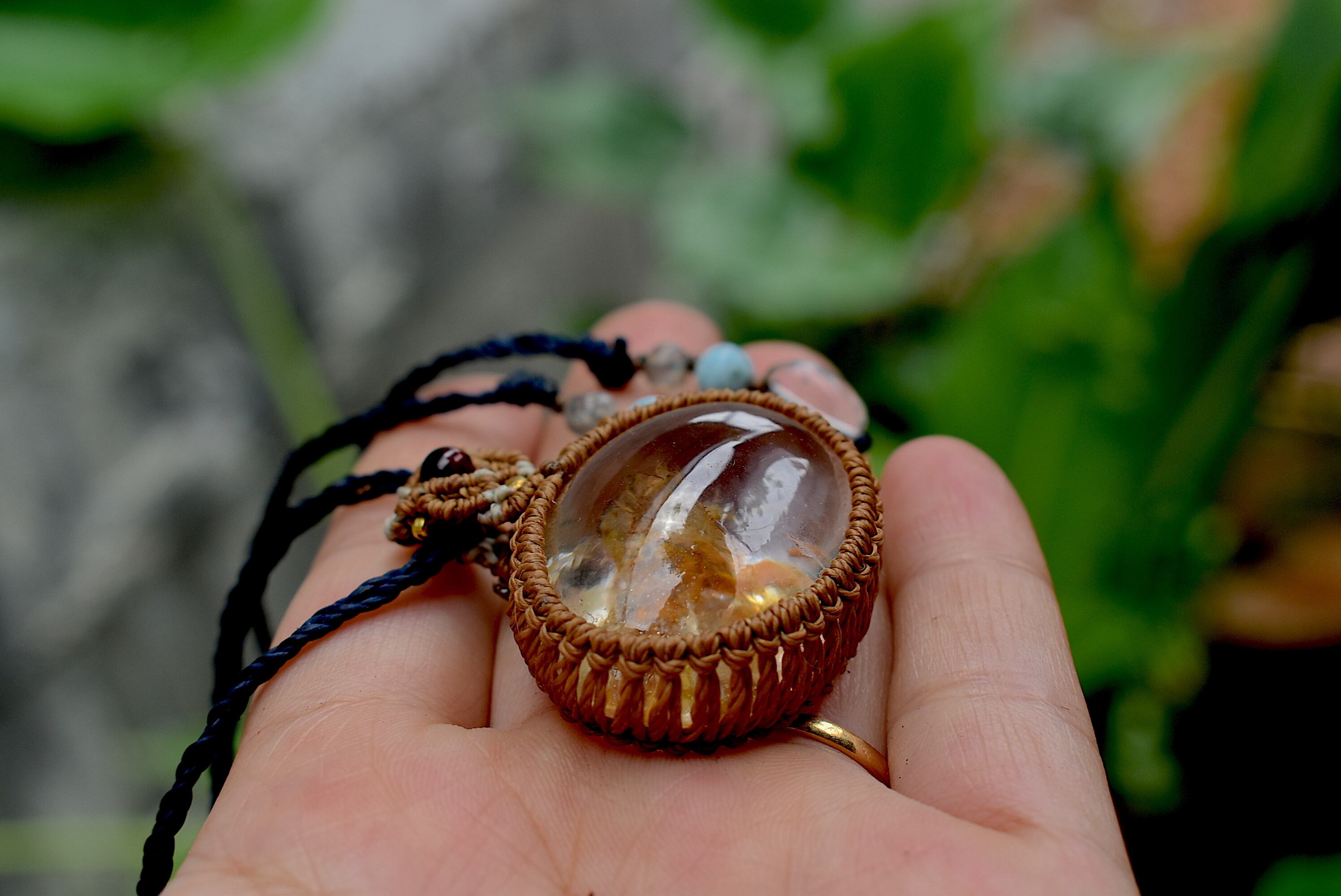 ゴールドカラーのルチルとも見てとれる内包物が透明感溢れる水晶の中にそびえているガーデンクォーツ のひとつをシンプルにマクラメ編み装飾を施しペンダントに仕上げました。