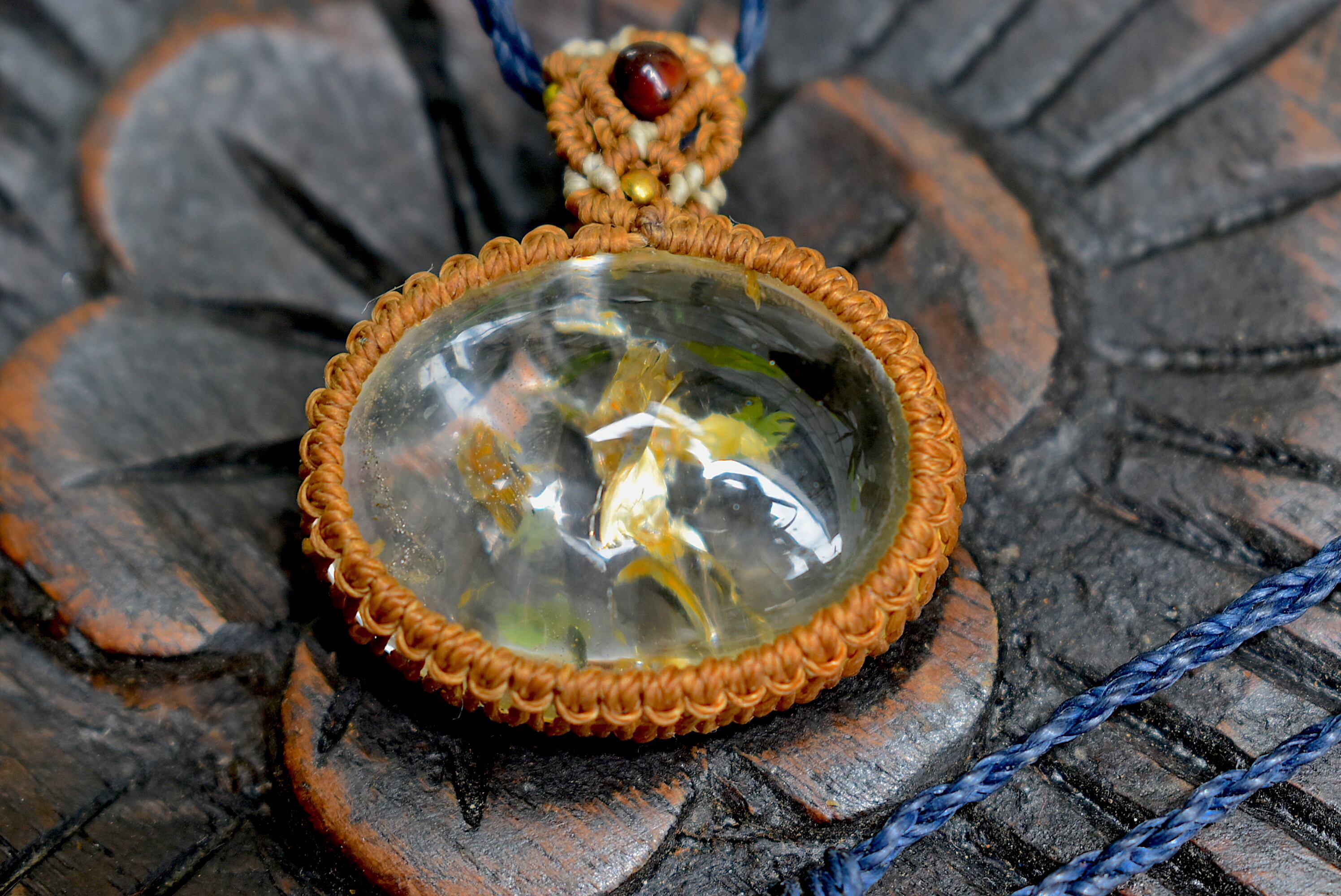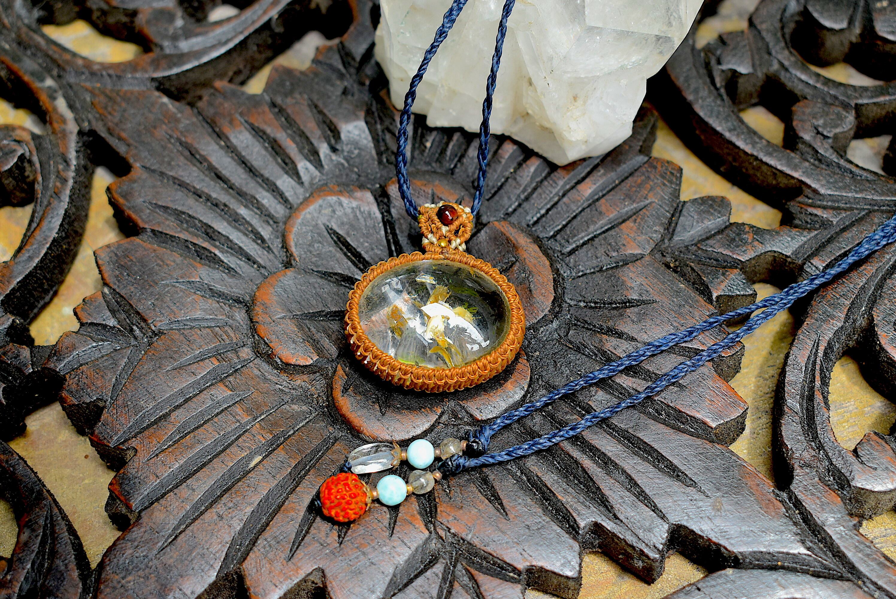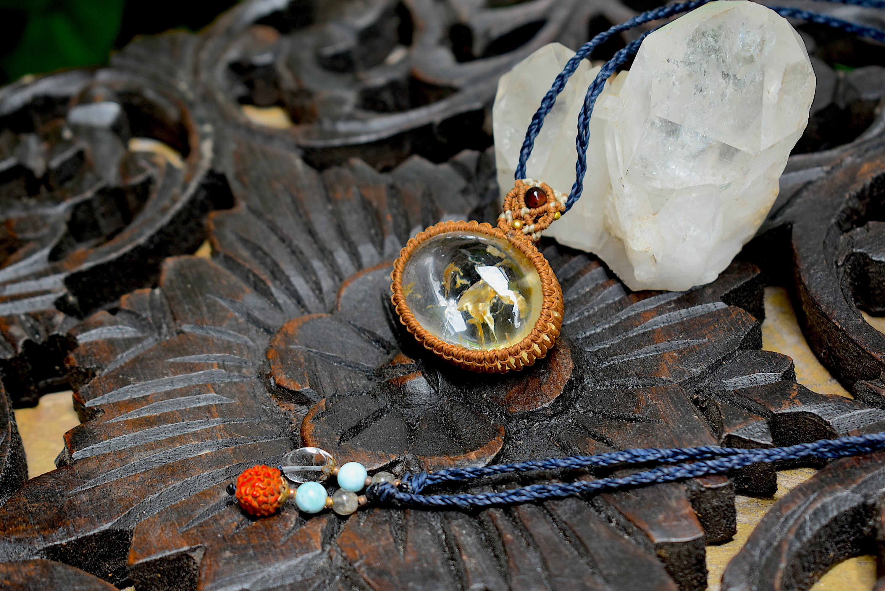 ゴールドカラーのルチルとも見てとれる内包物が透明感溢れる水晶の中にそびえているガーデンクォーツ のひとつをシンプルにマクラメ編み装飾を施しペンダントに仕上げました。