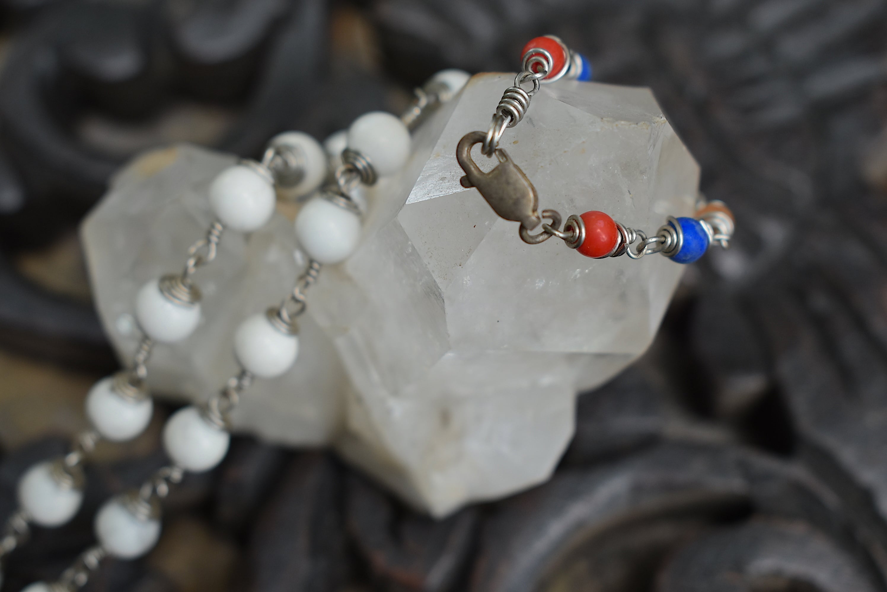 アクセントにオレンジカルサイト、レッドコーラル、ラピスラズリビーズを結びつけました。