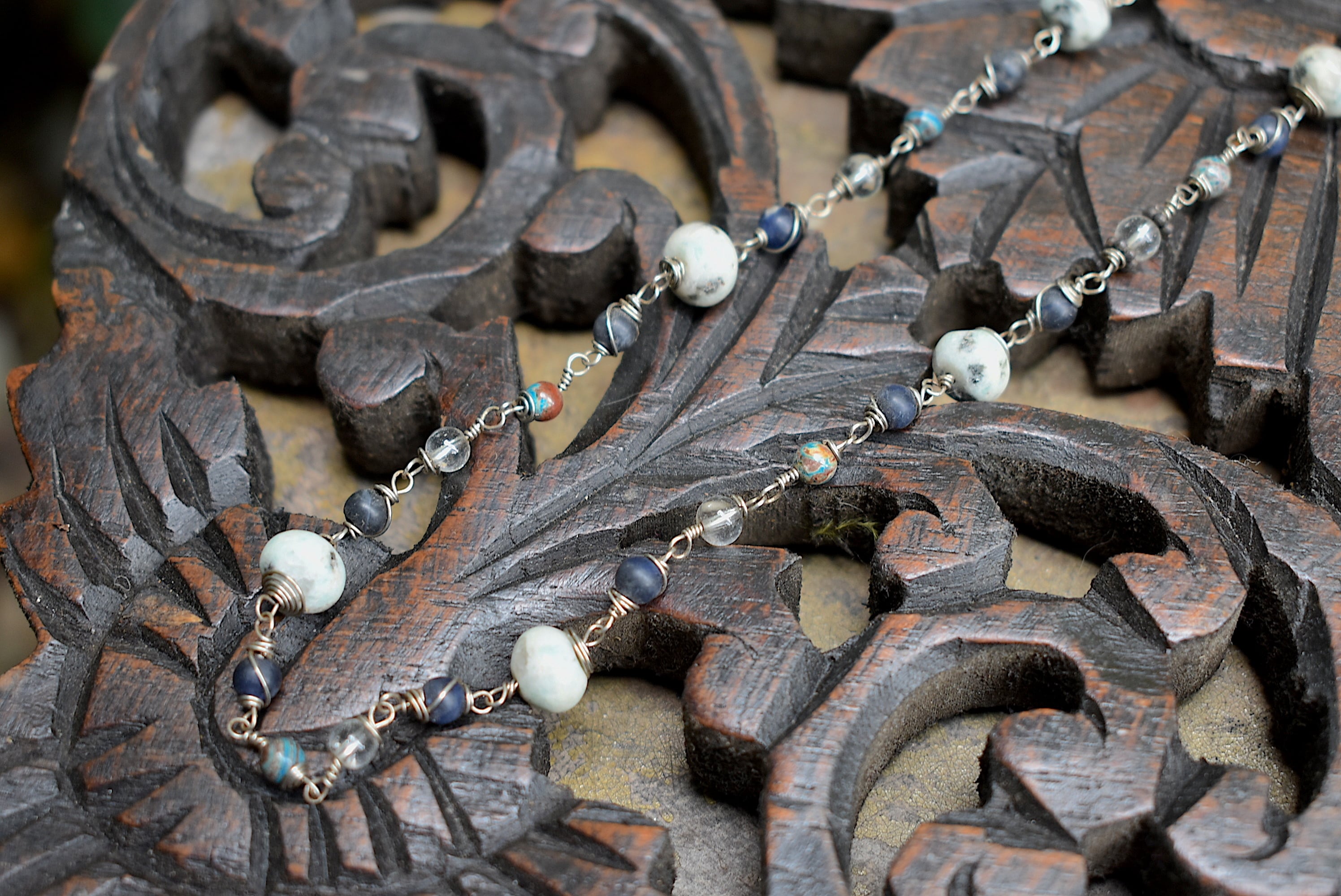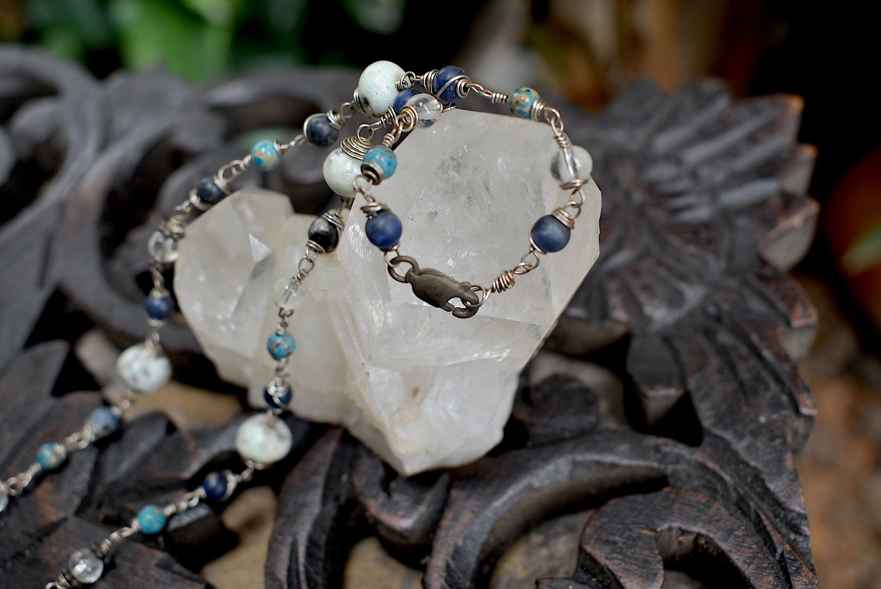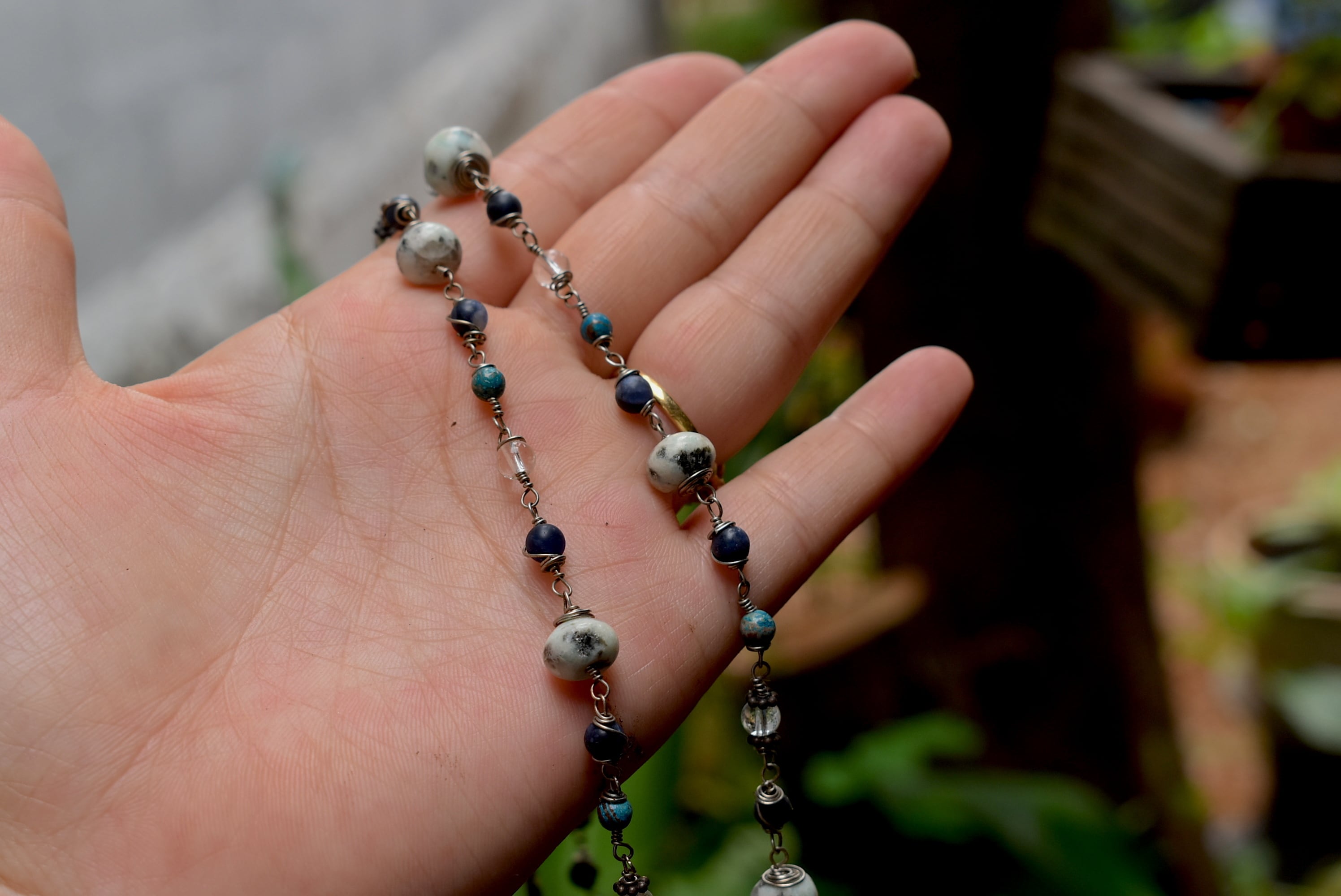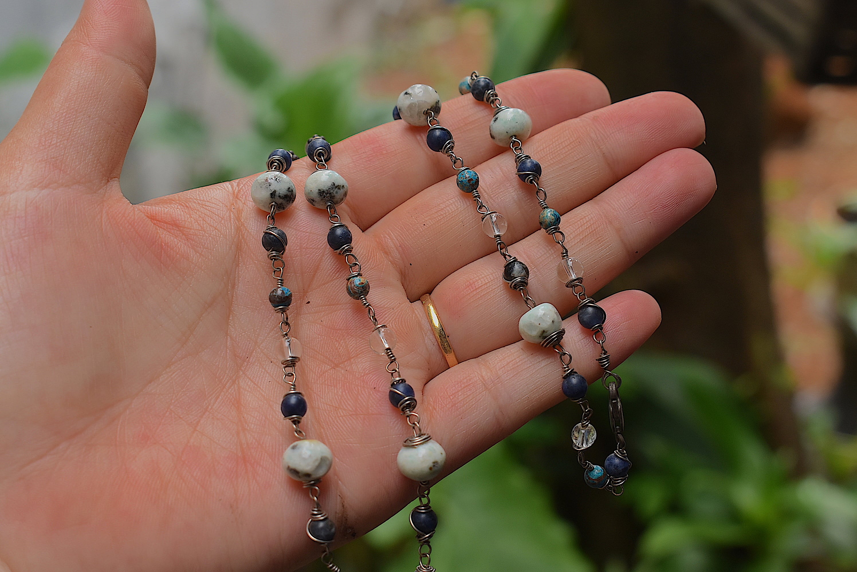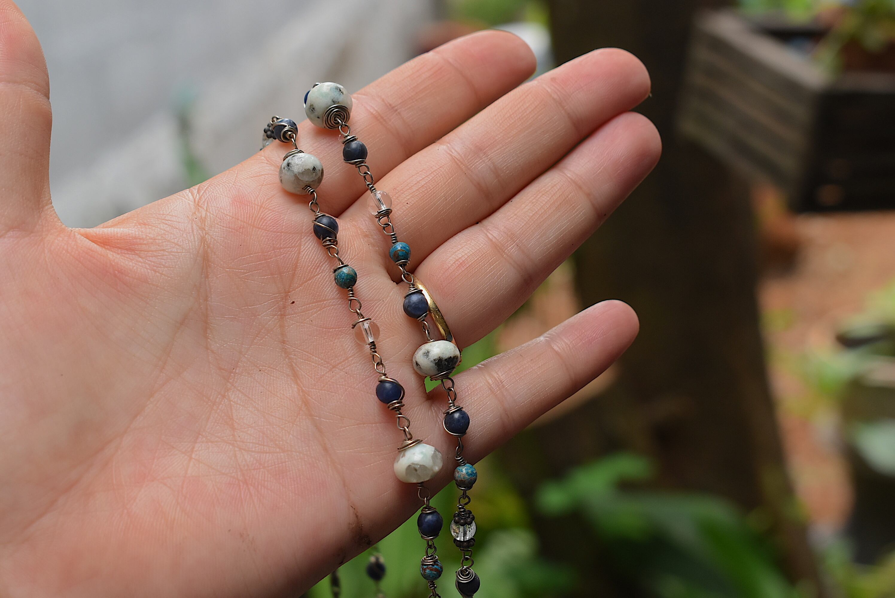水晶混合物となった大粒翡翠とラピスラズリ、クソソコラビーズをワイヤーで結びつけてネックレスに仕上げました。