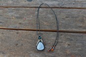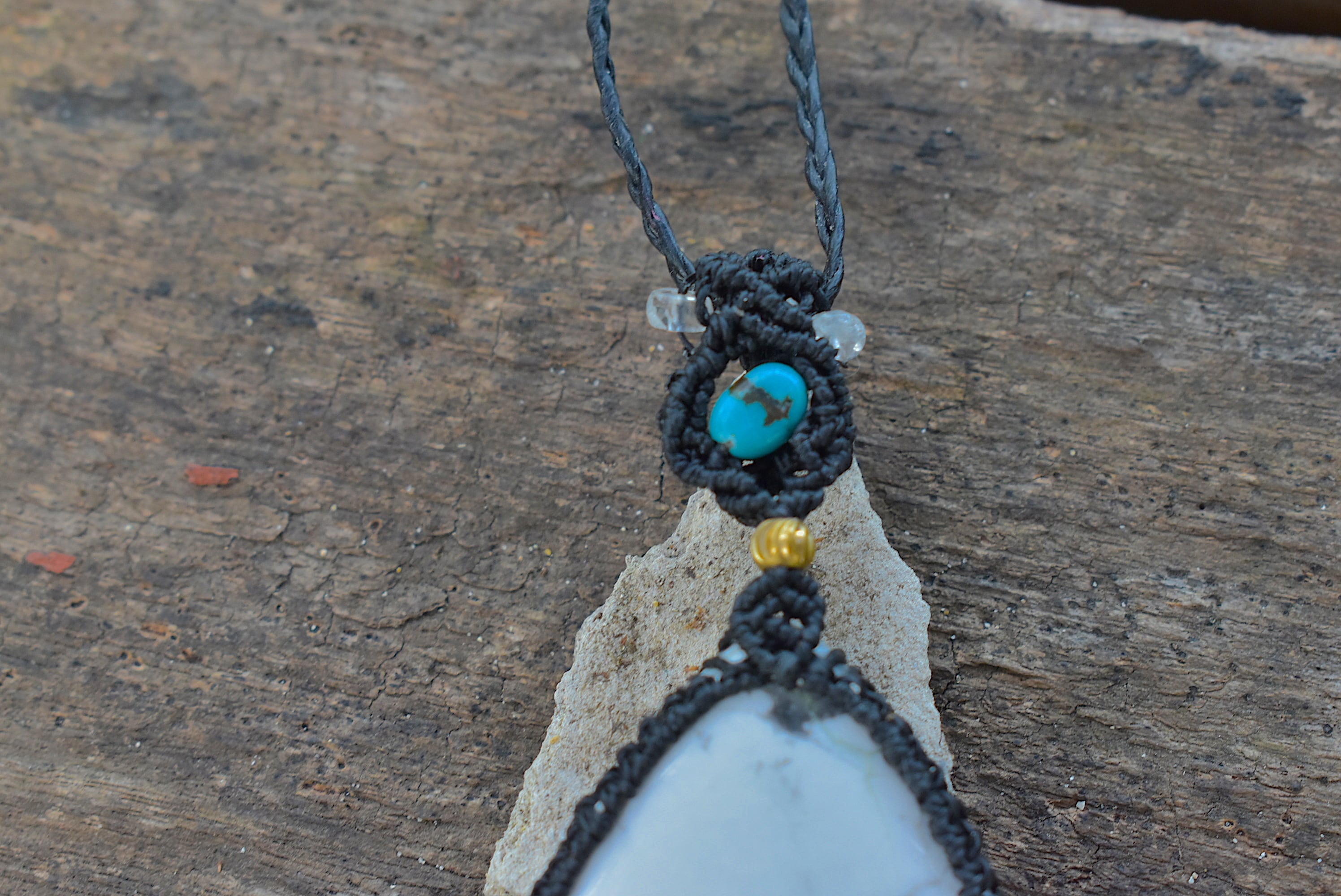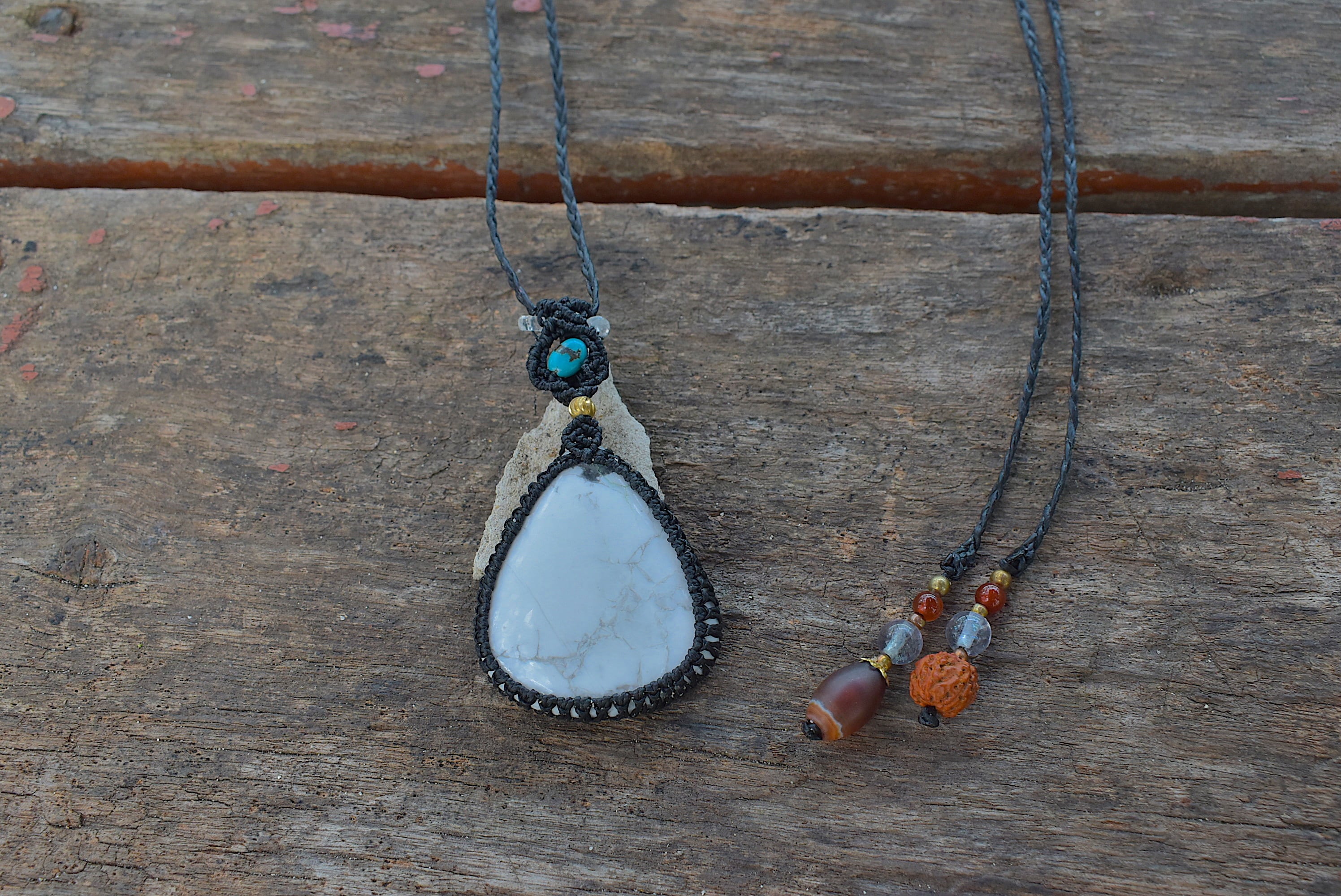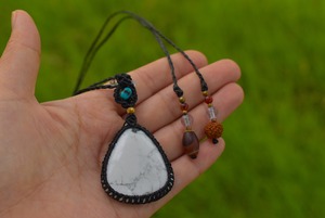 白い石ハウライトとグリーンが愛らしいターコイズビーズを組み合わせたペンダントをシンプルクラシックにマクラメ編み装飾を施し仕上げました。