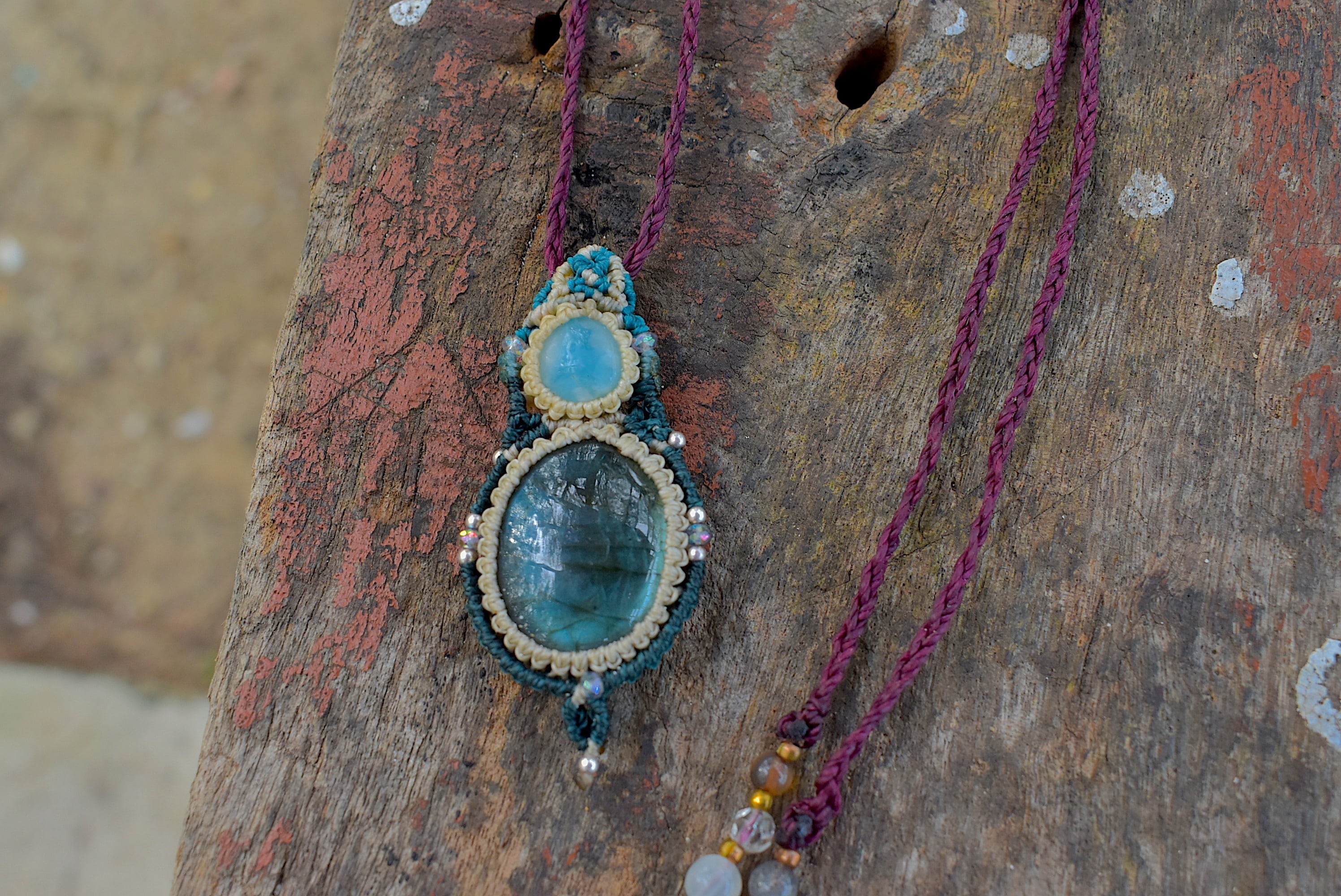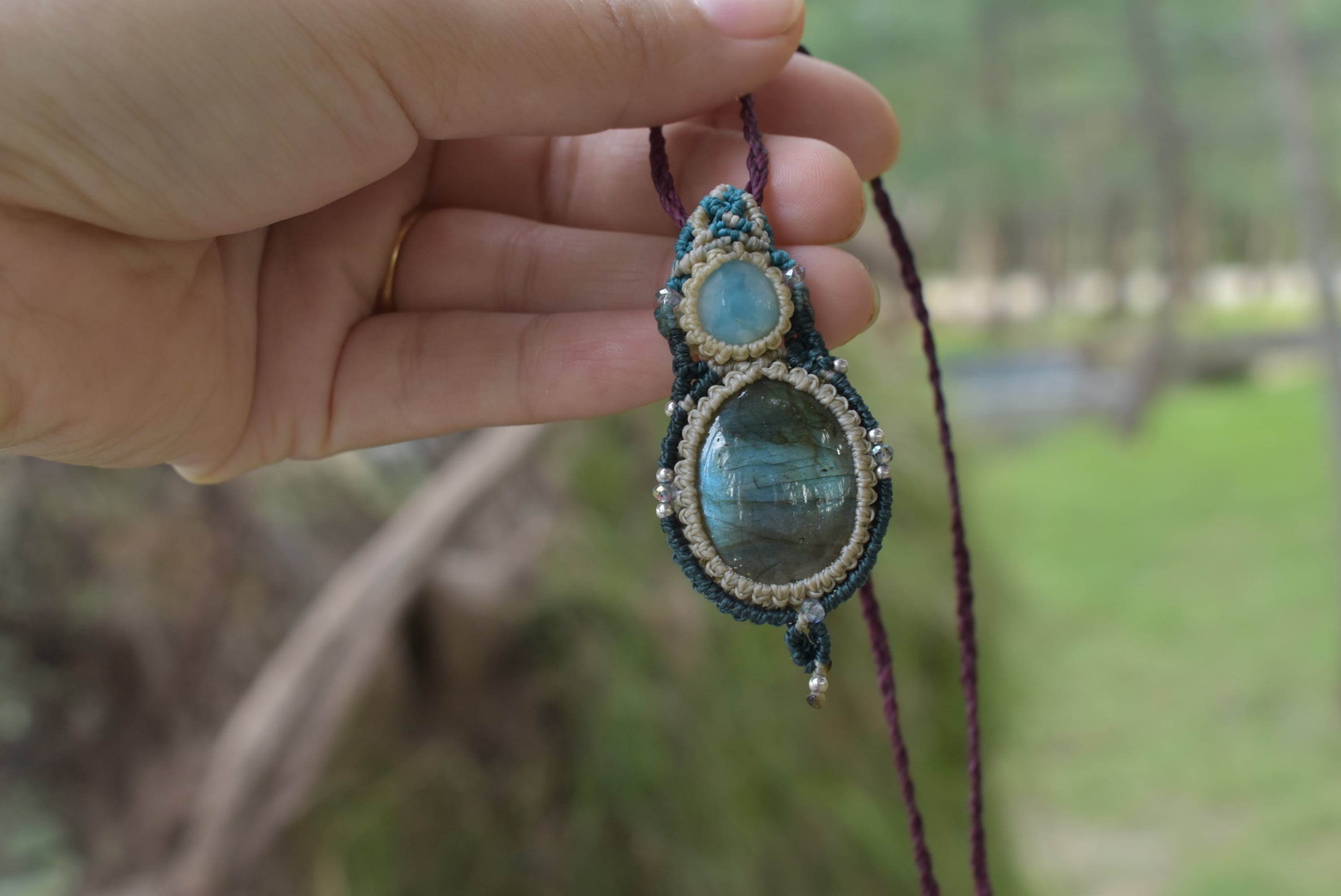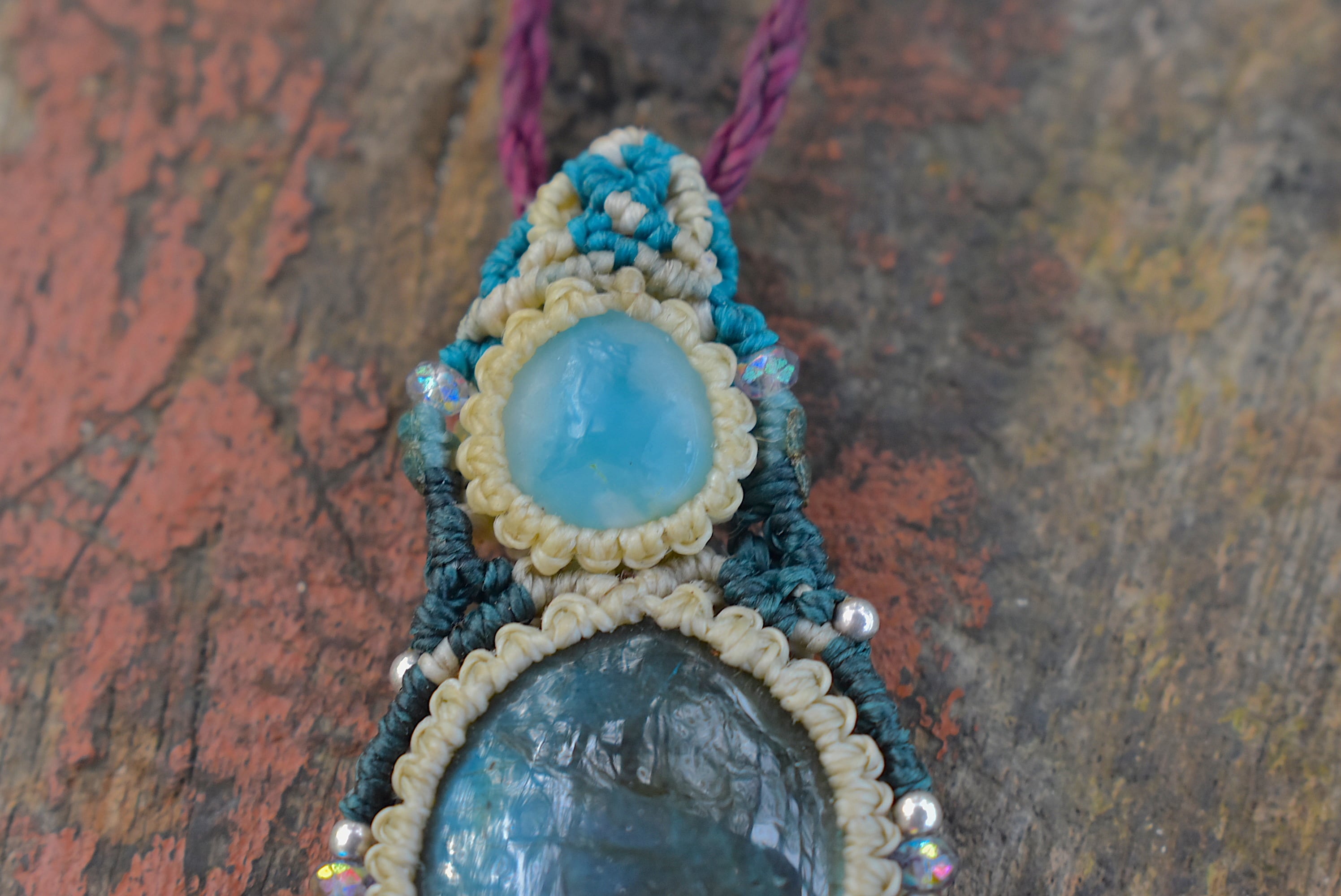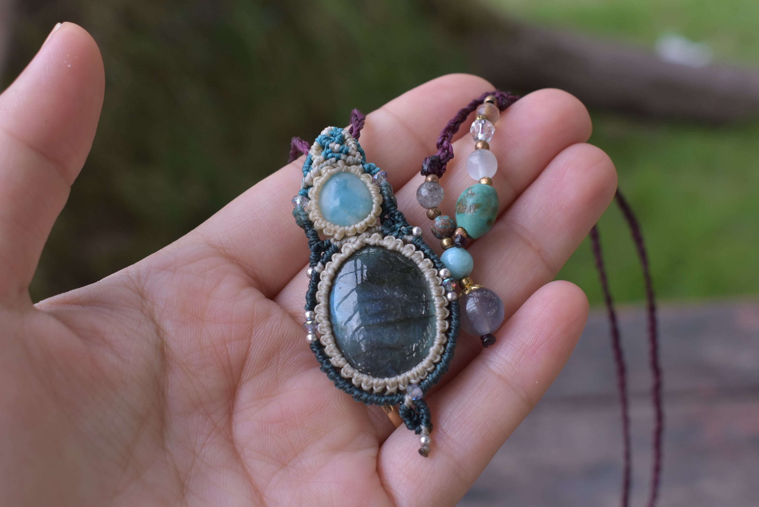 深海のように深くグリーンがかった美しいラブラドライトのトップに愛らしい爽やかさが特徴的な良質小粒ラリマーをひとつにした蒼さを意識したマクラメ編みペンダントを制作しました。いろんな色の蝋引き糸を使用して遊び心をだし、