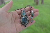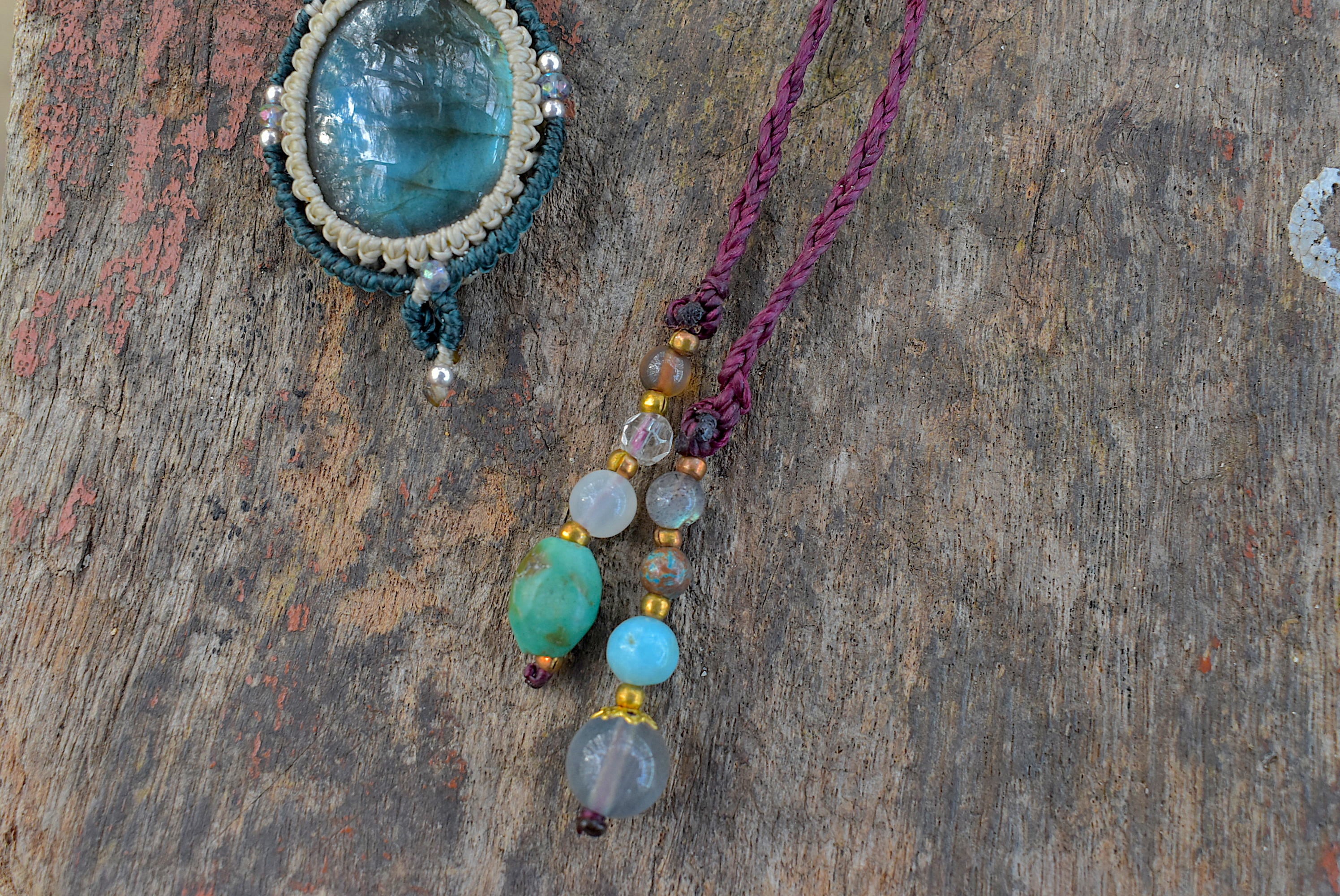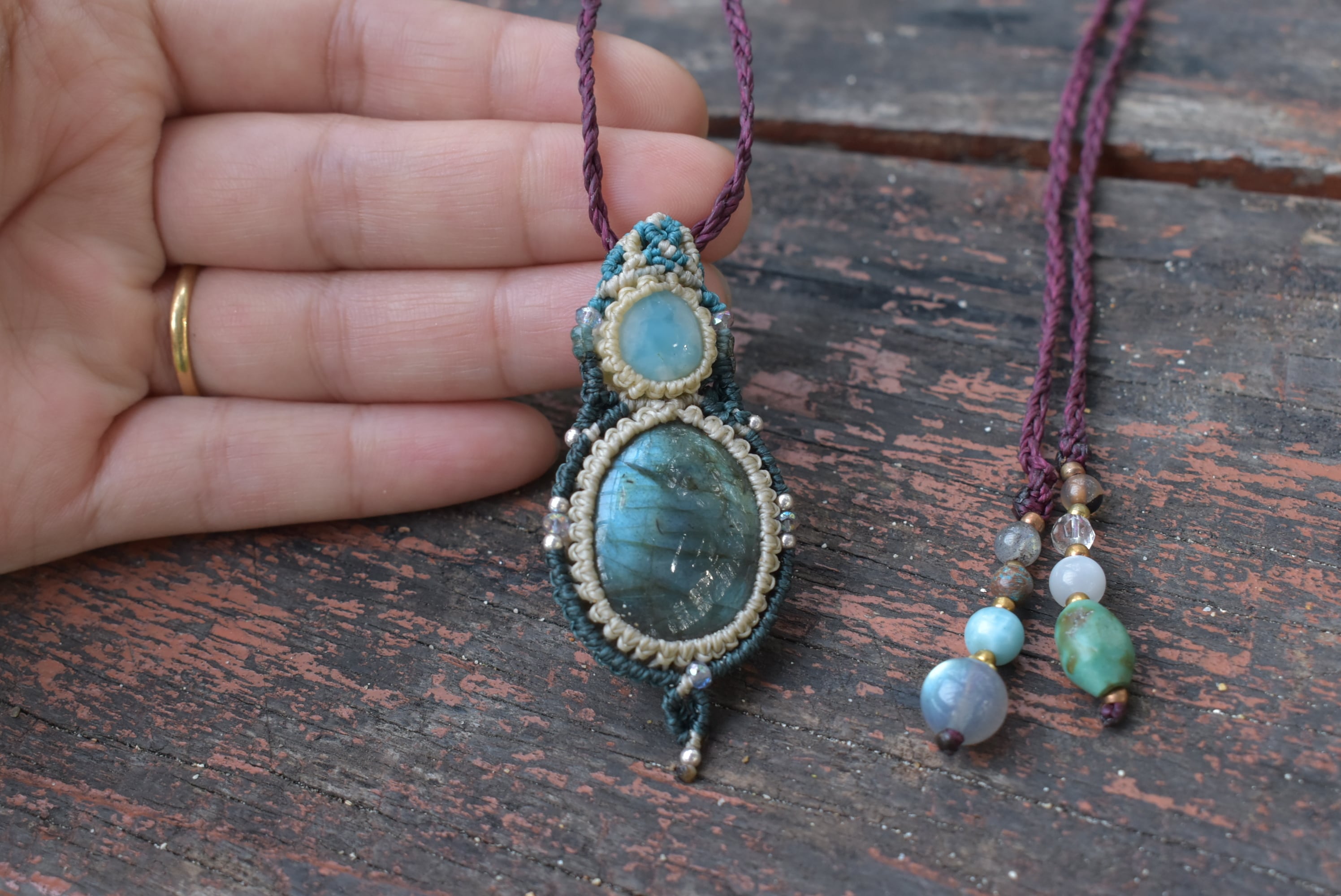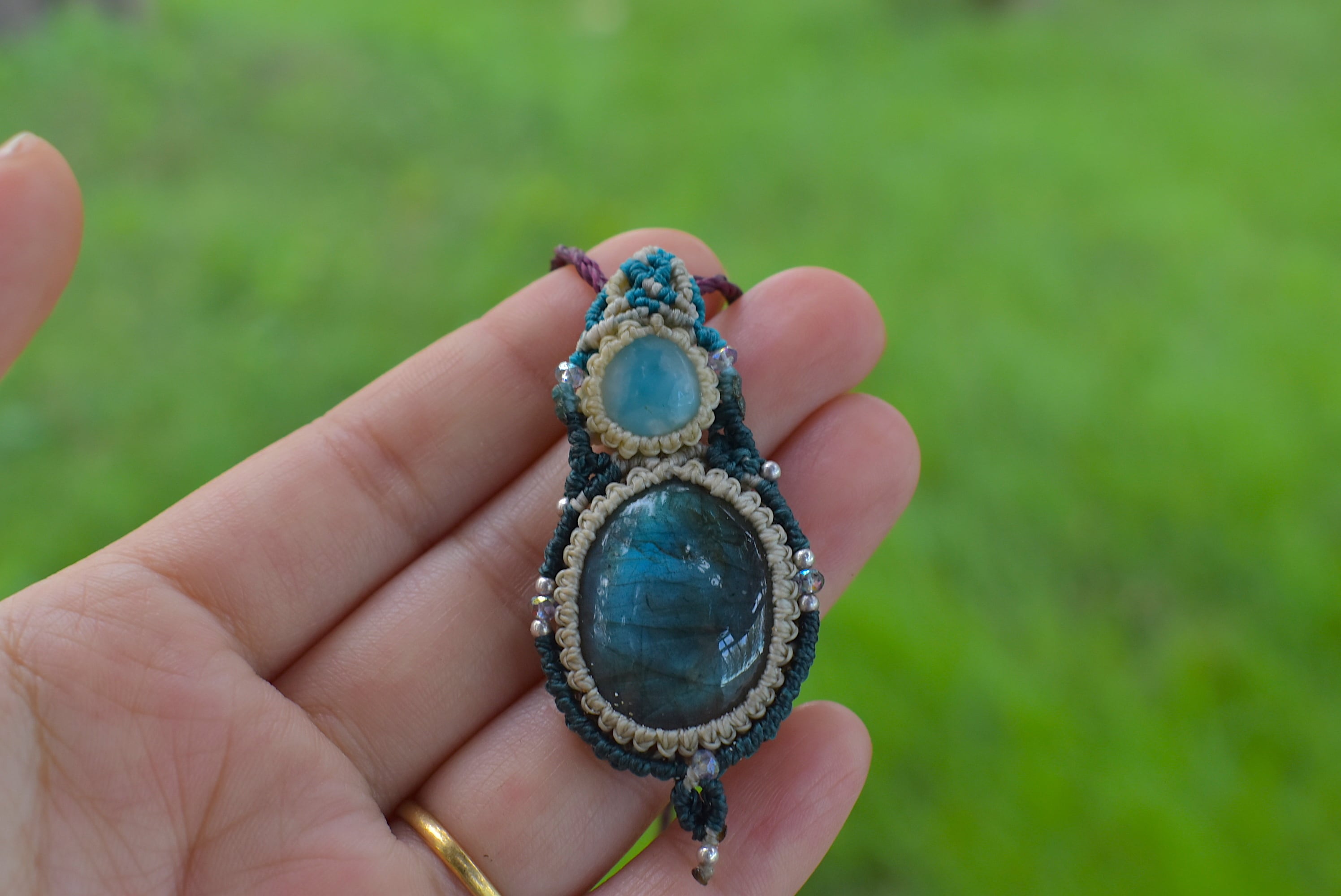 深海のように深くグリーンがかった美しいラブラドライトのトップに愛らしい爽やかさが特徴的な良質小粒ラリマーをひとつにした蒼さを意識したマクラメ編みペンダントを制作しました。いろんな色の蝋引き糸を使用して遊び心をだし、