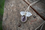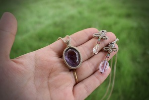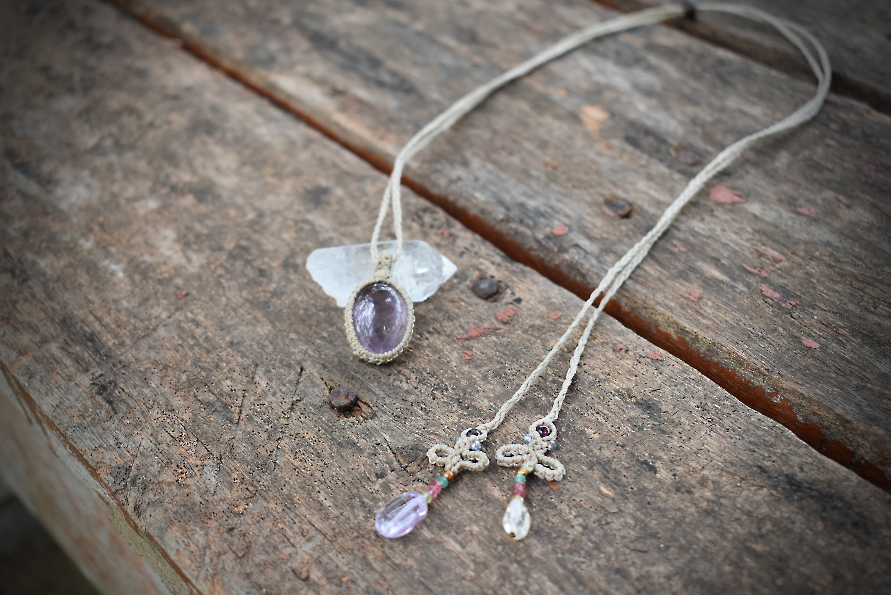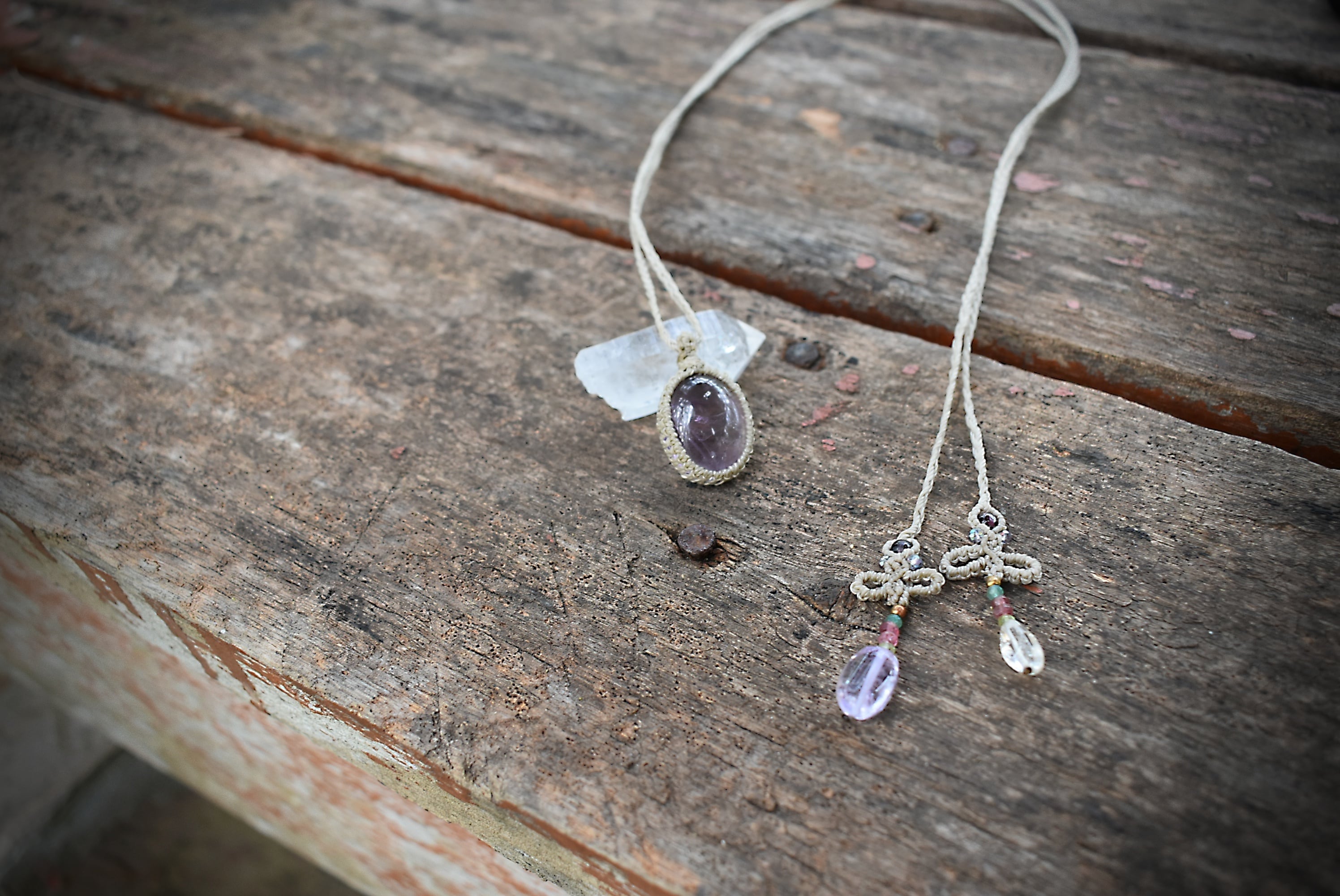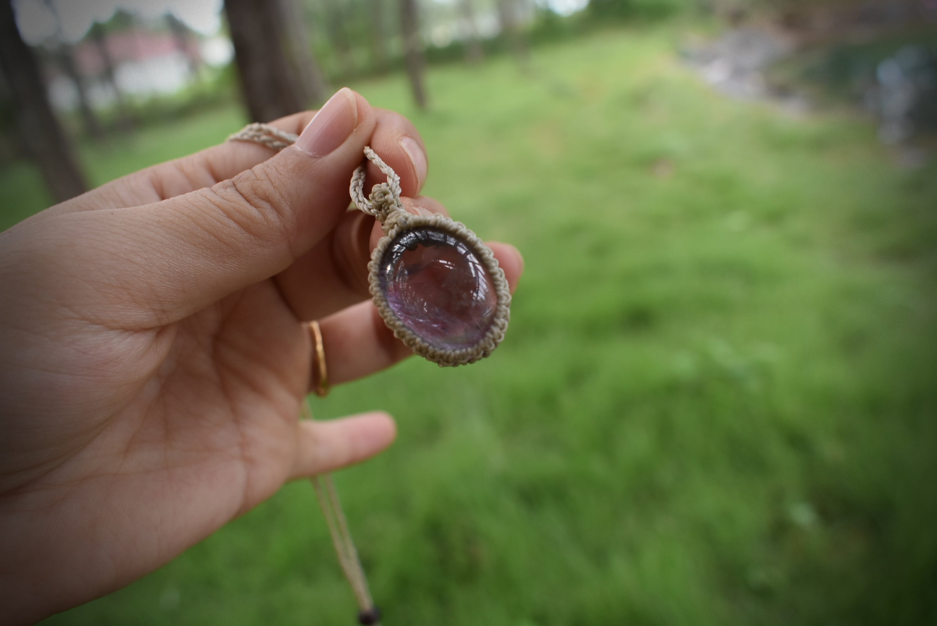 まさに飴玉のようにクリアでうっすらとしたパープルカラーが愛らしいアメトリンをシンプルにマクラメあみ装飾を施し、ペンダントに仕上げました。