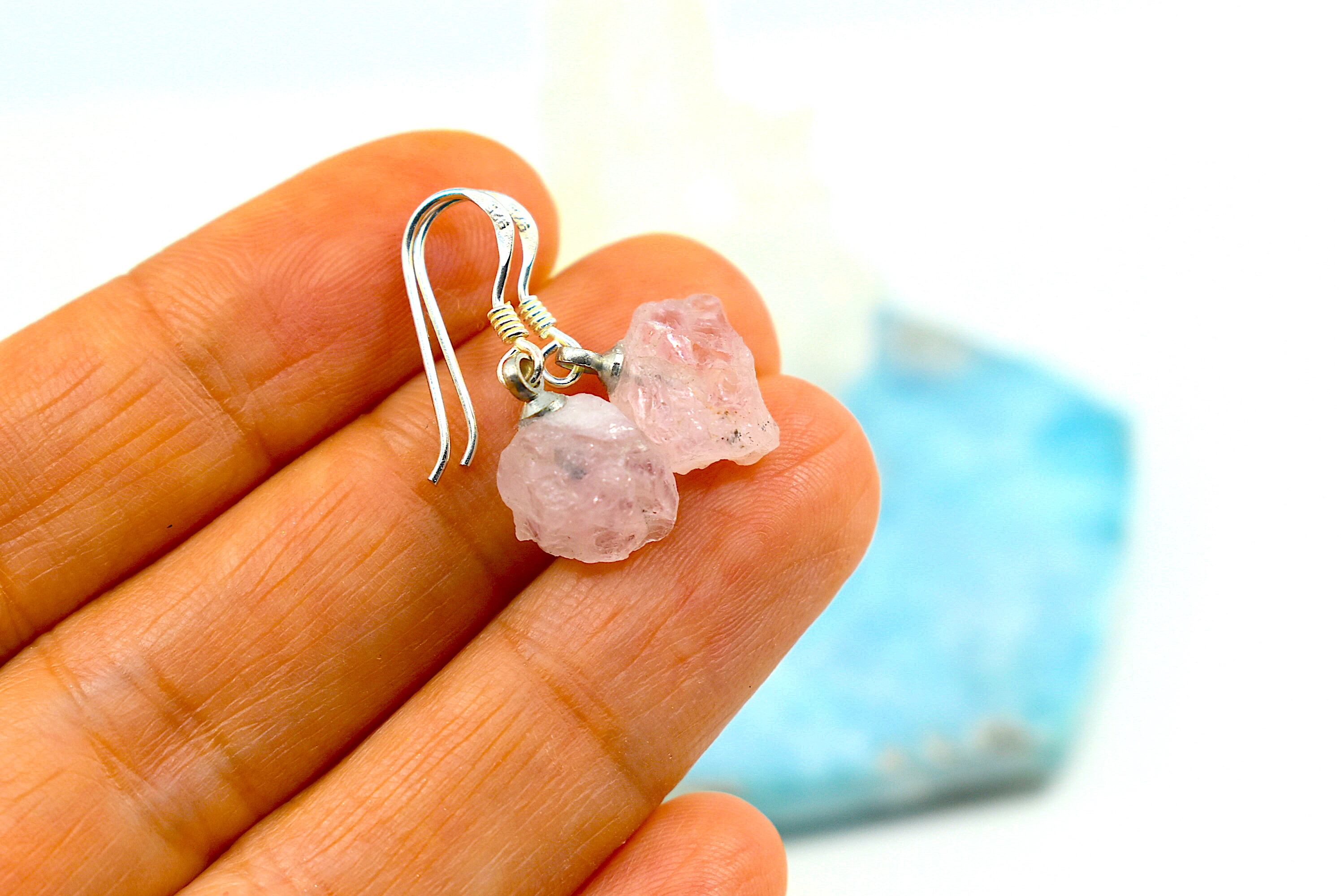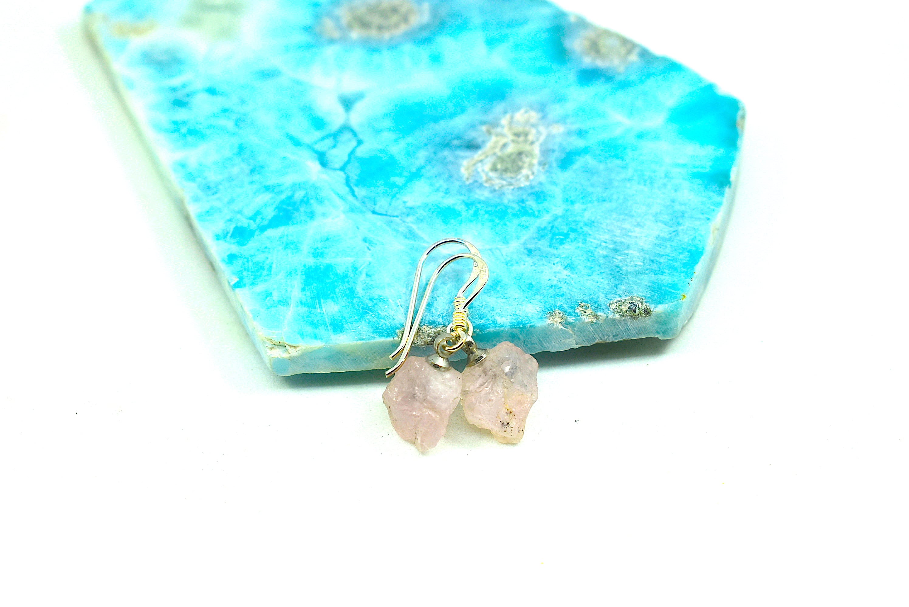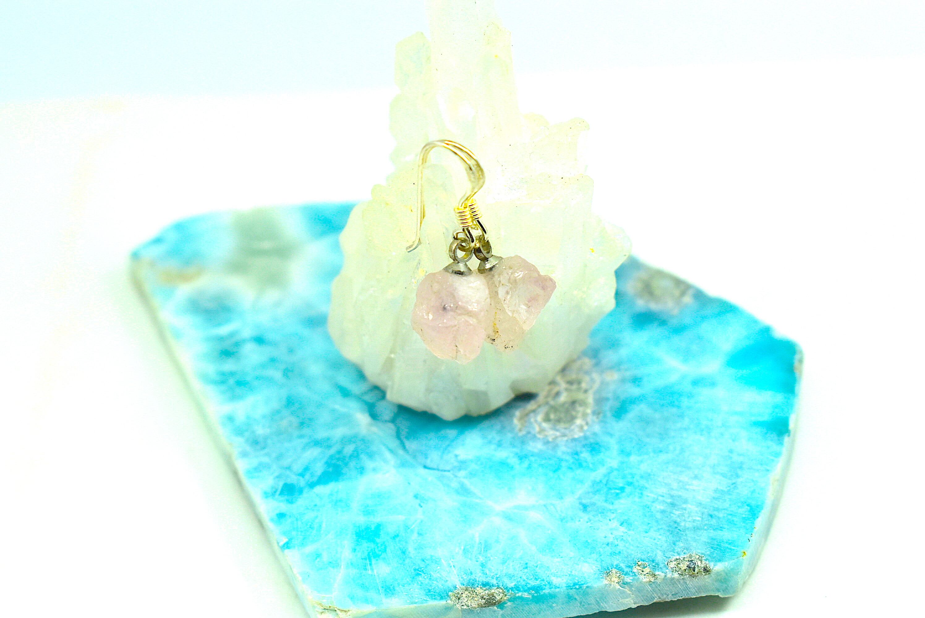 キラキラとした透明感あるピンク色がモルガナイトの特徴です。その特徴的なピンクの透明感がる原石をそのままピアスしました。