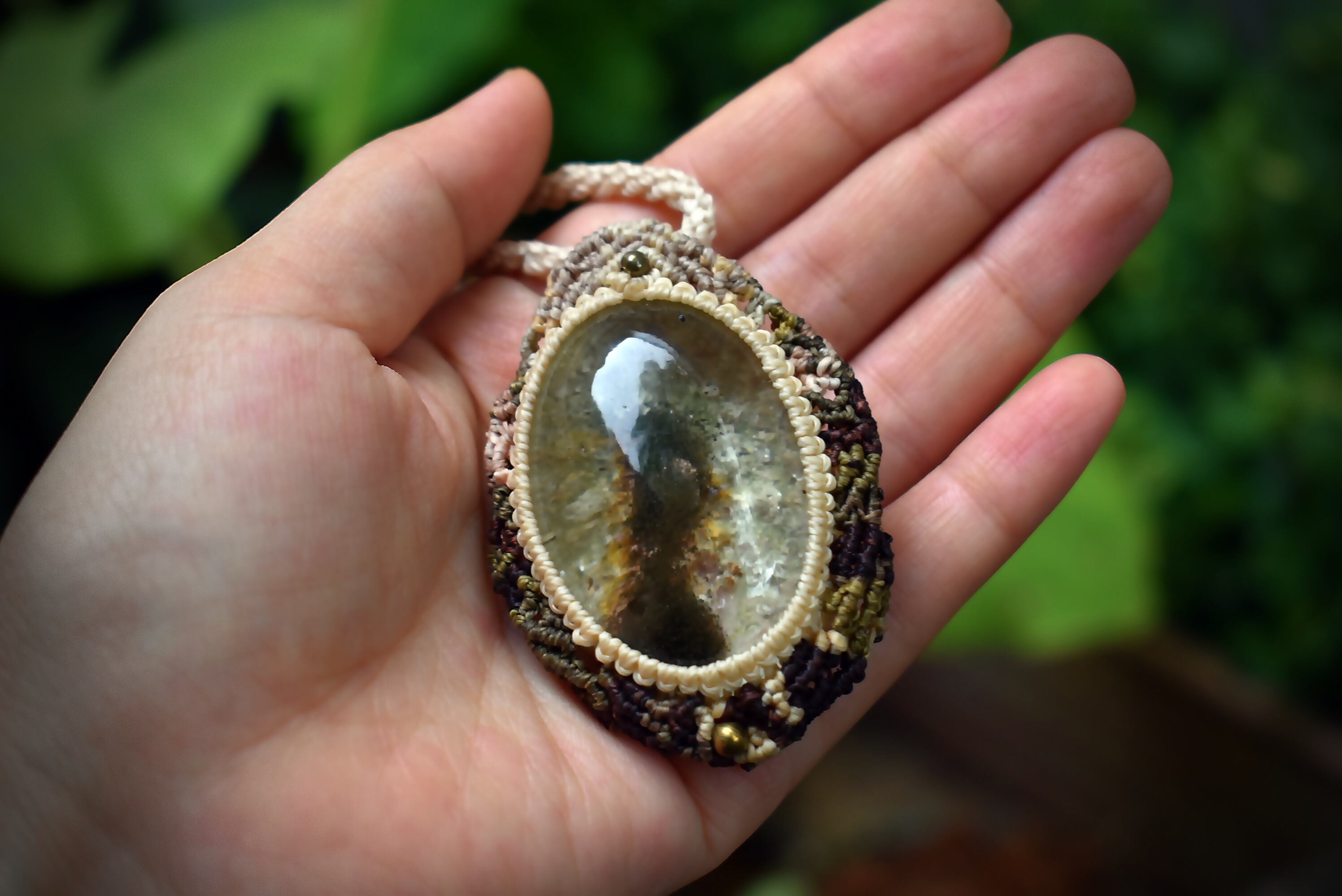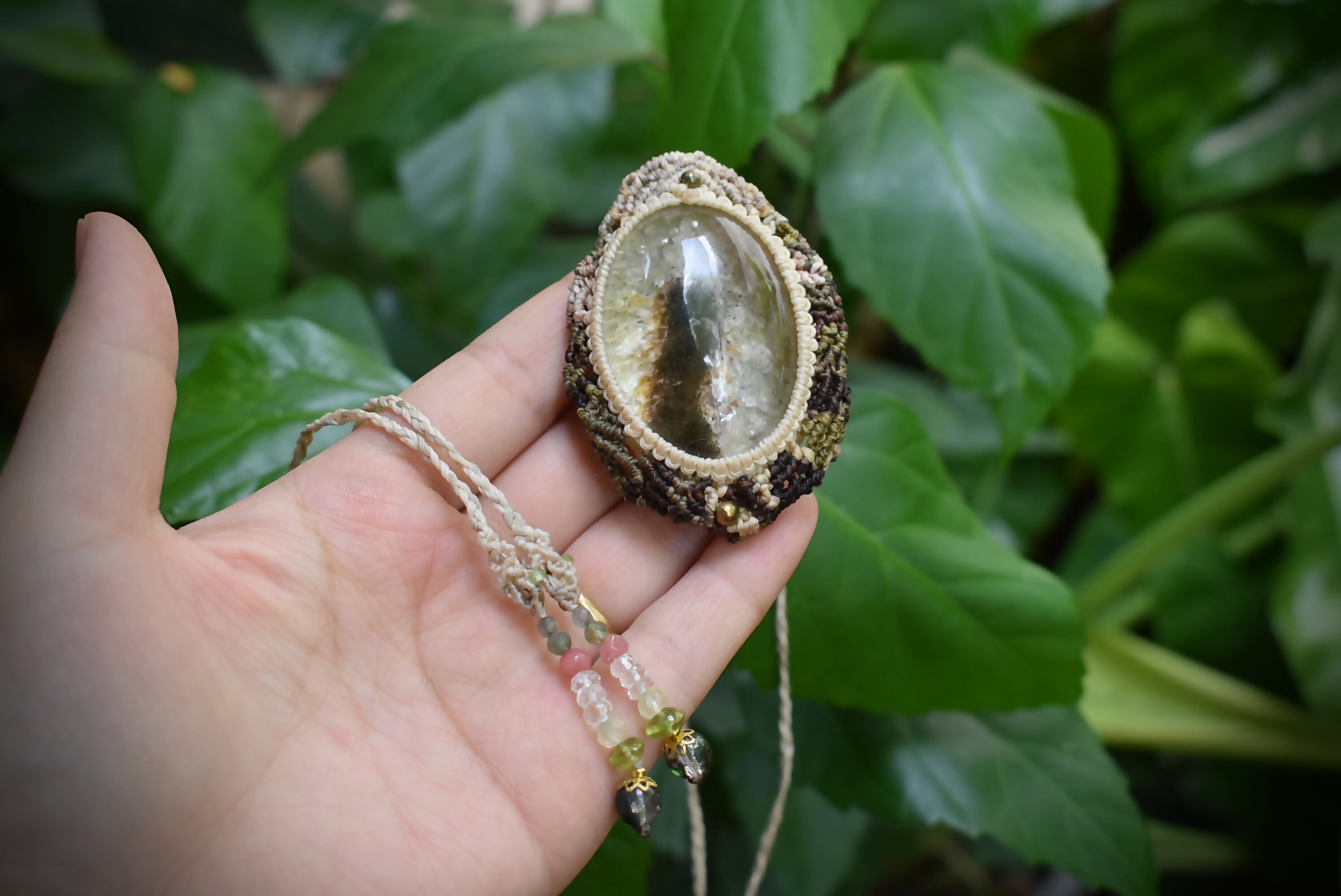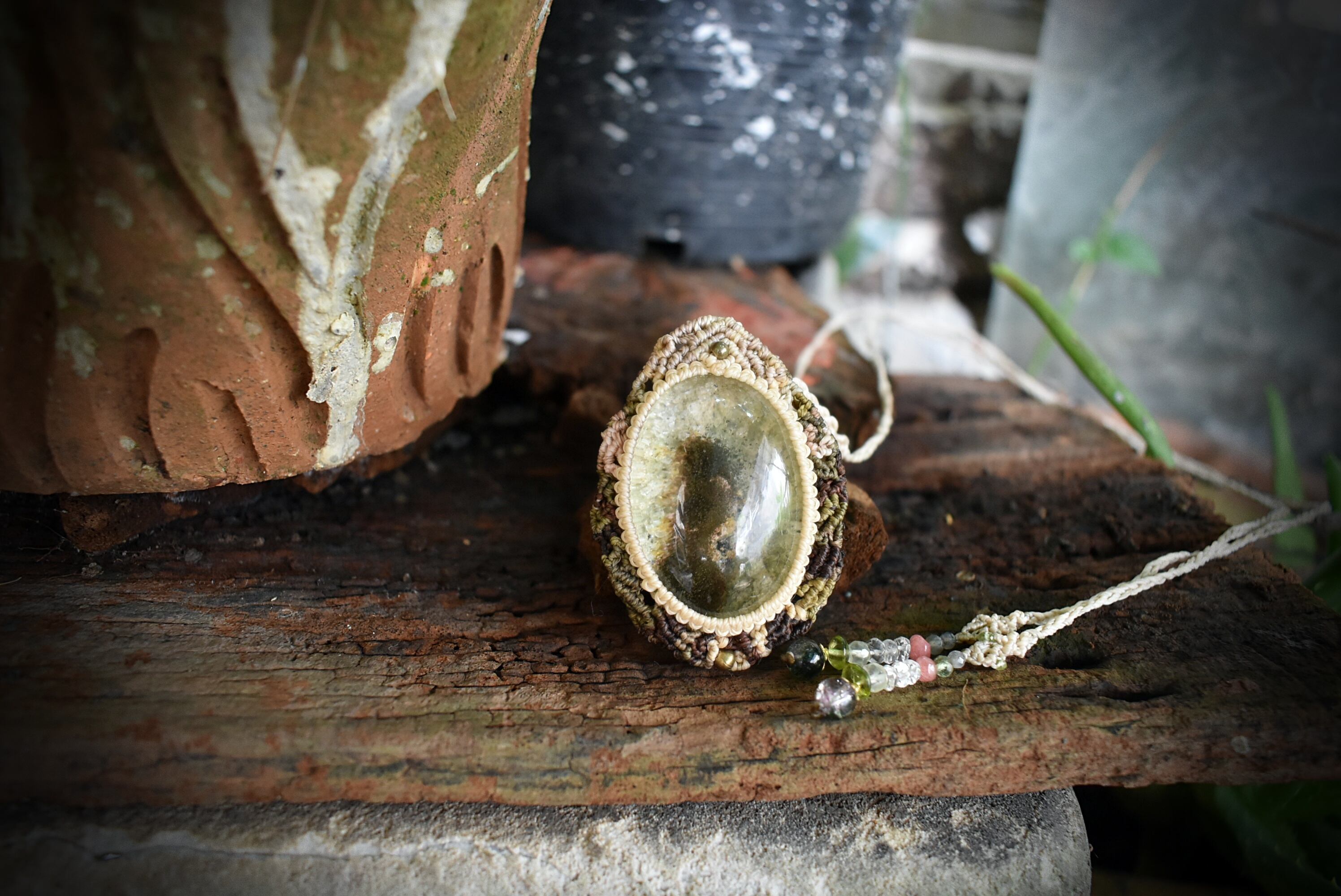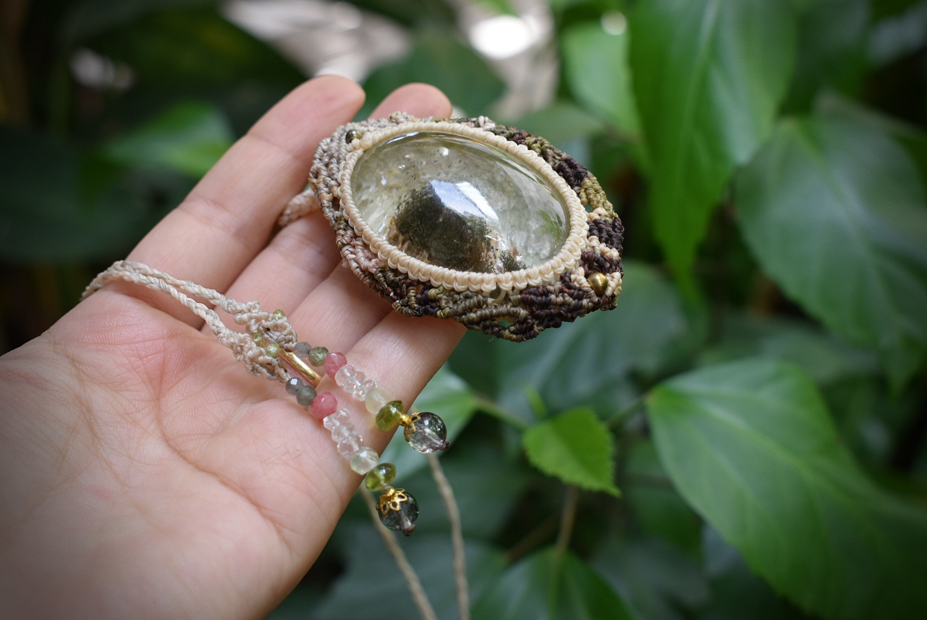 このたびはグラフィカルであり、ガーデンクォーツ 特有の森林のような庭、ピンク色、山吹色 そしてオパールのような虹色..すべてを大粒水晶の中にぎゅっと詰め込んだスペシャルなガーデンクォーツをこの石の世界から見て取ることのできる色のロウ引き糸を使用して、石を包み込むようにマクラメ編み装飾を施しました。