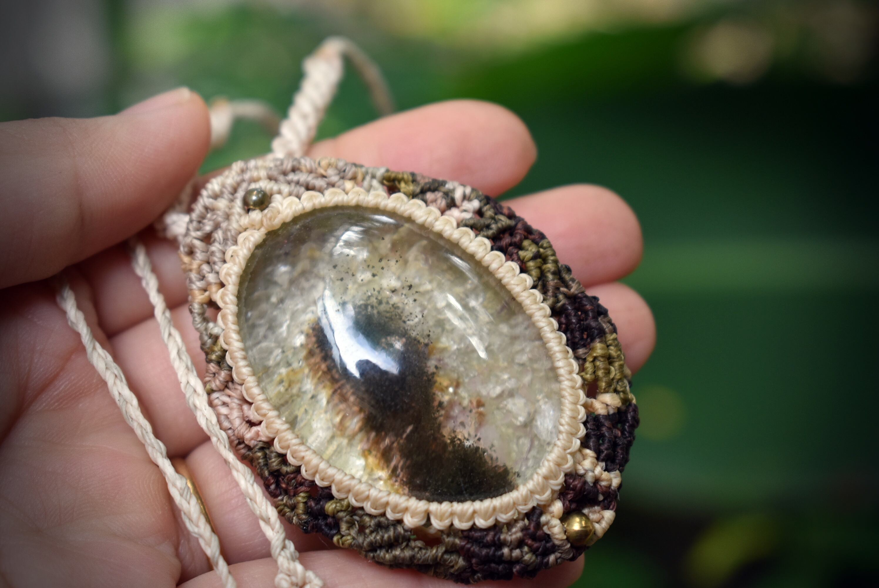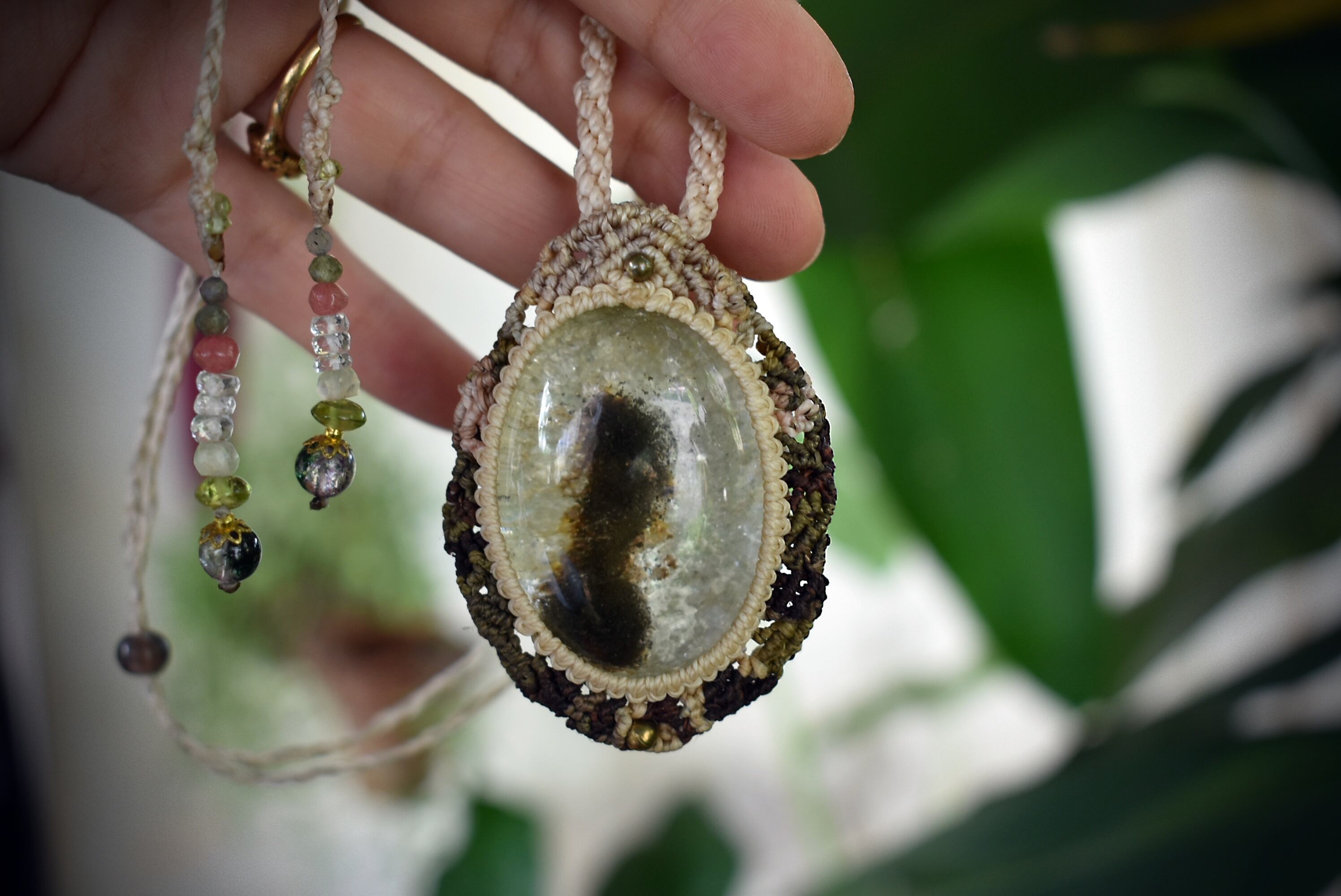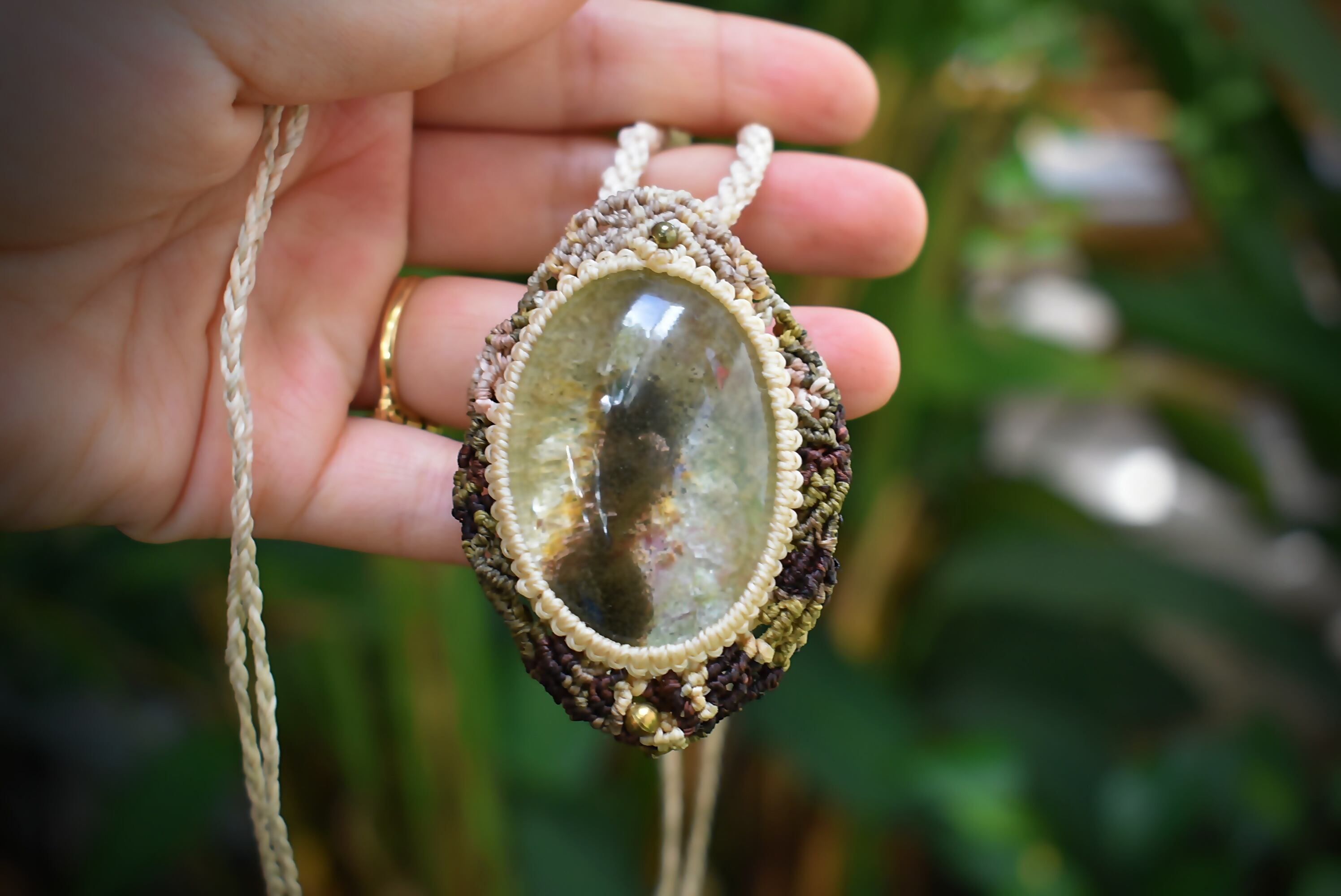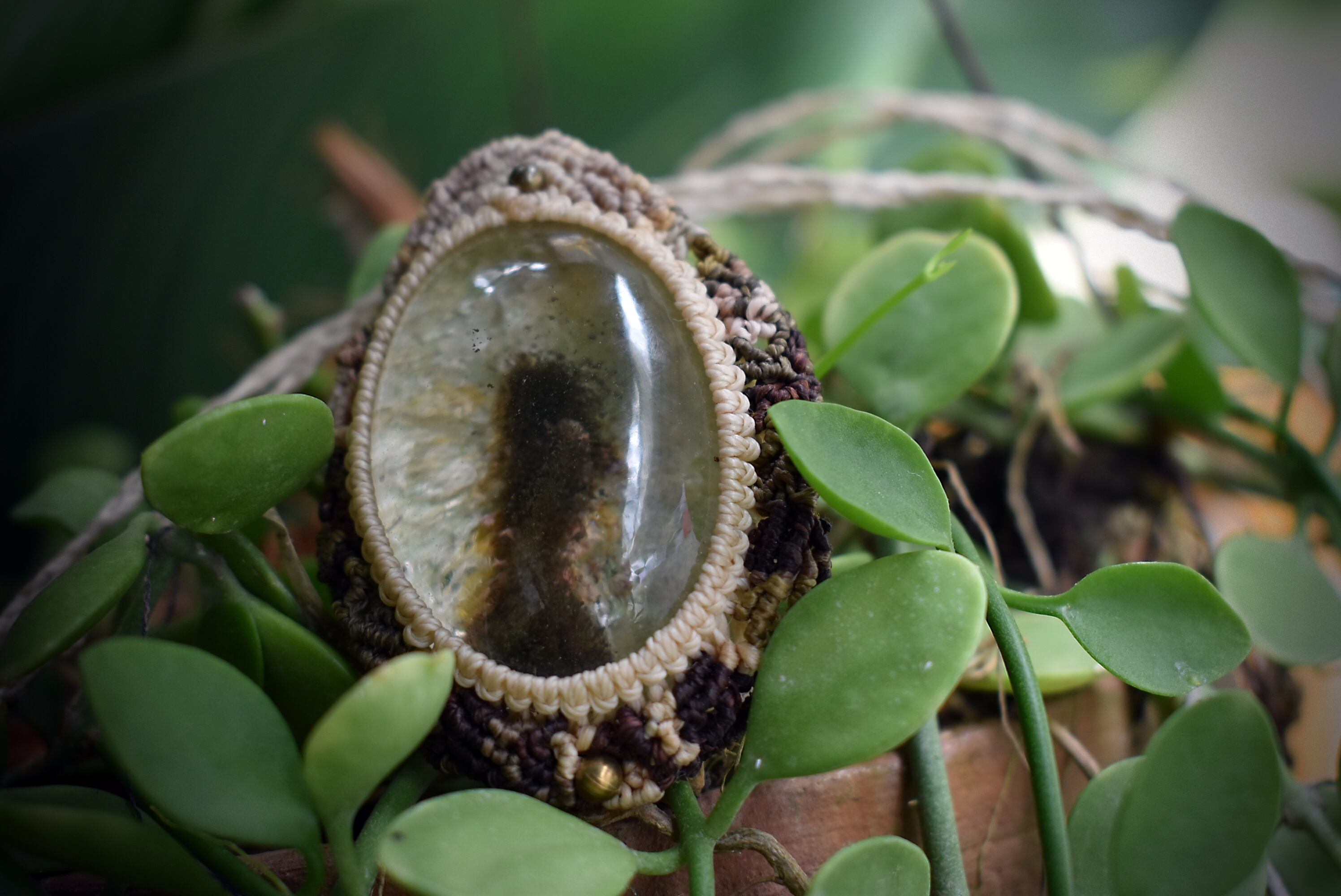 このたびはグラフィカルであり、ガーデンクォーツ 特有の森林のような庭、ピンク色、山吹色 そしてオパールのような虹色..すべてを大粒水晶の中にぎゅっと詰め込んだスペシャルなガーデンクォーツをこの石の世界から見て取ることのできる色のロウ引き糸を使用して、石を包み込むようにマクラメ編み装飾を施しました。