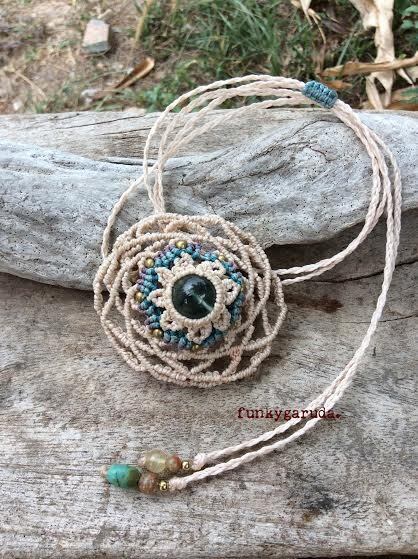 透きとおる深海のようなグリーンに何本かのラインが入った美しいボール型のフローライト。まわりをマクラメ編みし、マンダラモチーフにしたインパクトあるペンダントにしました。