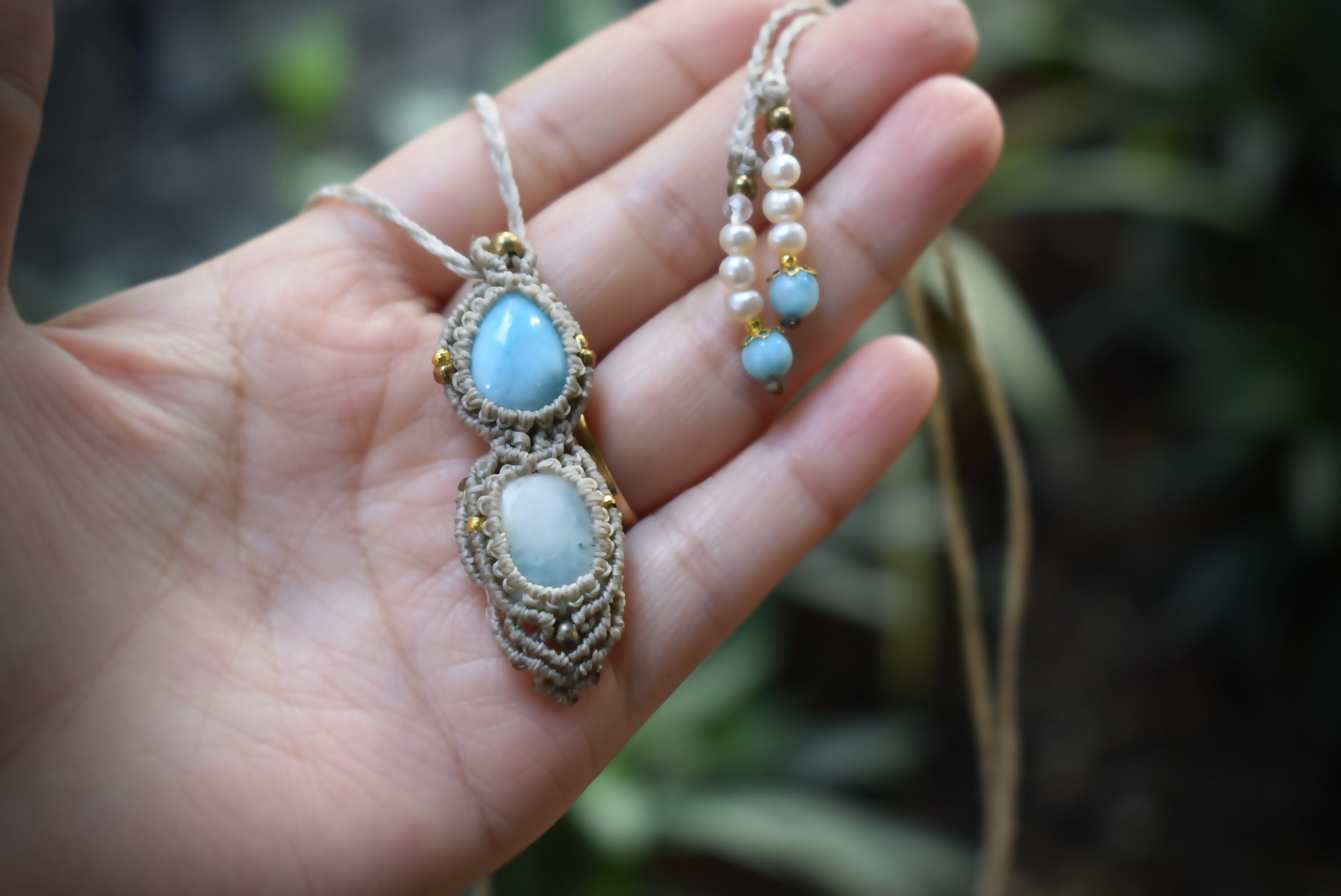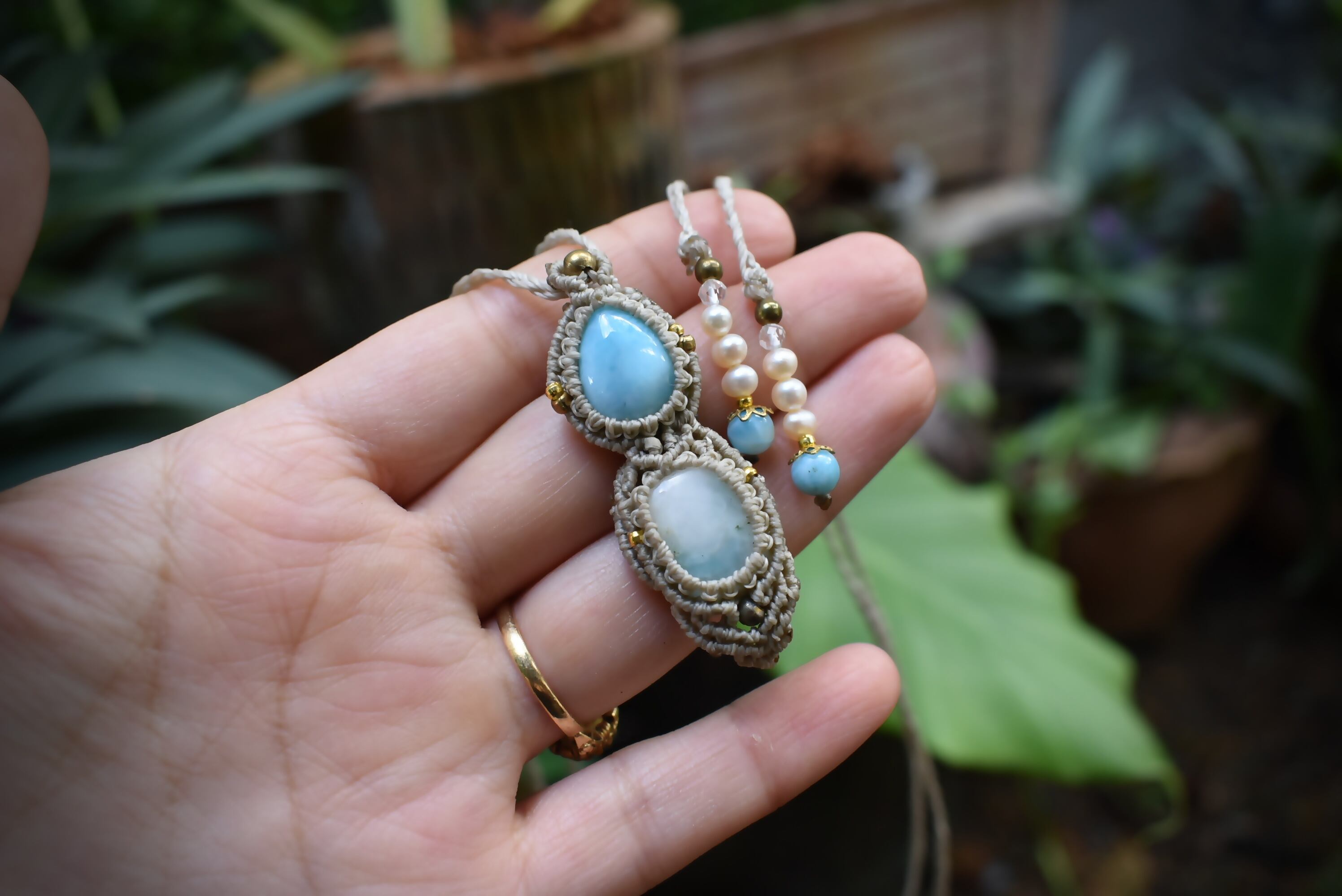 爽やかブルー★ダブルラリマー★マクラメペンダント