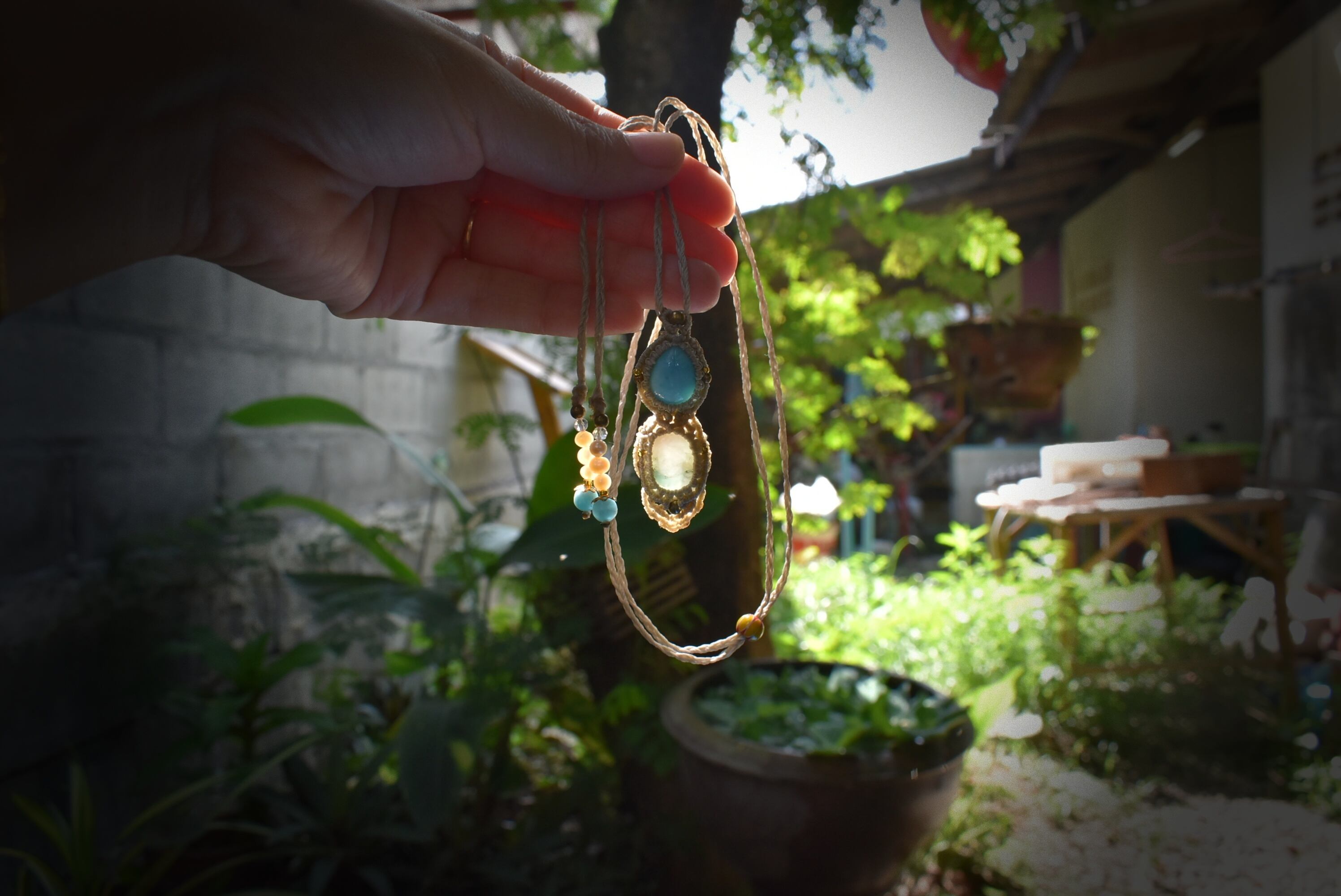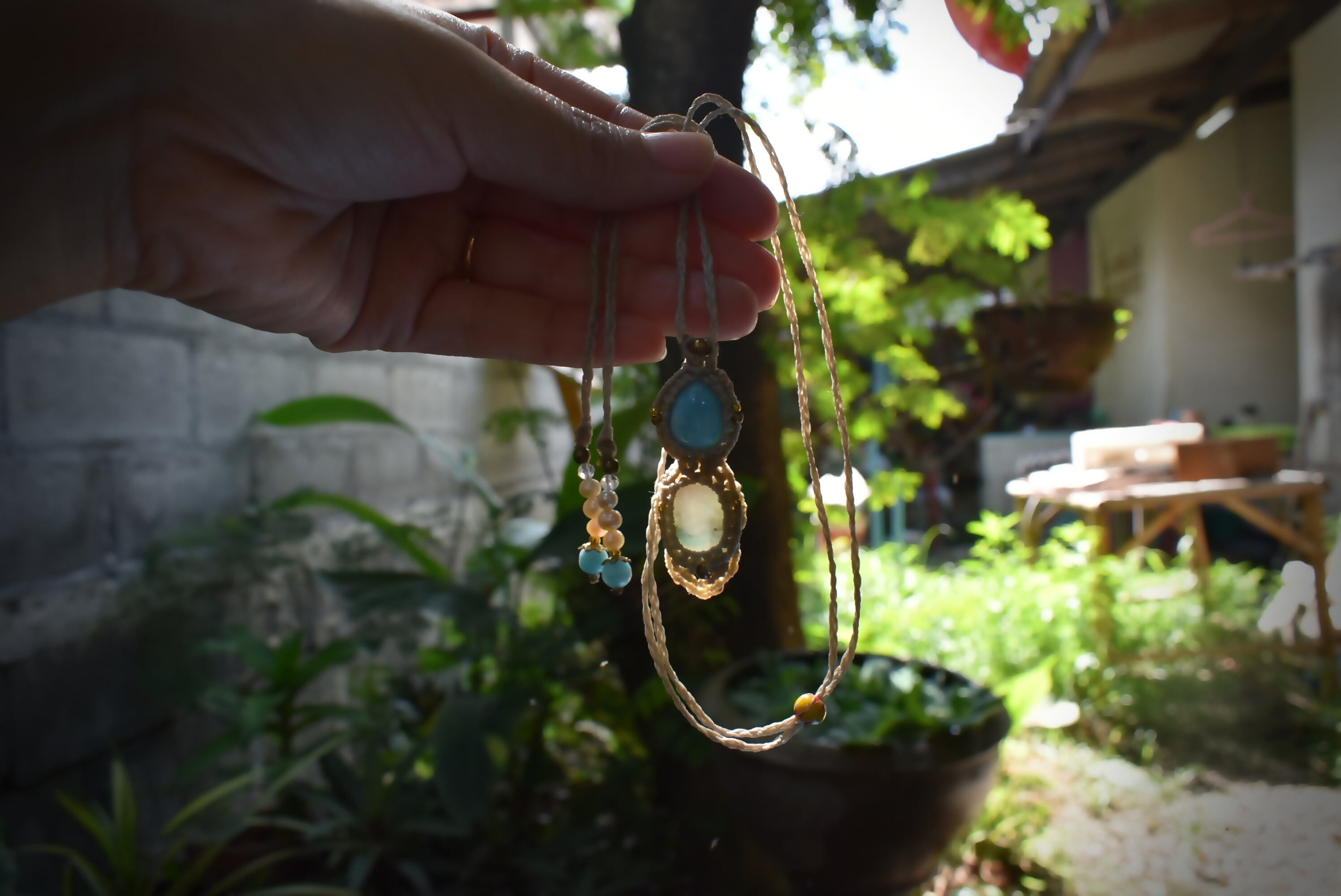 ふたつをひとつにマクラメ編み装飾を施し、ペンダントに仕上げました。