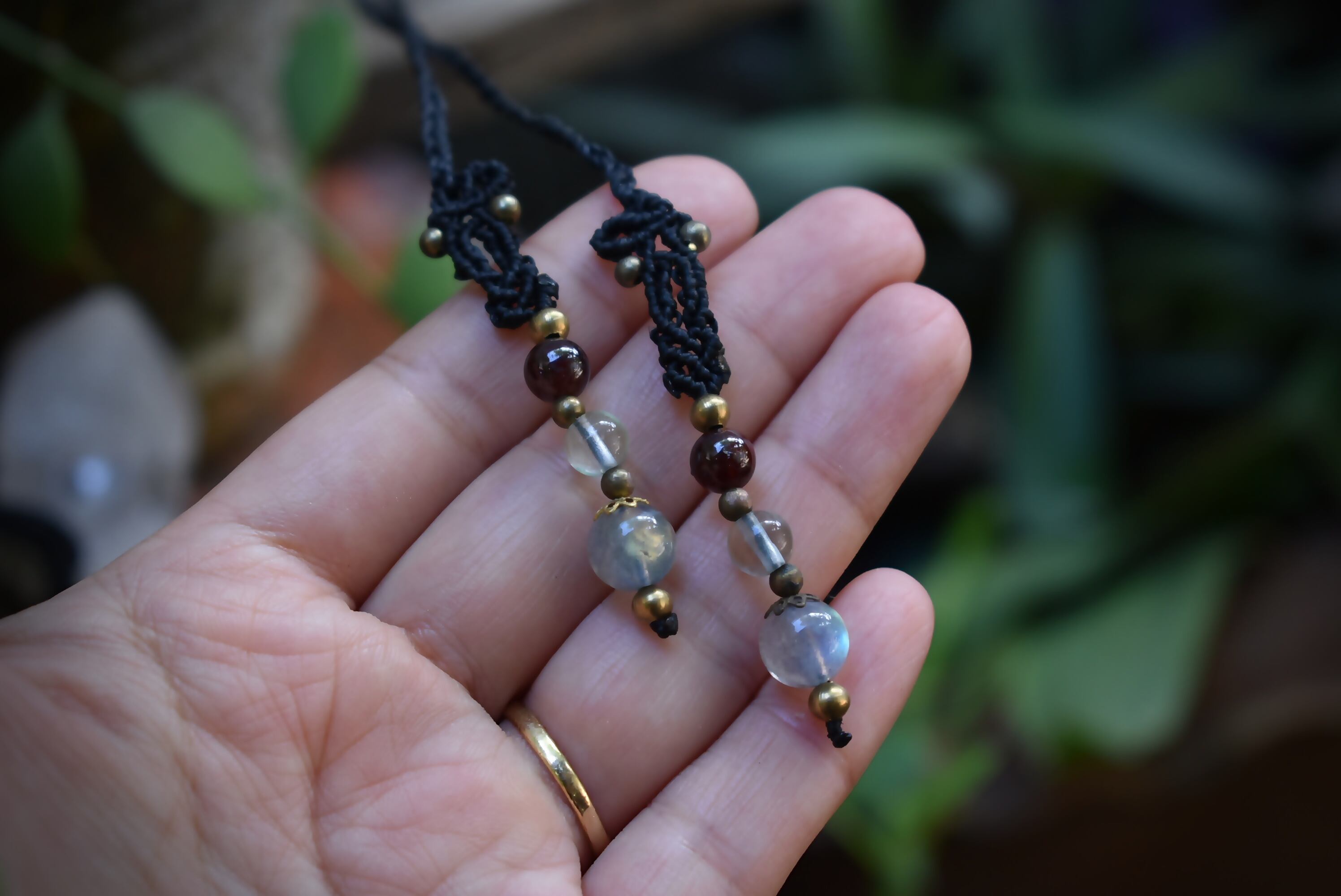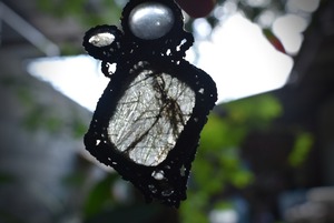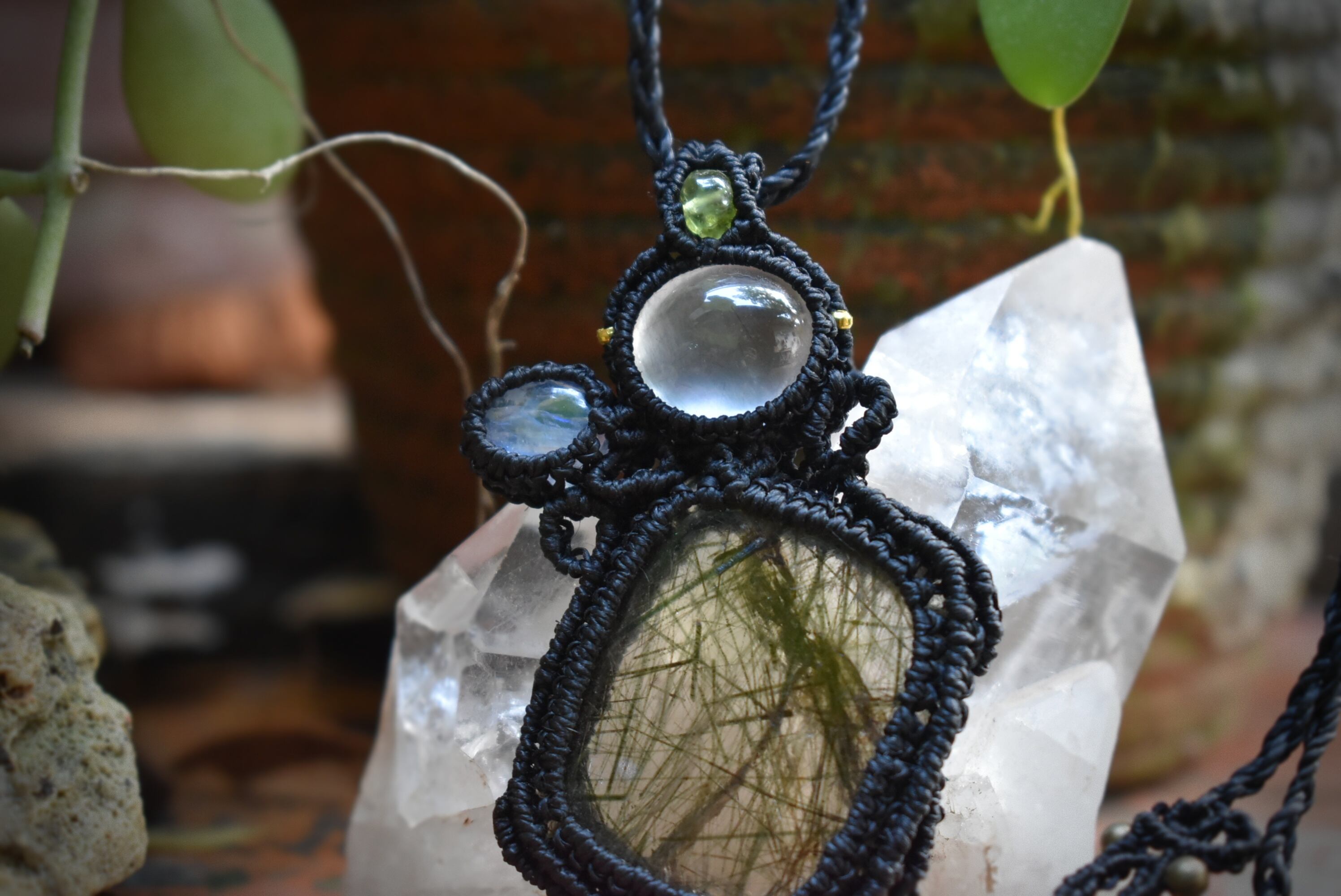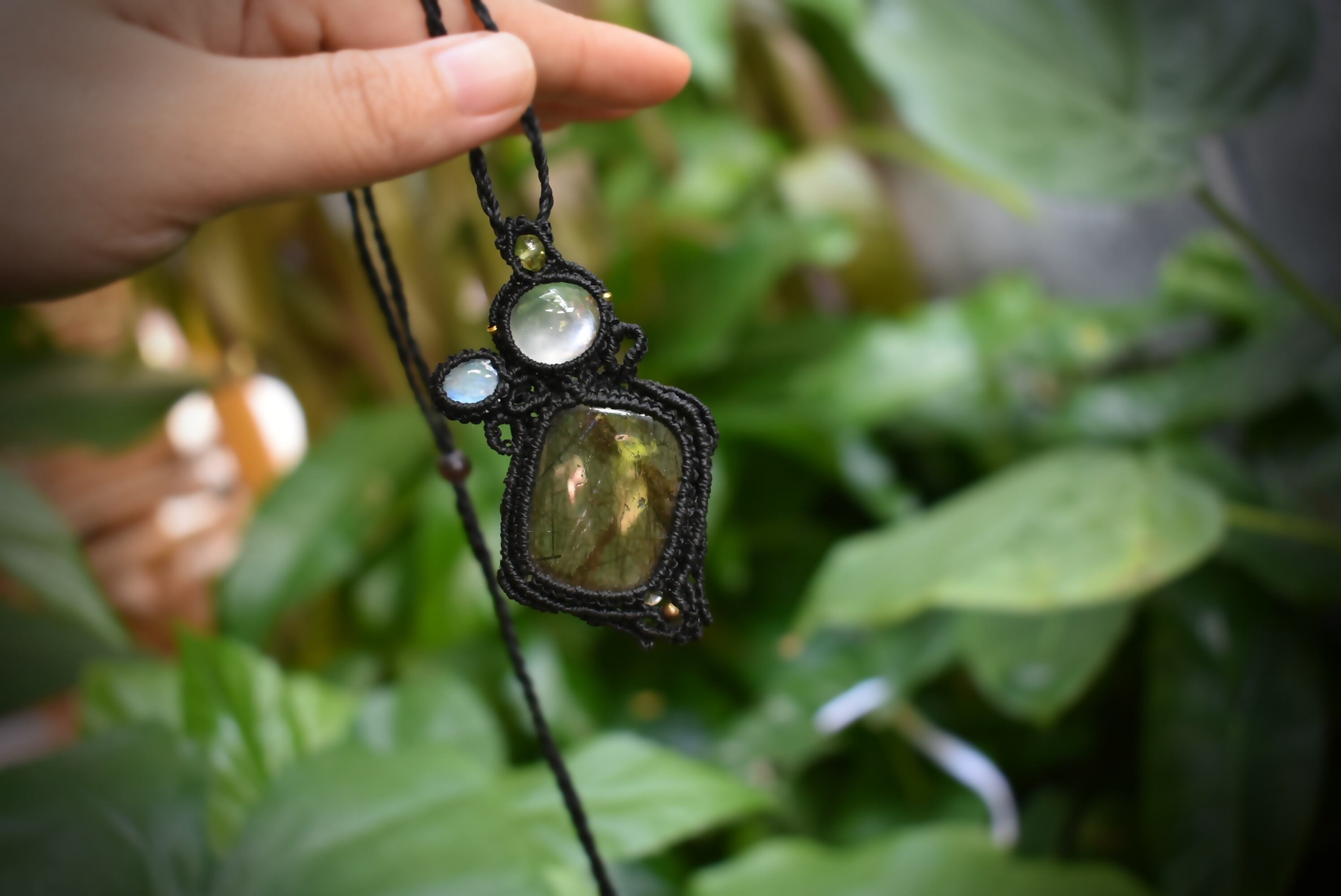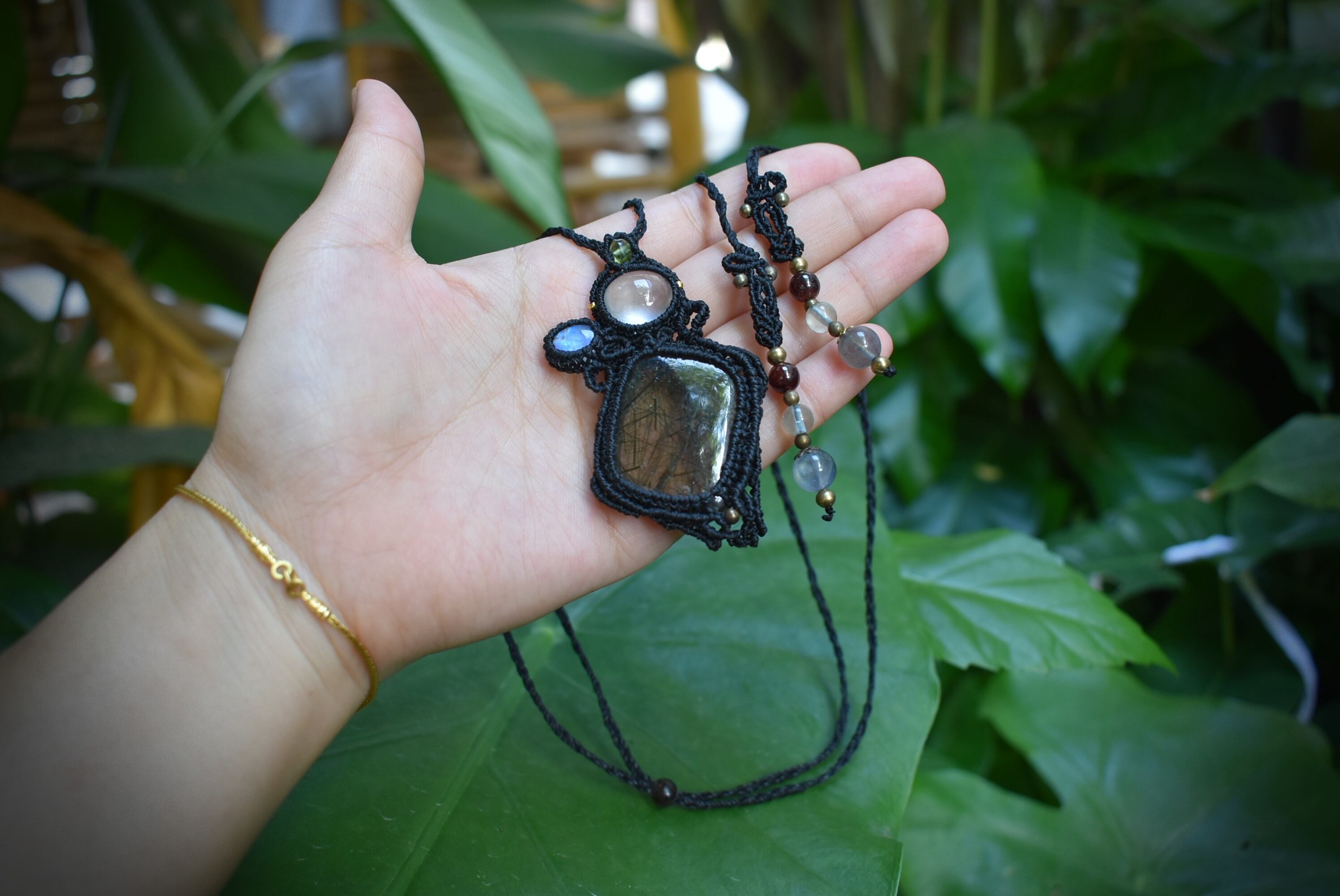 水晶の中を激しくほとばしるブラックルチルインクォーツは角度によって、美しいシラーを持ち合わせている石です。この石を土台に柔らかい色合いのガーデン水晶、そして、高品質でブルーレインボーが煌めくホワイトラブラドライトを重ねて植物の大きく成長するさまをイメージしてマクラメ編みを施しました。