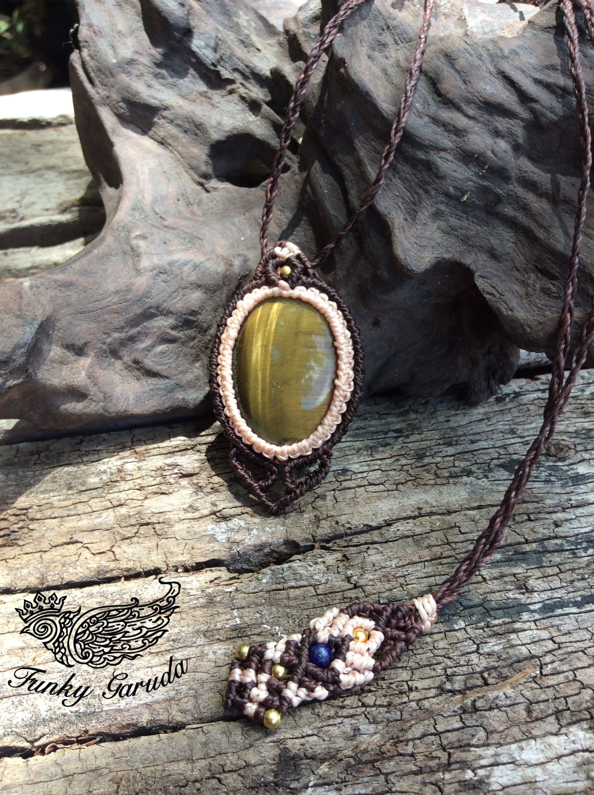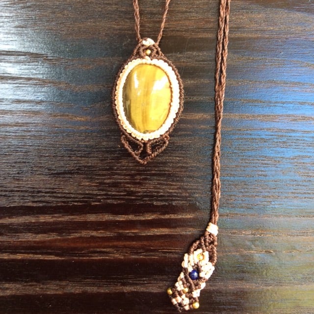 ラッキーストーンとしても知られている石、タイガーアイをシンプルなマクラメペンダントネックレスにしました。