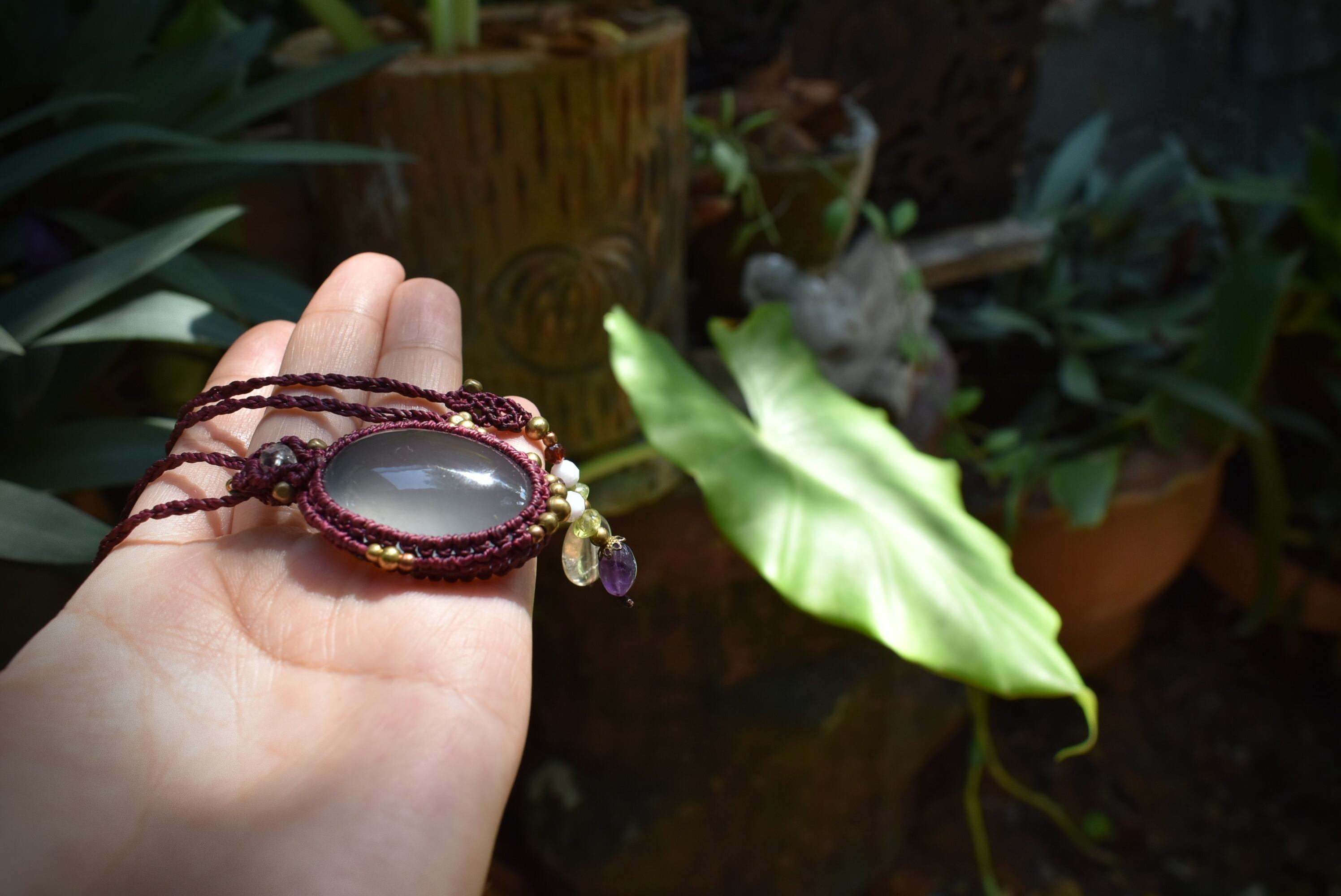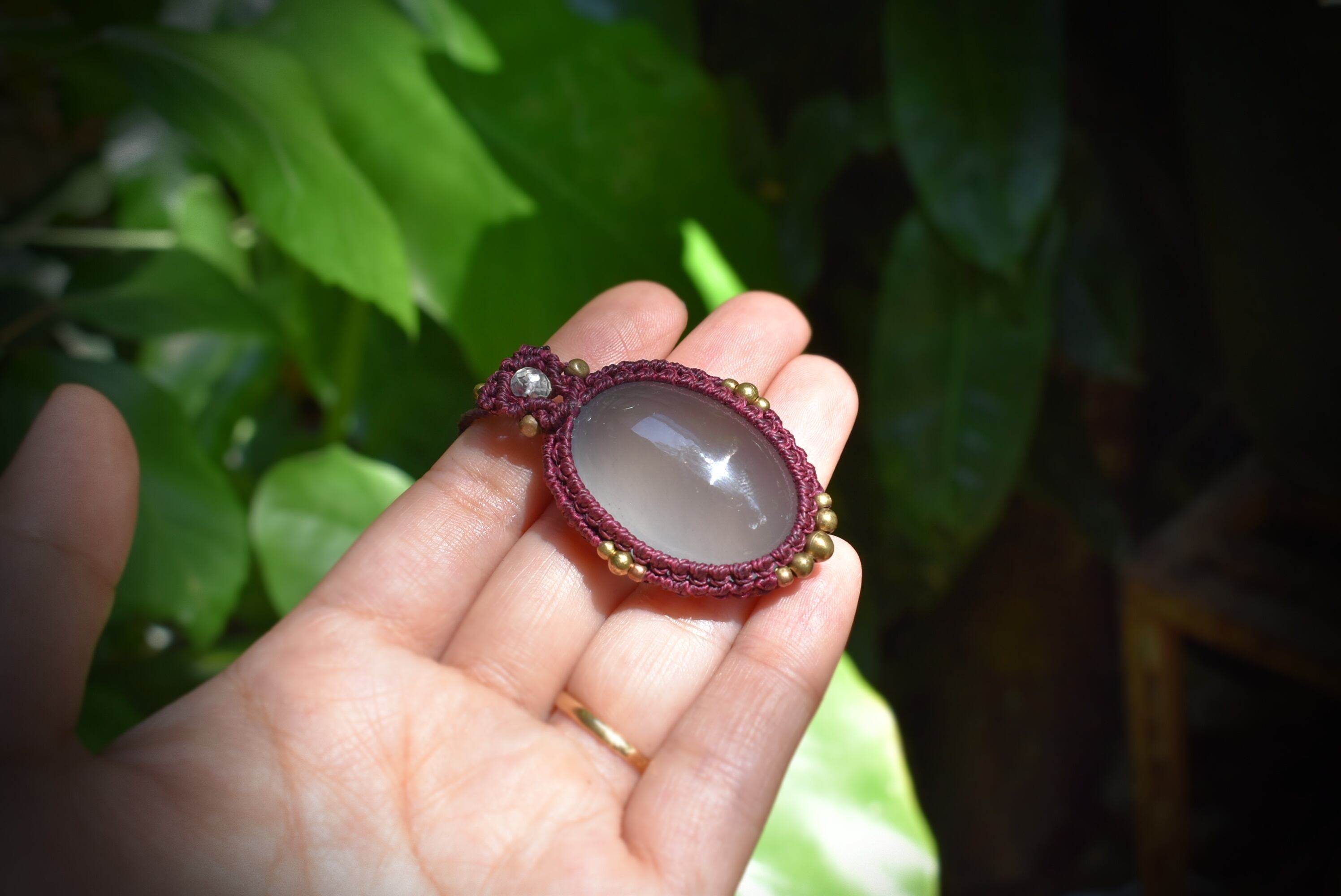 ◆このたびはボルドー色の蝋引き糸を使用しマクラメ編み装飾を施しました。