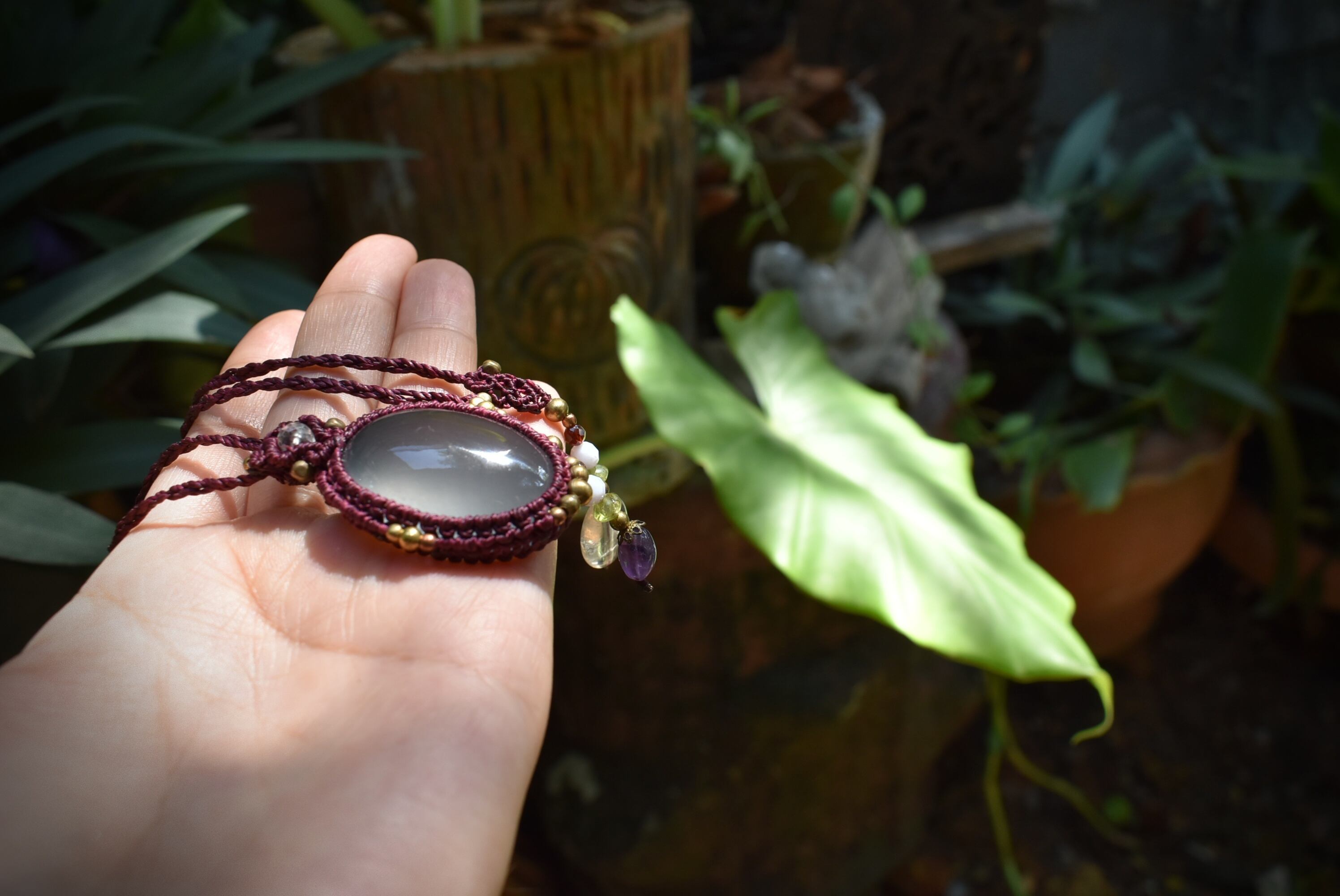 スモーキーでピカピカに研磨が施されているブラックスモーキーガーデンクォーツをシンプルに、真鍮ビーズをあしらいペンダントに仕上げました。トップの部分には研磨を施したカット水晶ビーズを使用し、石の輝きを引き立てるようマクラメ編み装飾を施しました。