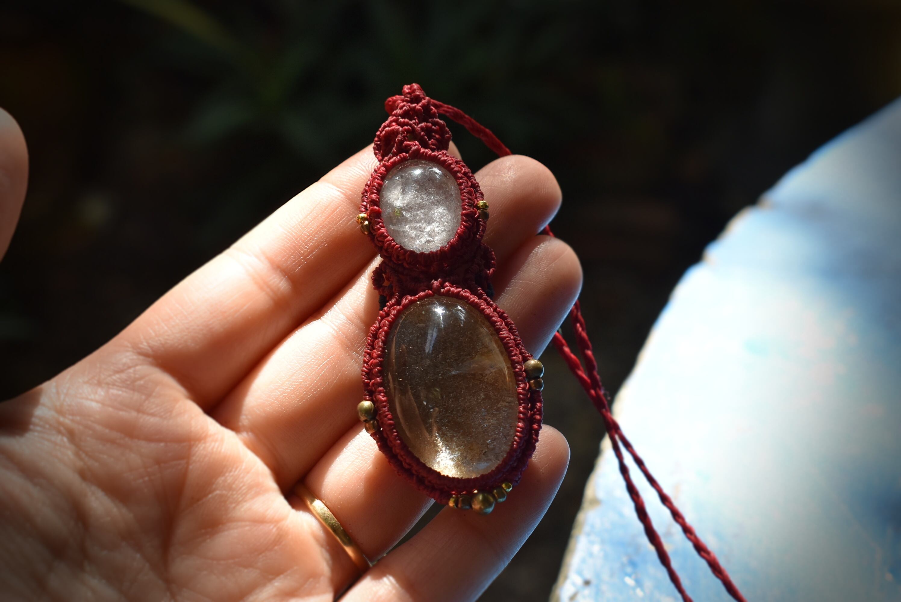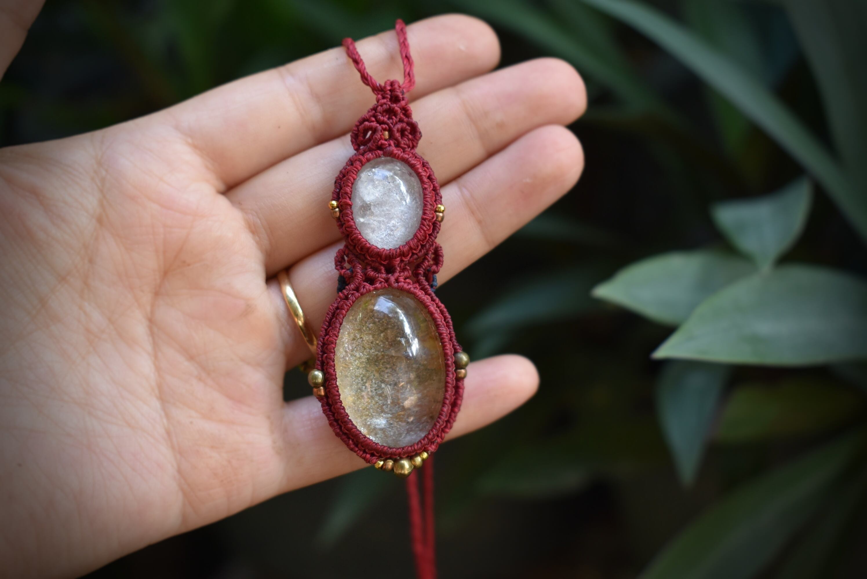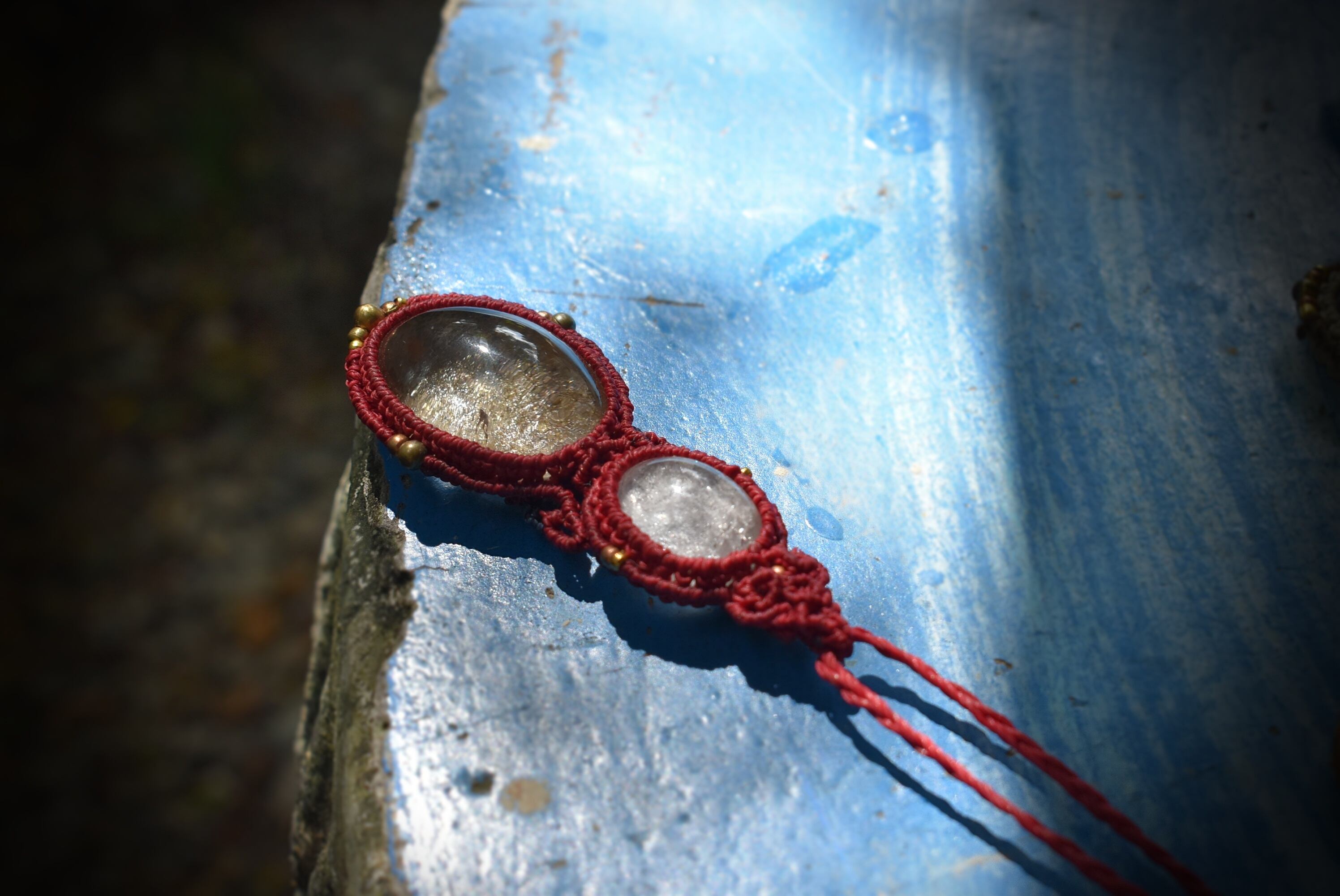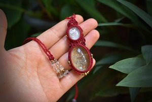 ふたつの美しい水晶を細い蝋引き糸を使用し、細やかにマクラメ編み装飾を施し、ペンダントに仕上げました。