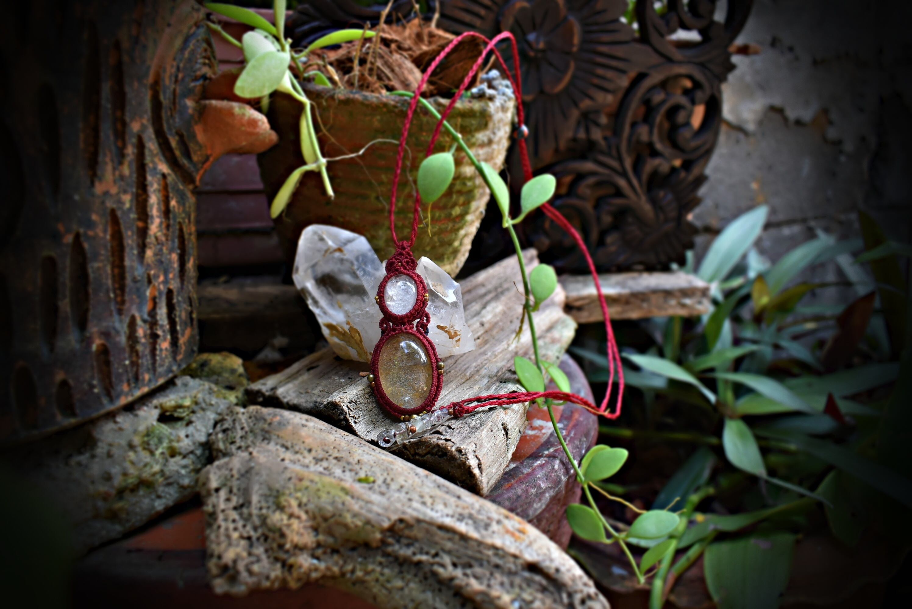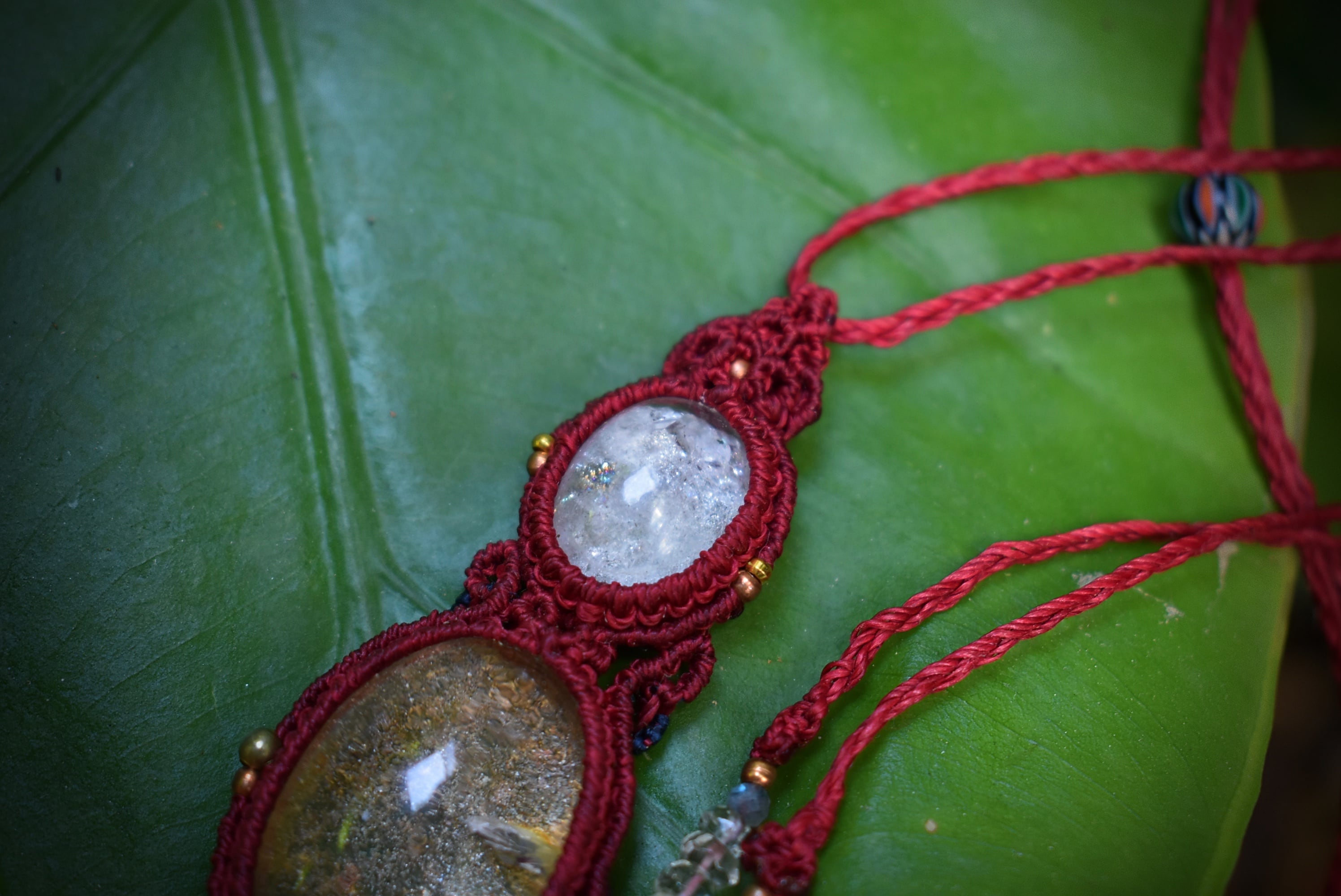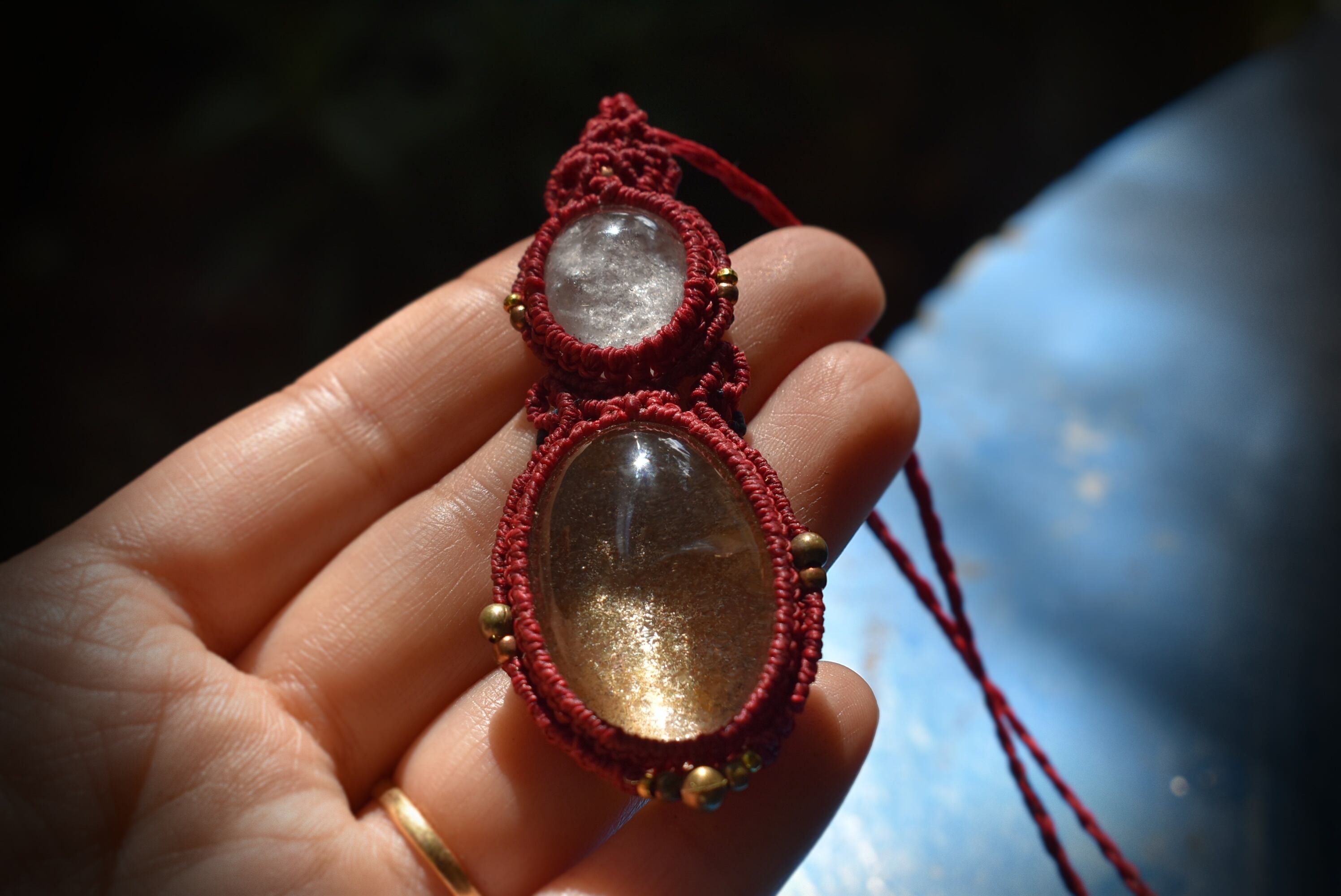 ふたつの美しい水晶を細い蝋引き糸を使用し、細やかにマクラメ編み装飾を施し、ペンダントに仕上げました。