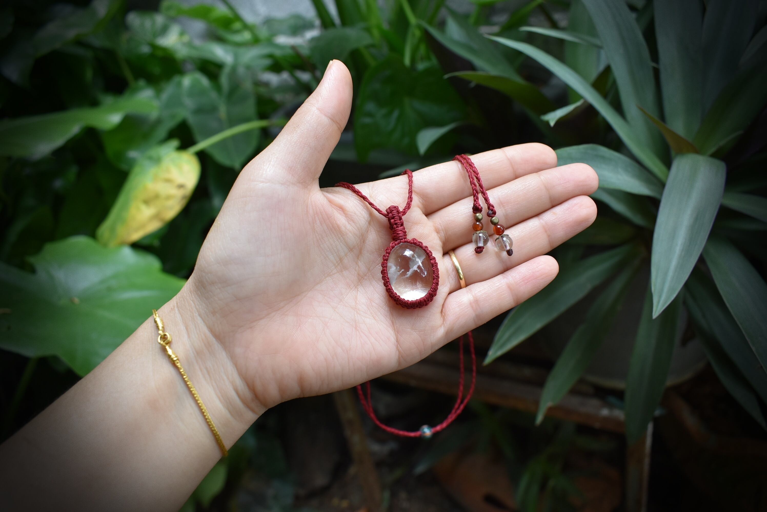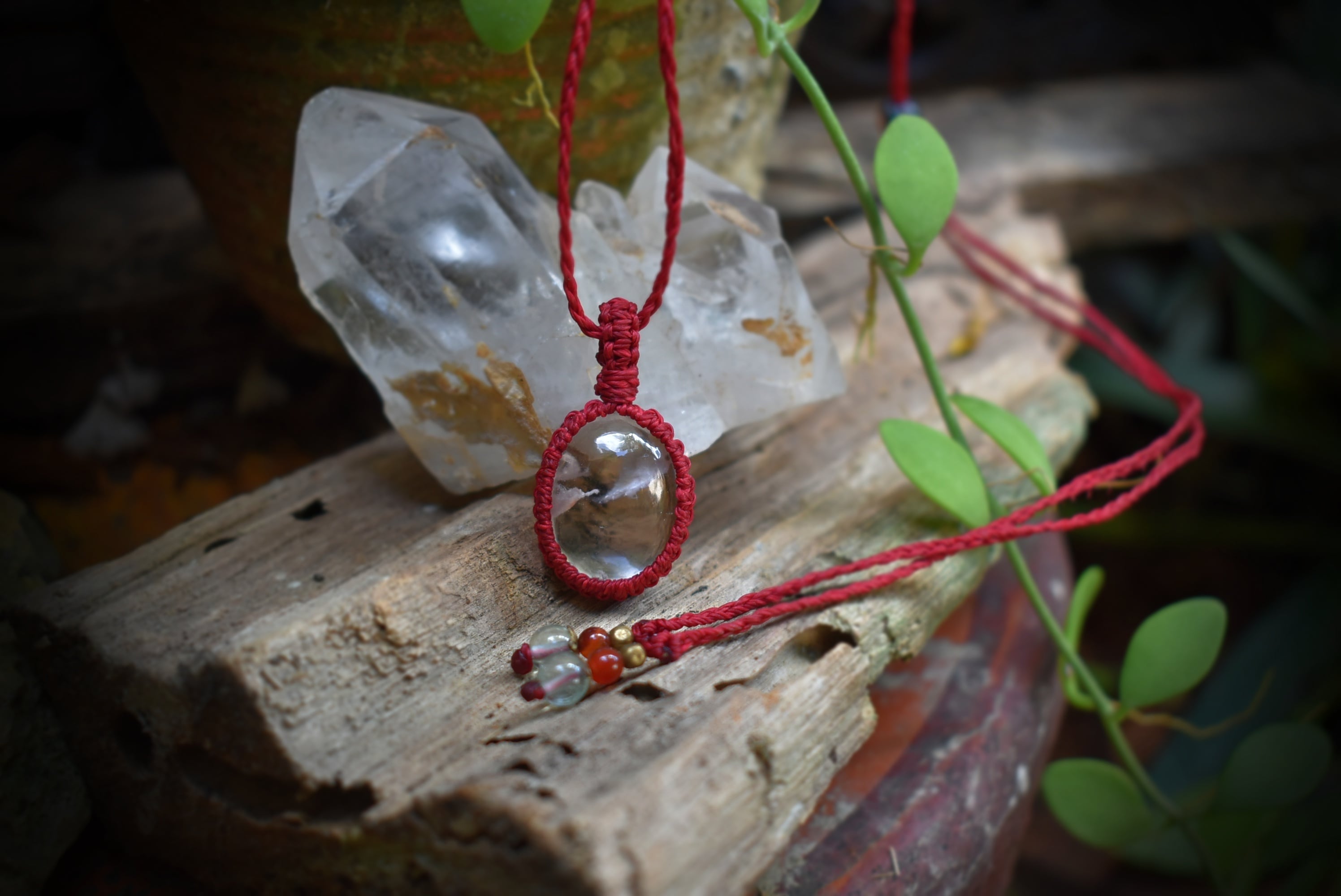 ◆このたびはディープレッドカラーの蝋引き糸を使用しマクラメ編み装飾を施しました。