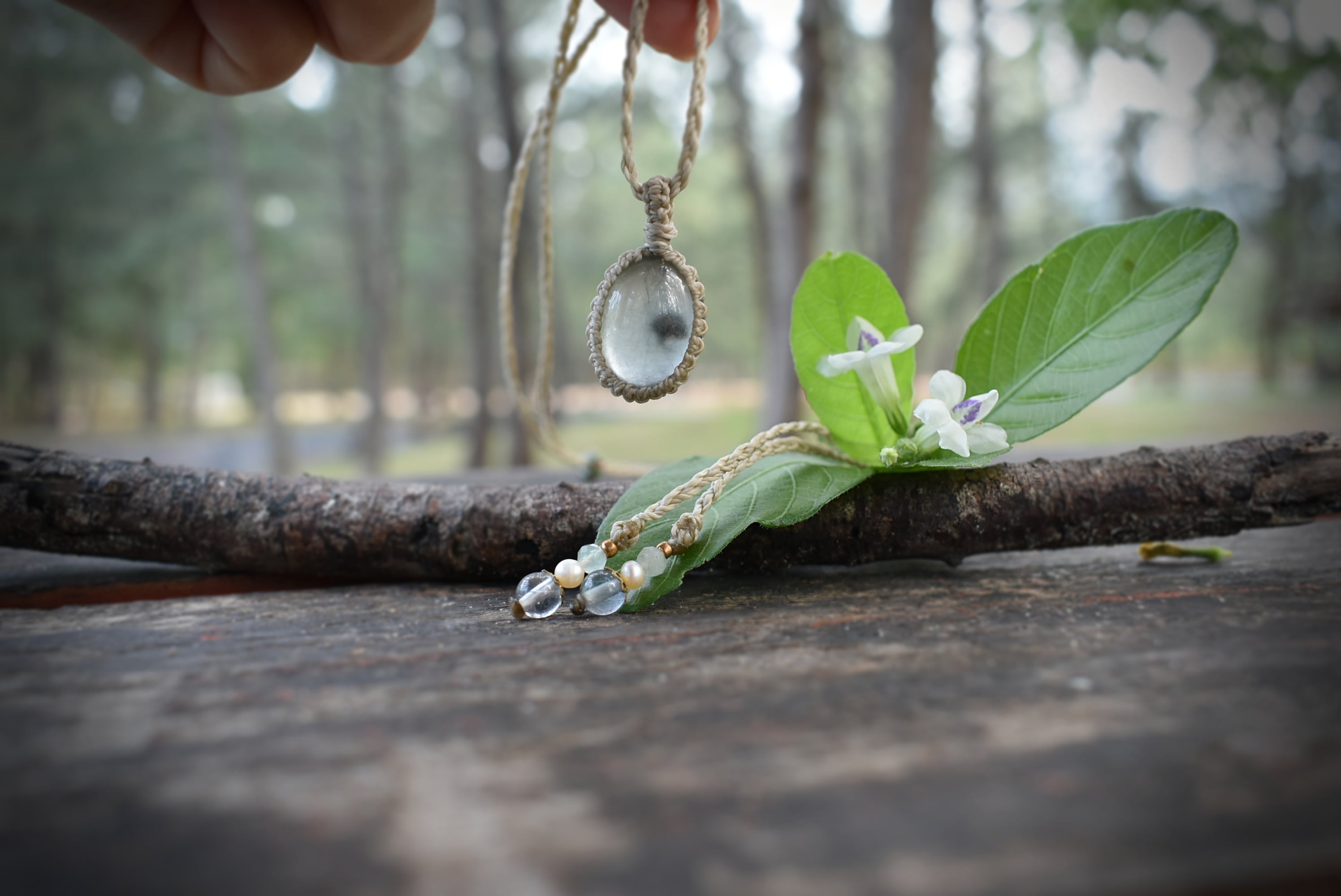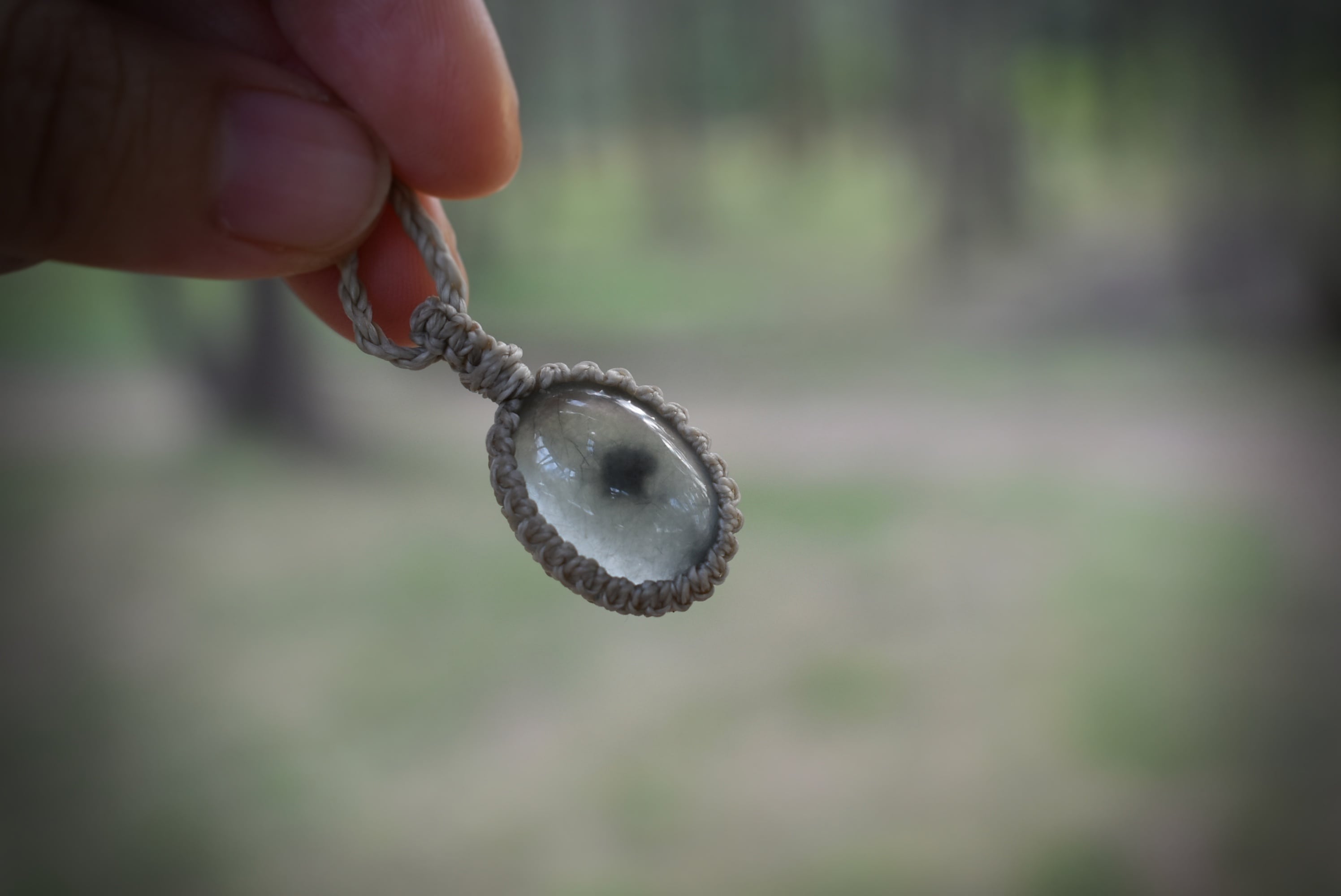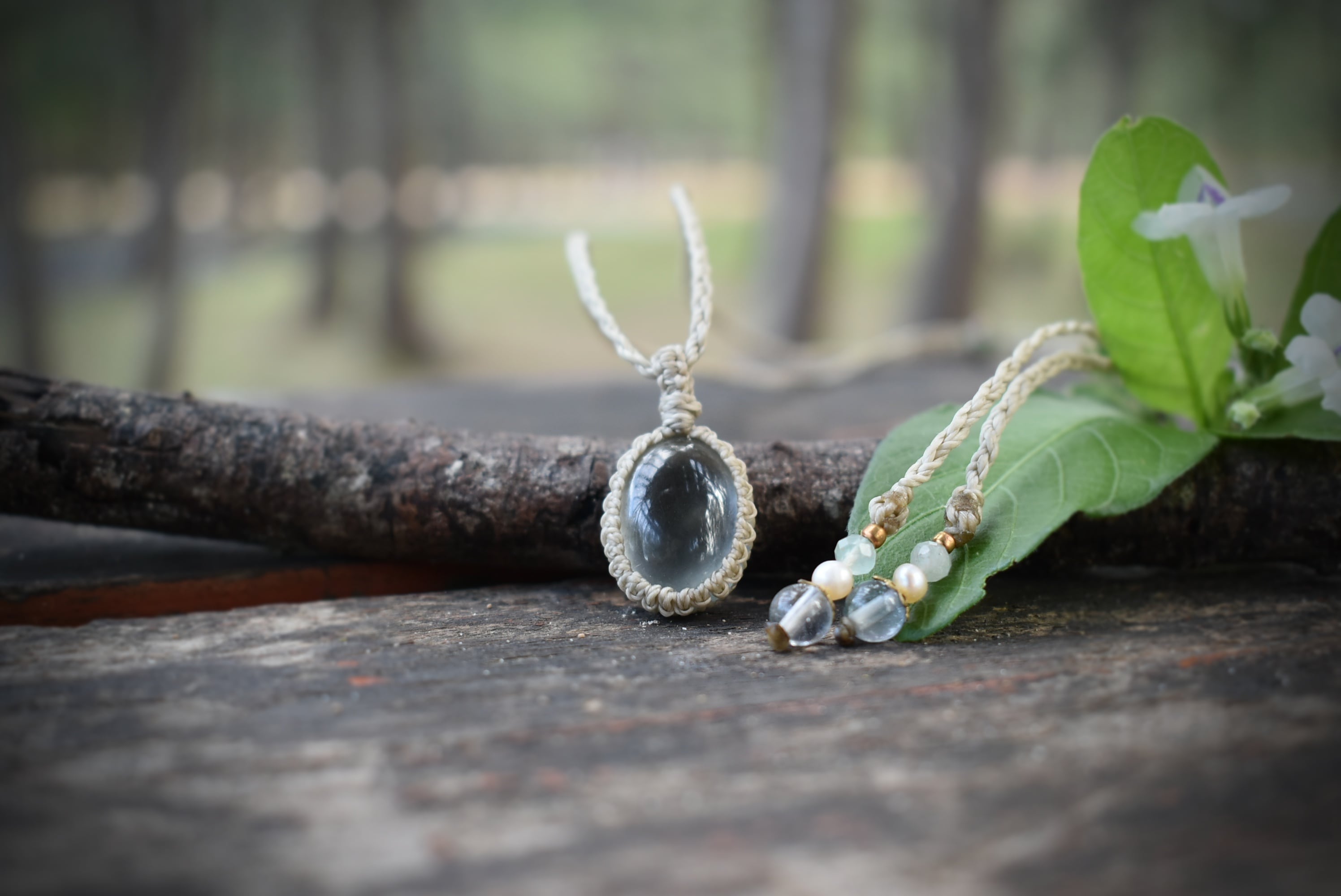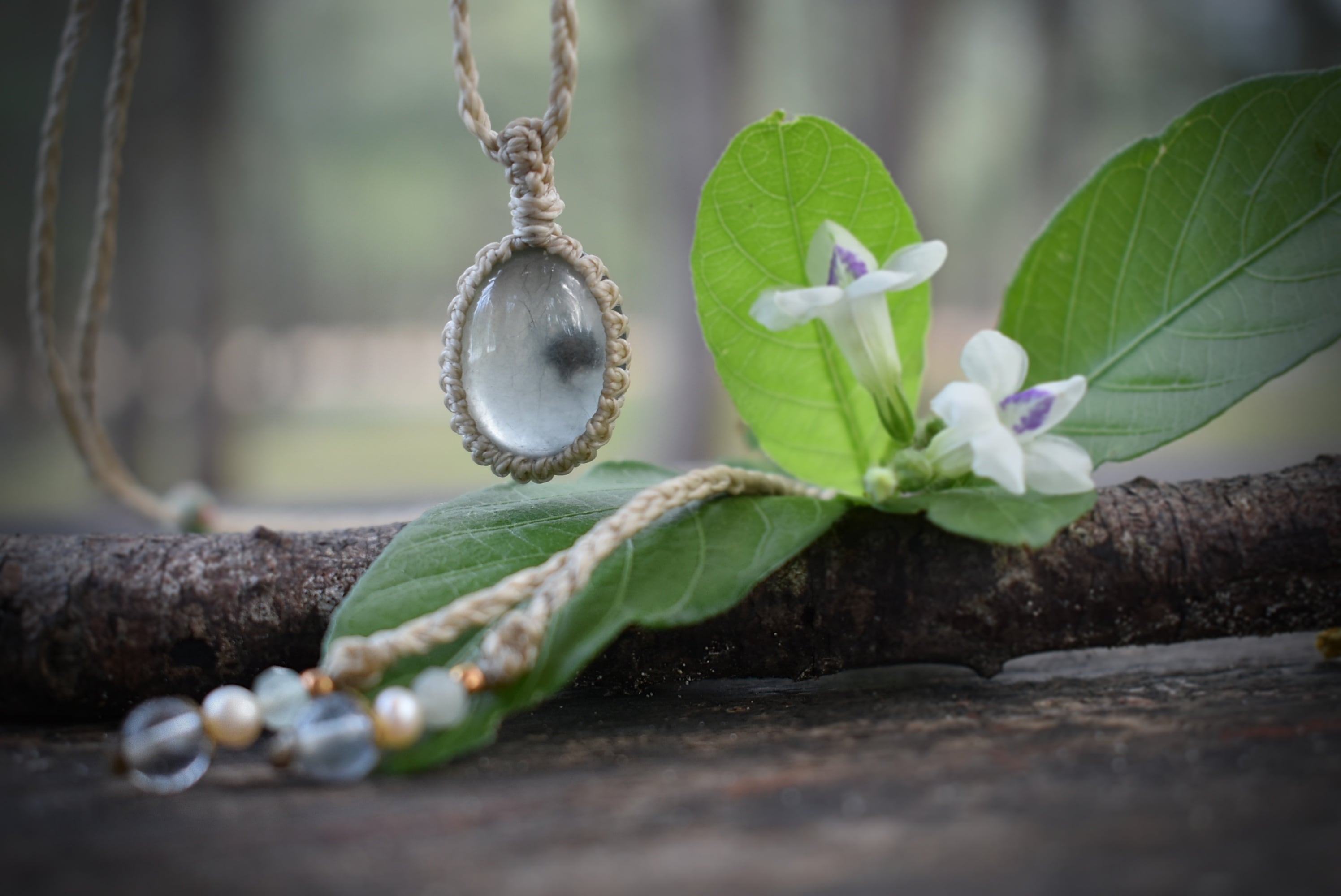 この石をシンプルにマクラメ編み装飾を施し、身につけられるようペンダントに仕上げました。