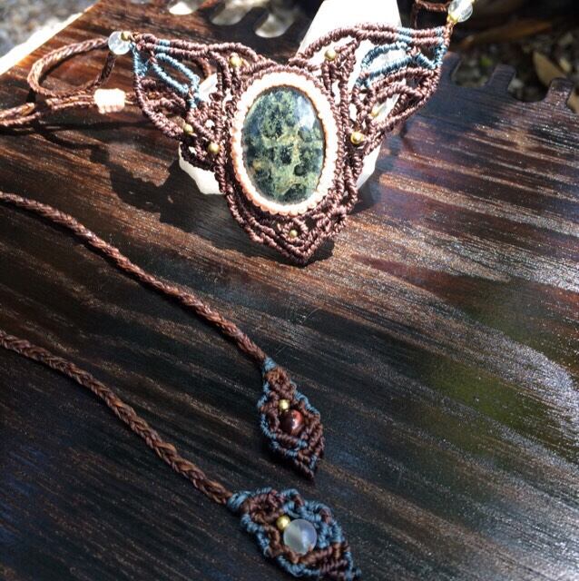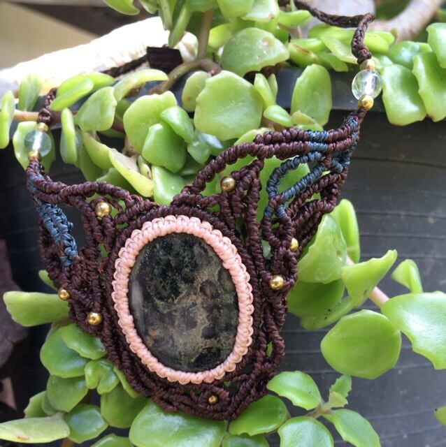 マダガスカル産のカンババジャスパーをマクラメ編み装飾しました。深く渋い色合いのジャスパーです。