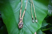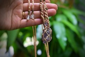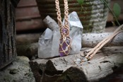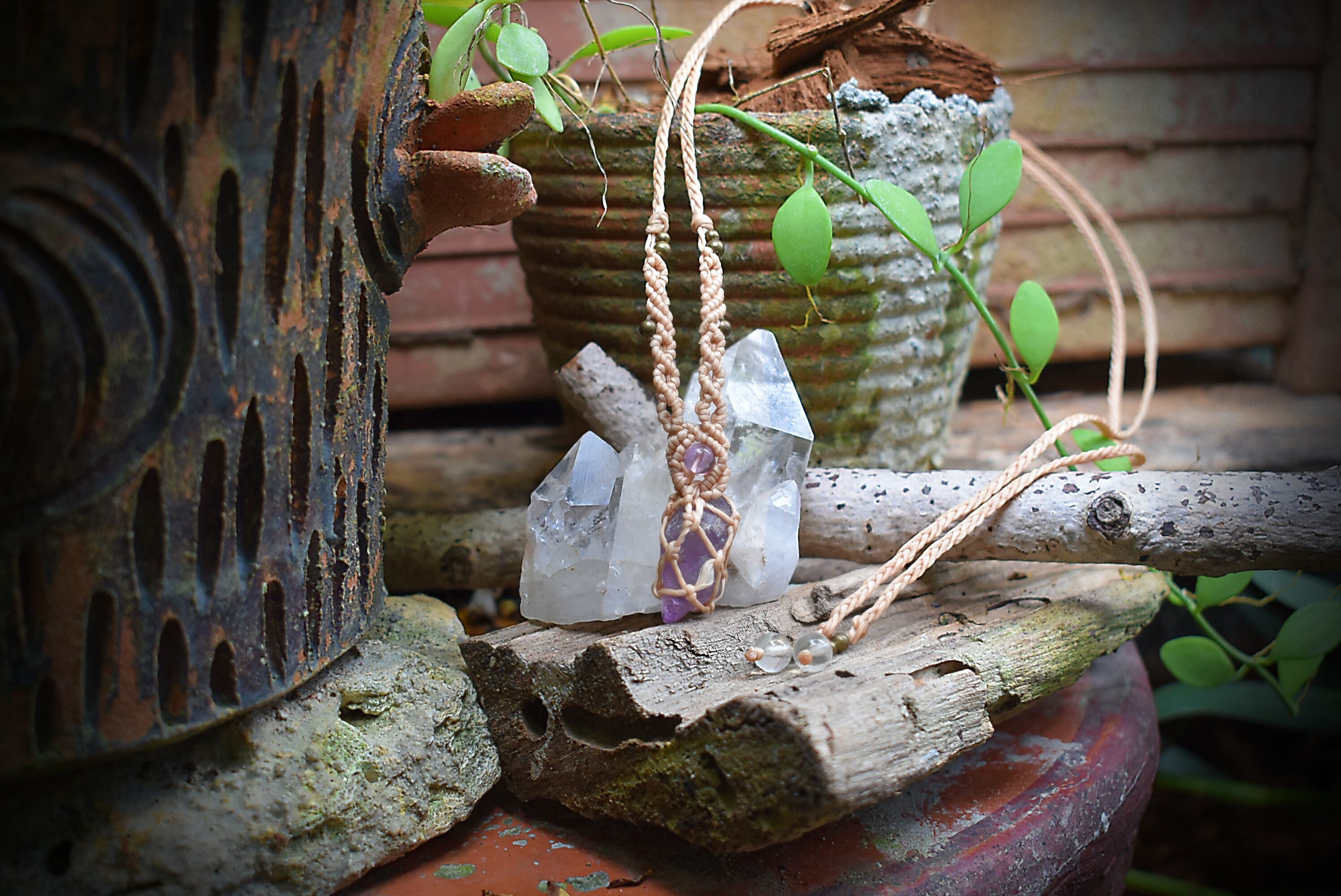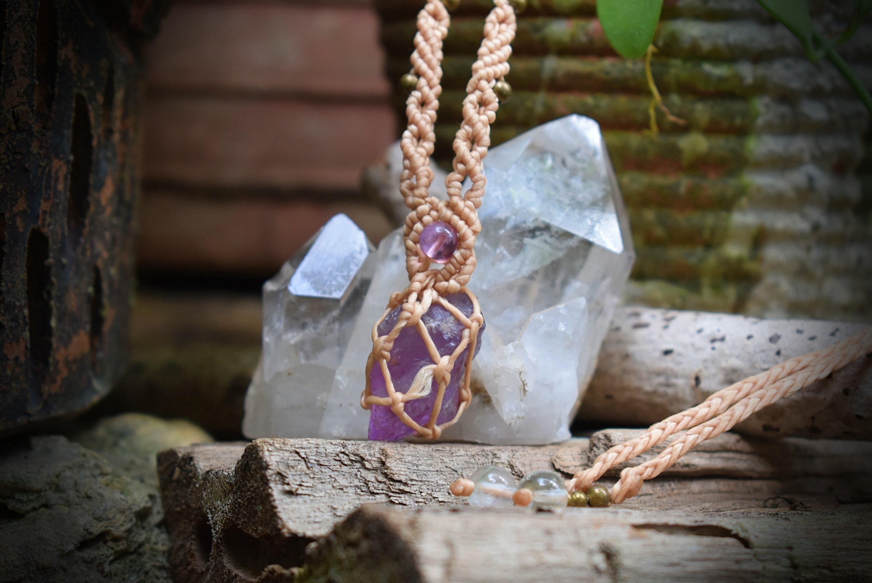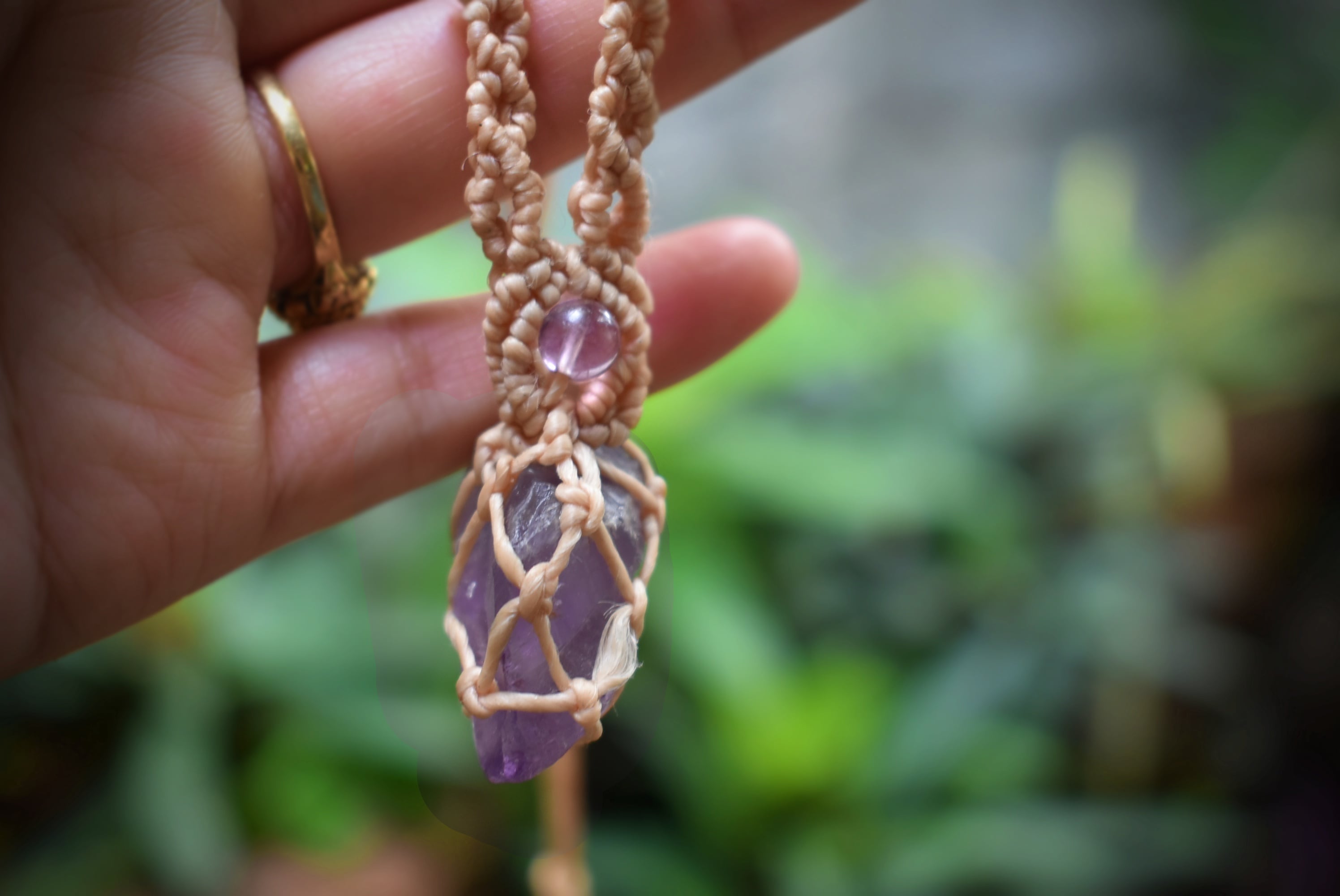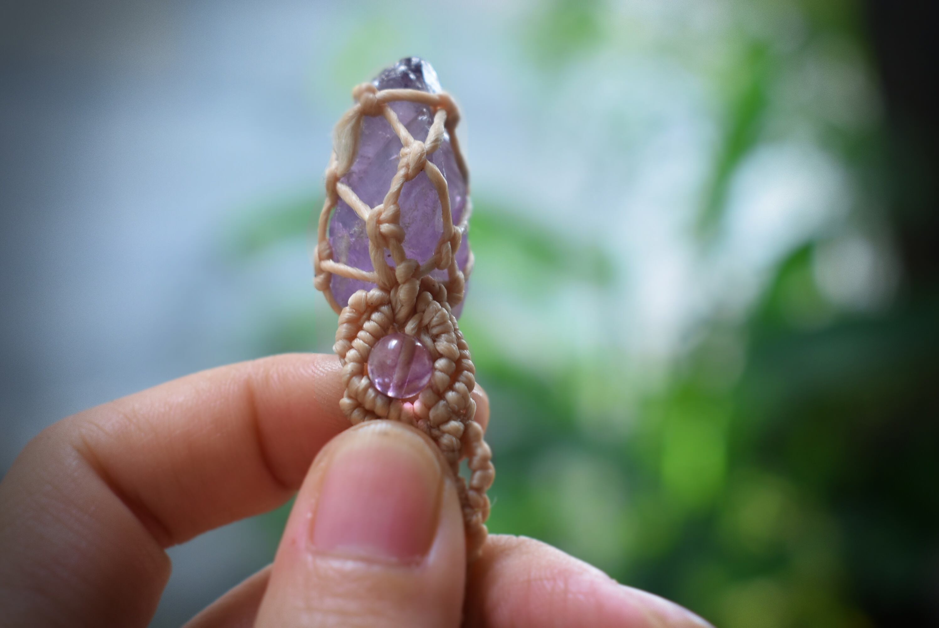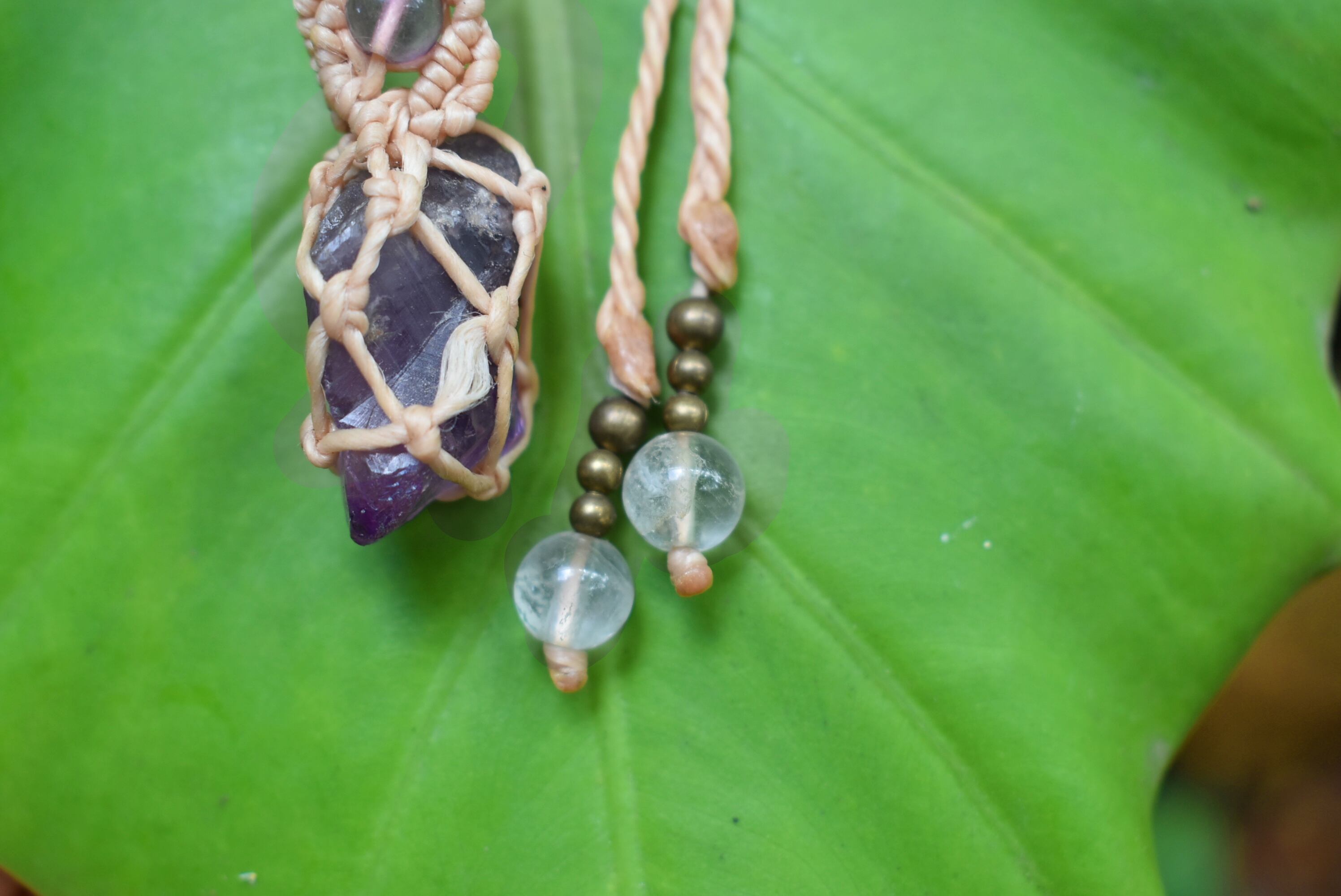 透明感溢れる高品質なアメジスト原石を原石全体を大切に包み込むようにして、編み込み、ネックレス部分をマクラメ編み装飾を施してネックレスへと仕上げました。