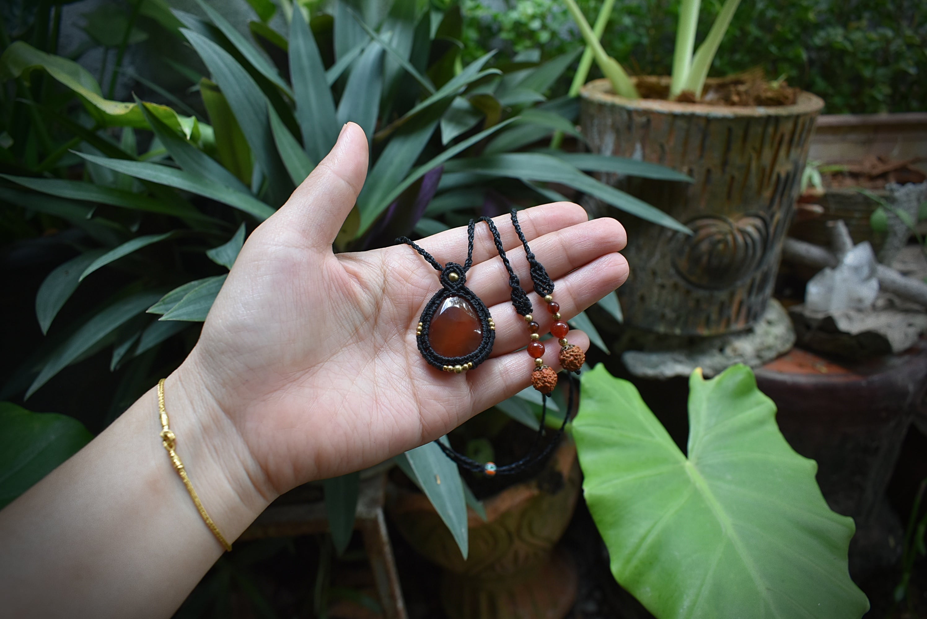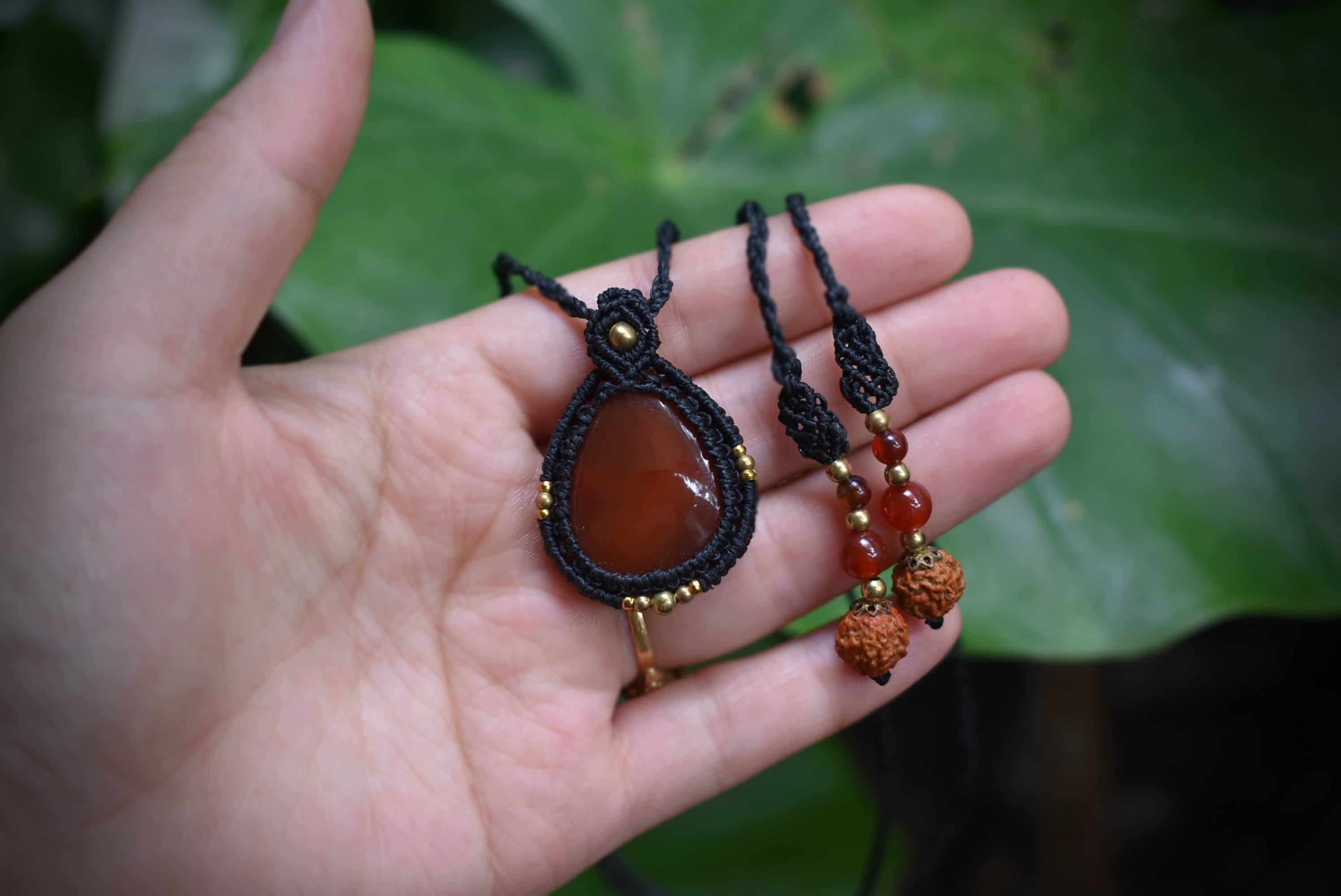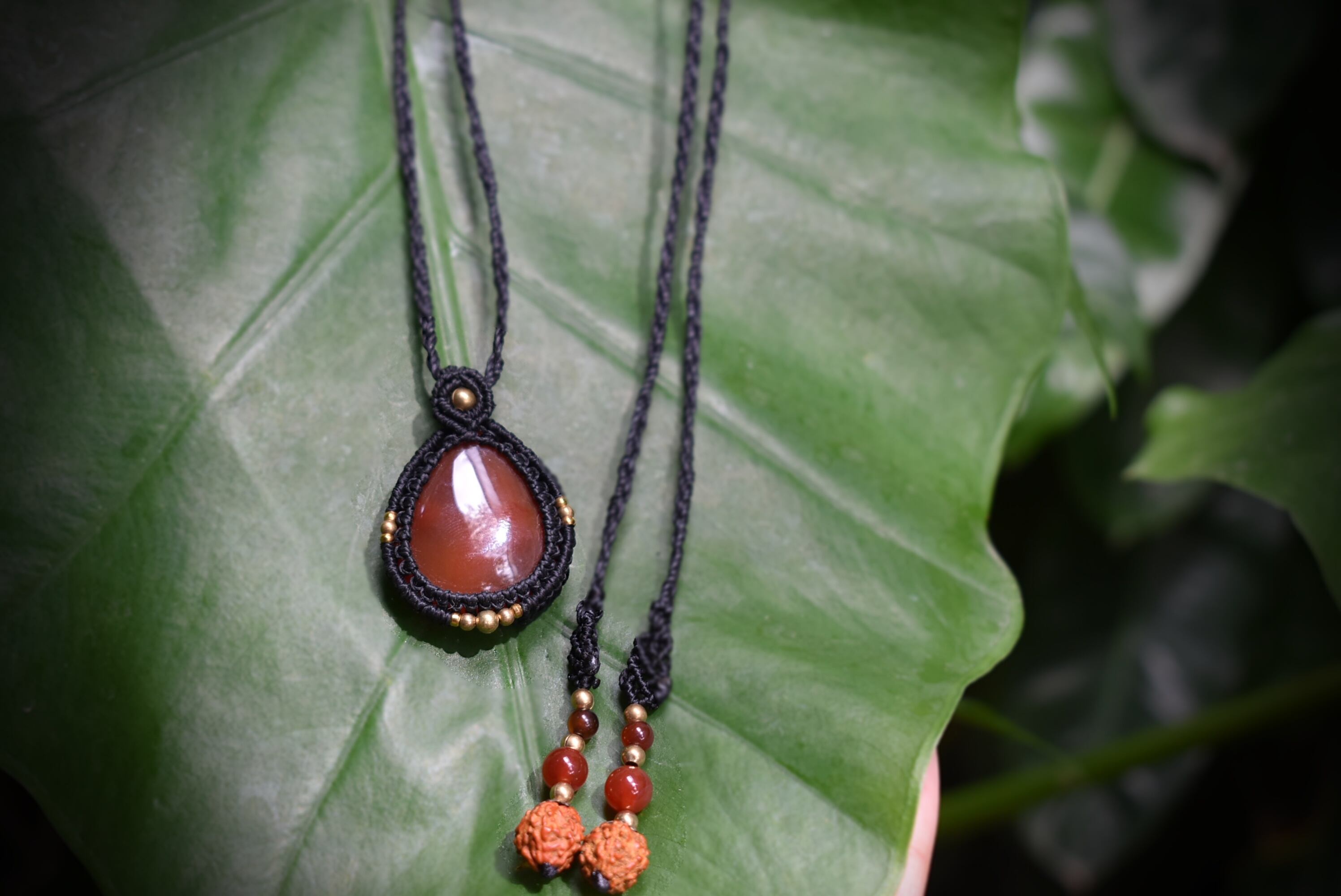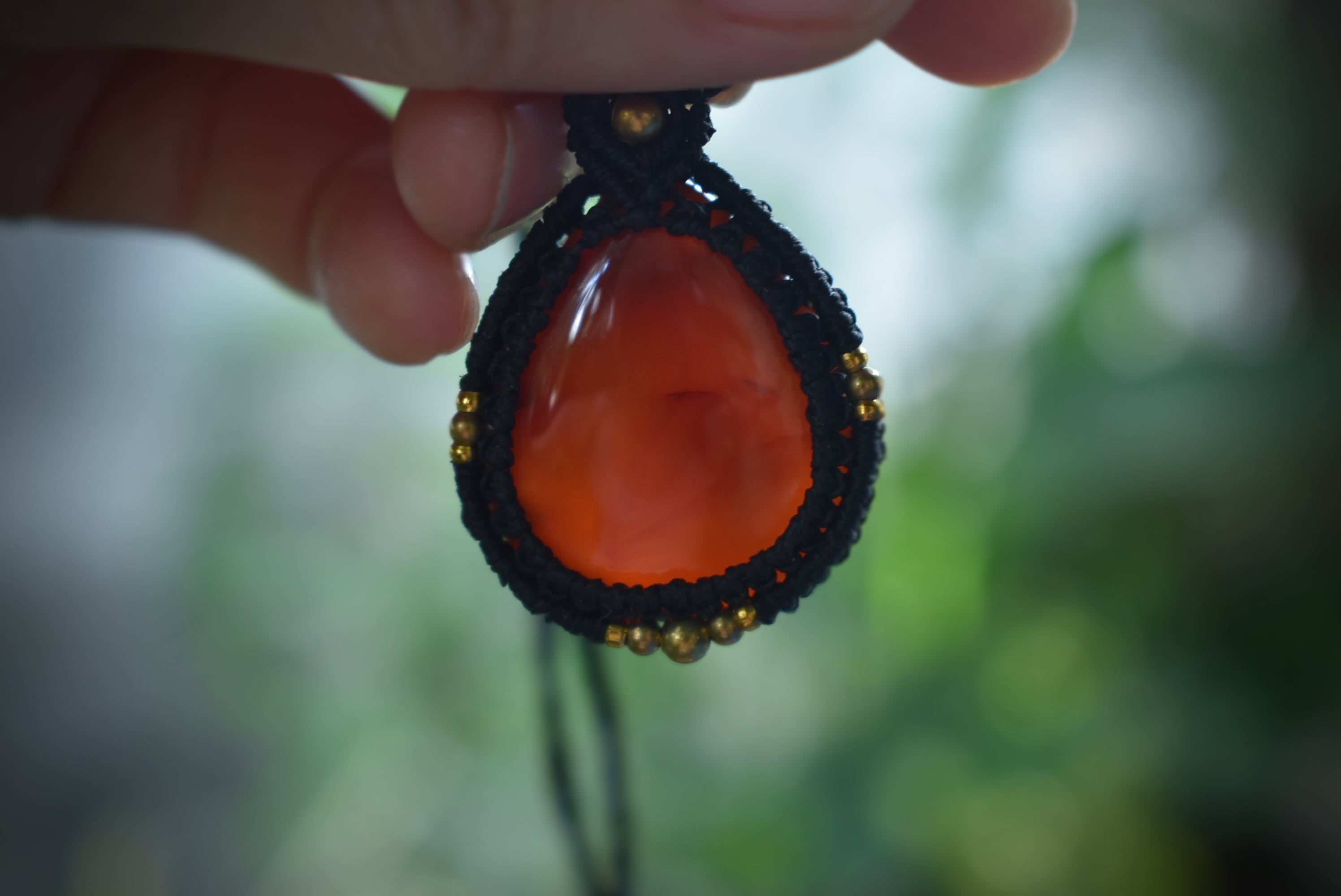 紅く艶やかなカーネリアンルースを使用してマクラメ編み装飾を施し、ペンダントに仕上げました。