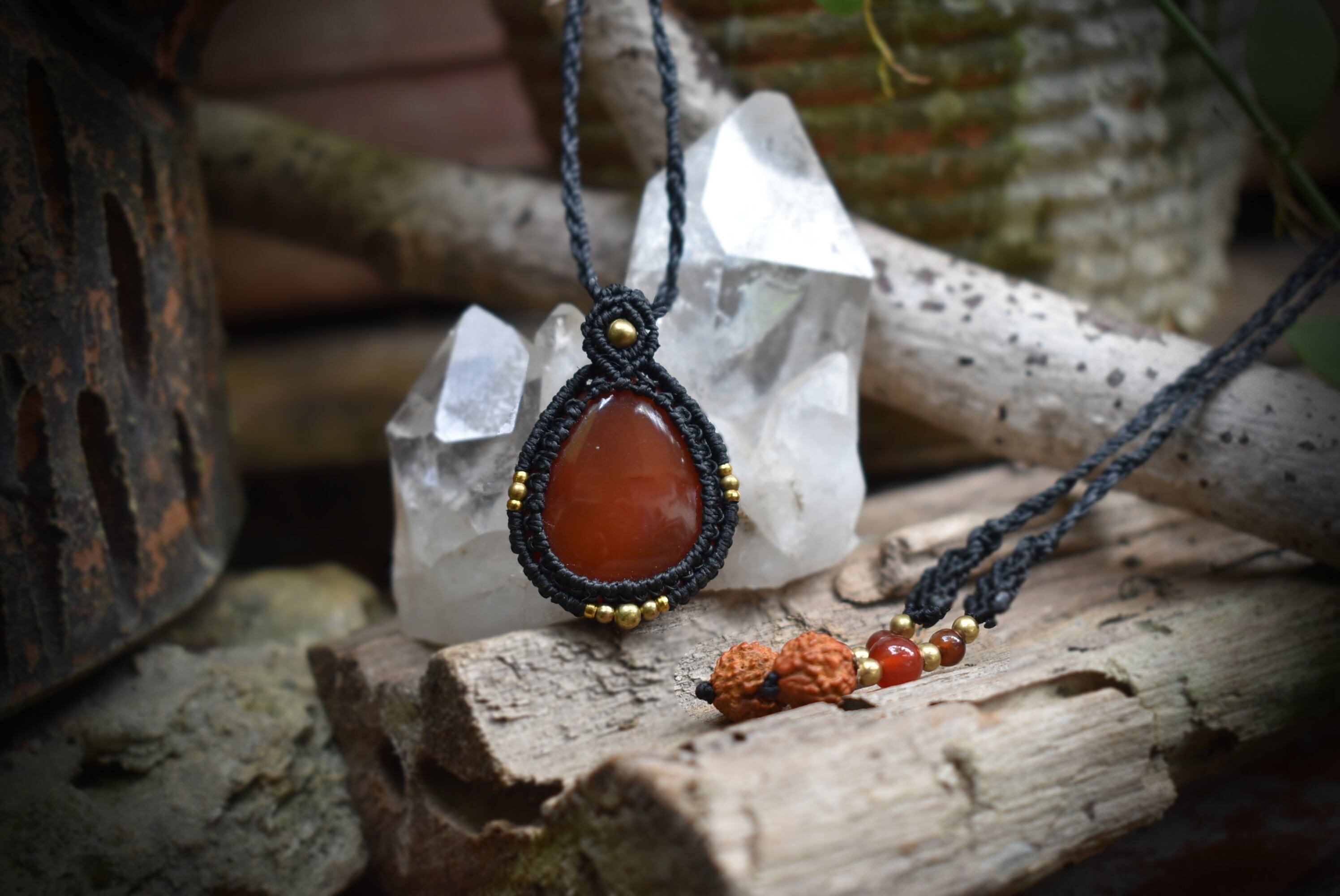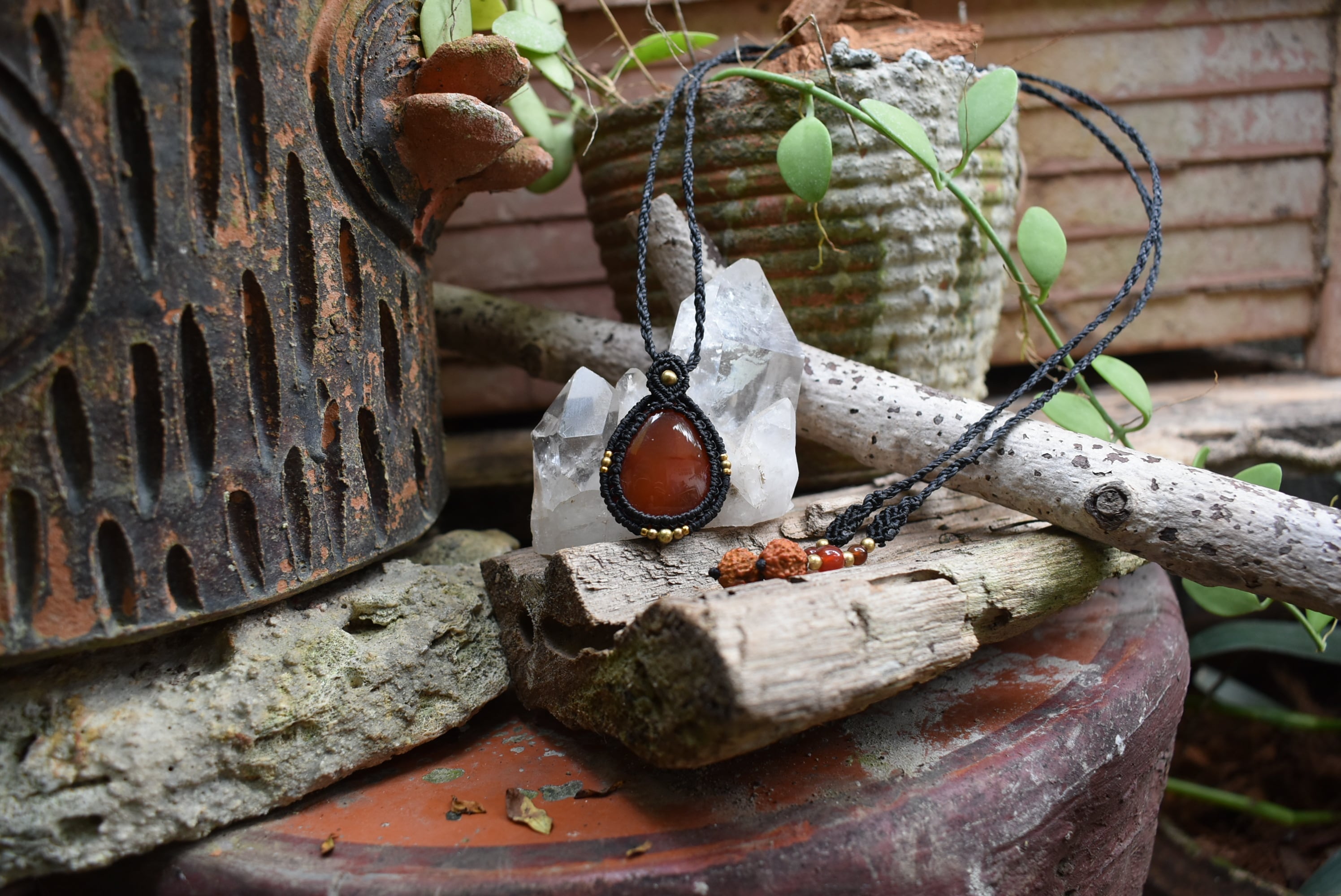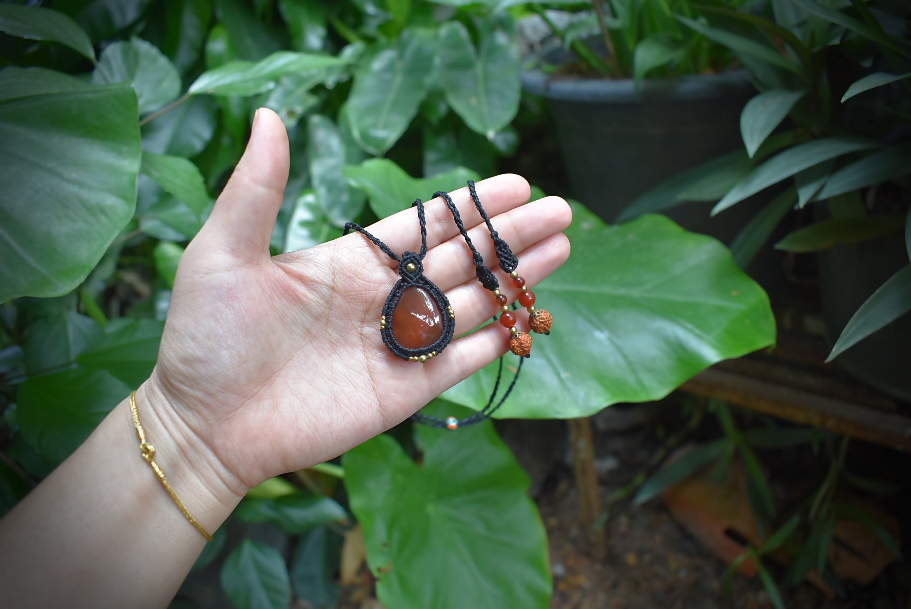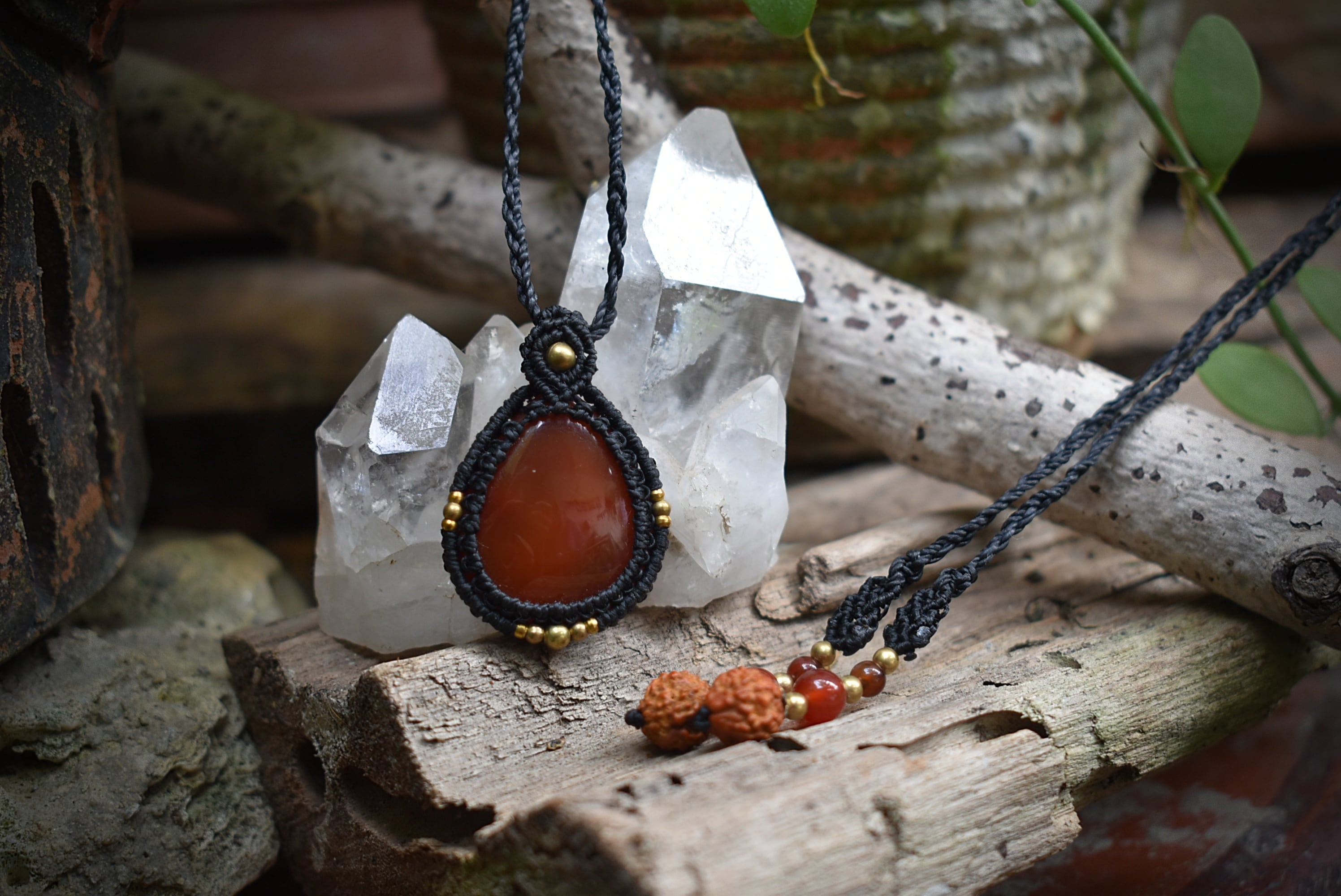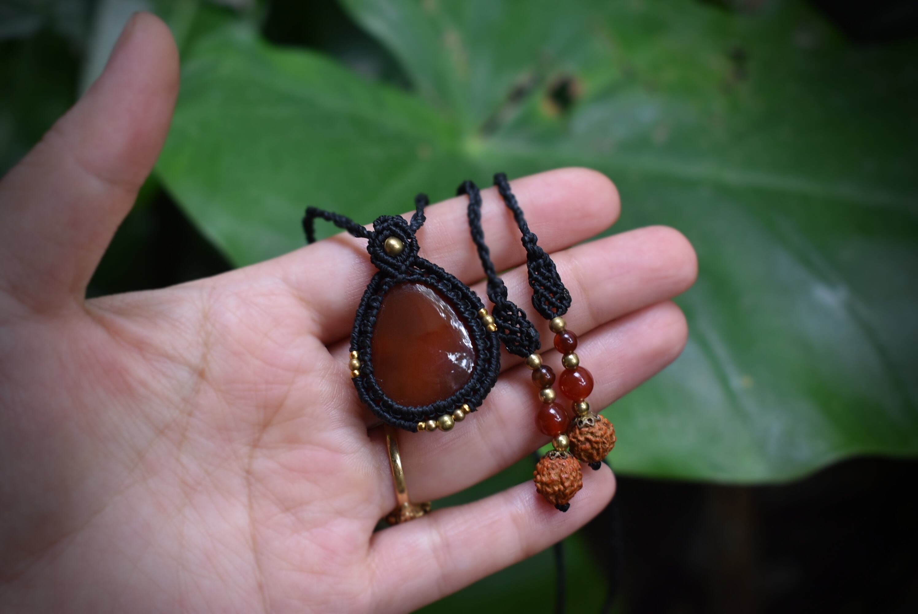 紅く艶やかなカーネリアンルースを使用してマクラメ編み装飾を施し、ペンダントに仕上げました。