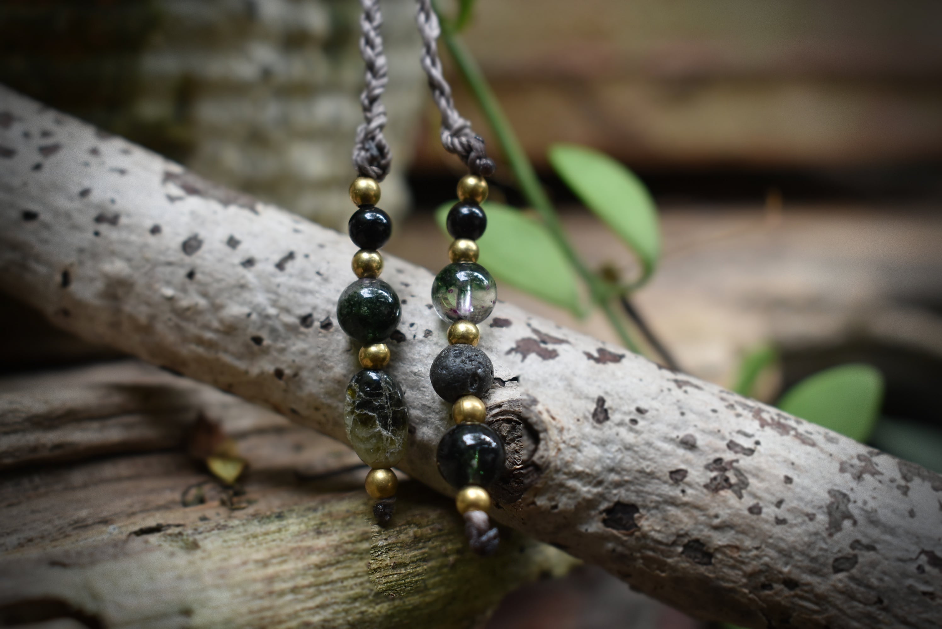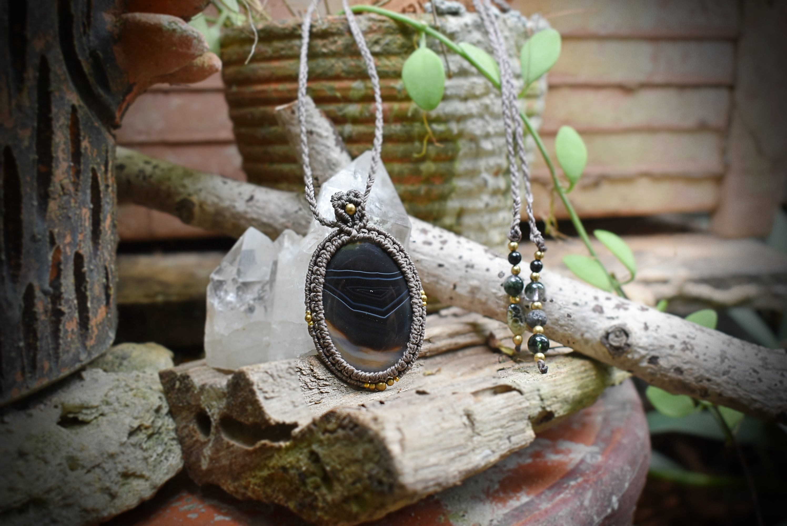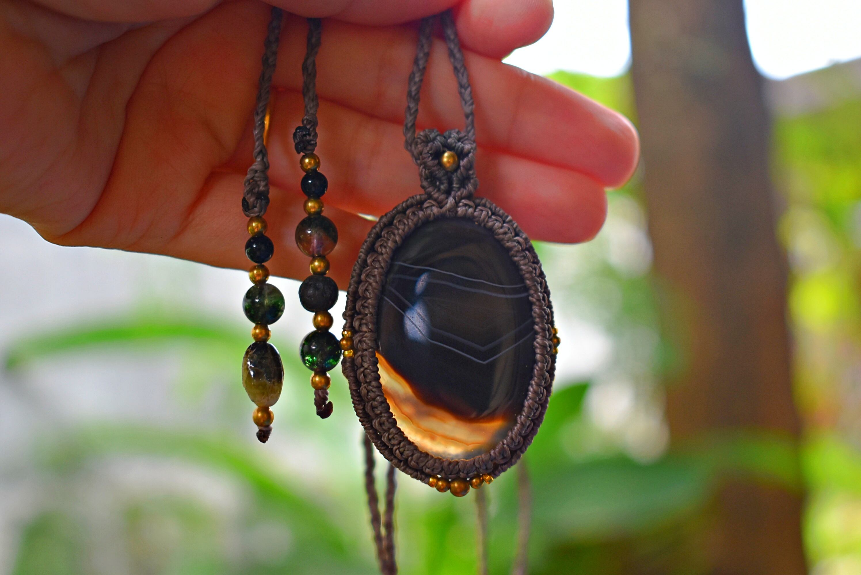 このめずらしいタイプのこの石をこのたび真鍮ビーズを組み合わせてマクラメ編み装飾を施し、ペンダントに仕上げました。