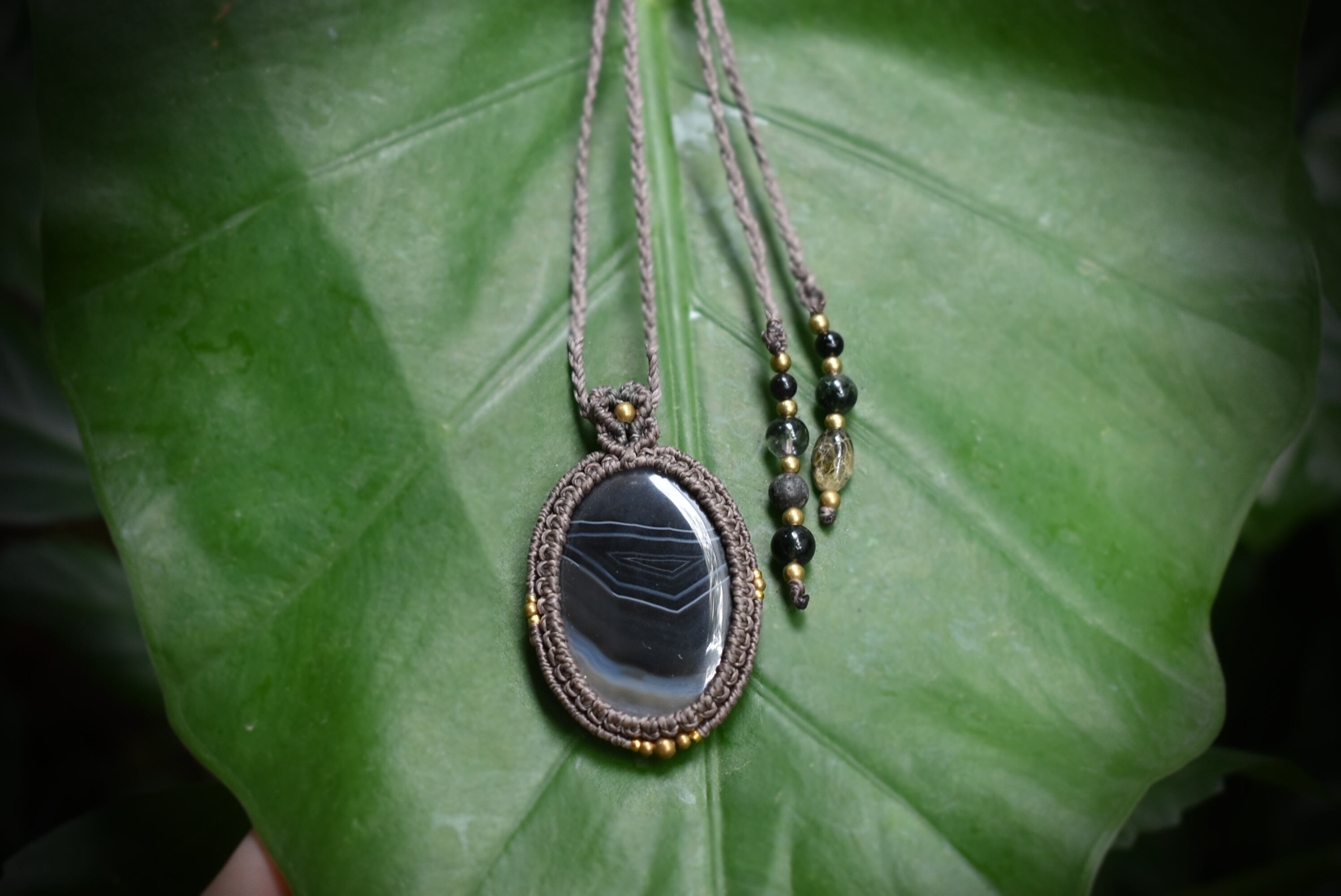 芸術模様★瑪瑙★ブラックアゲート マクラメペンダントage004