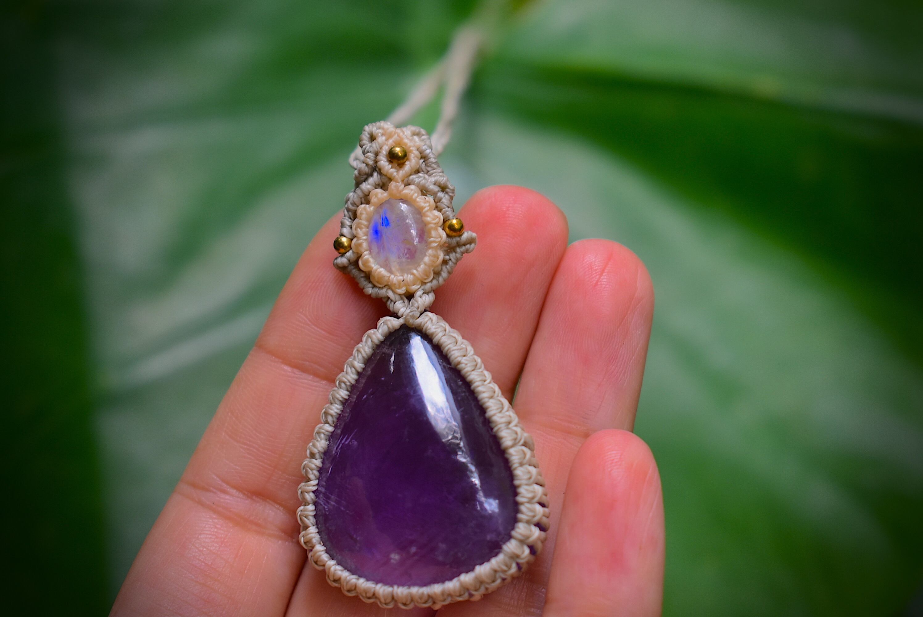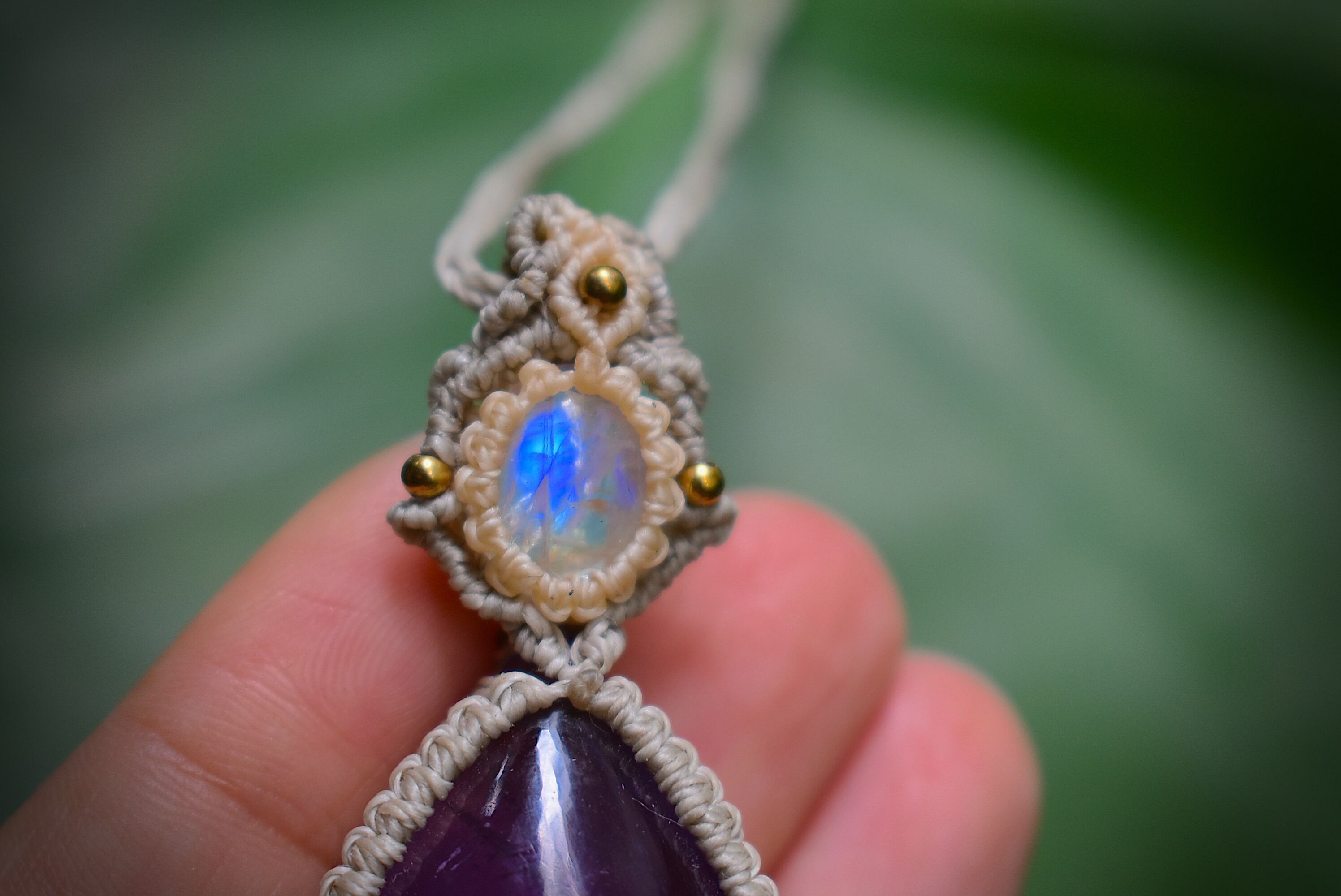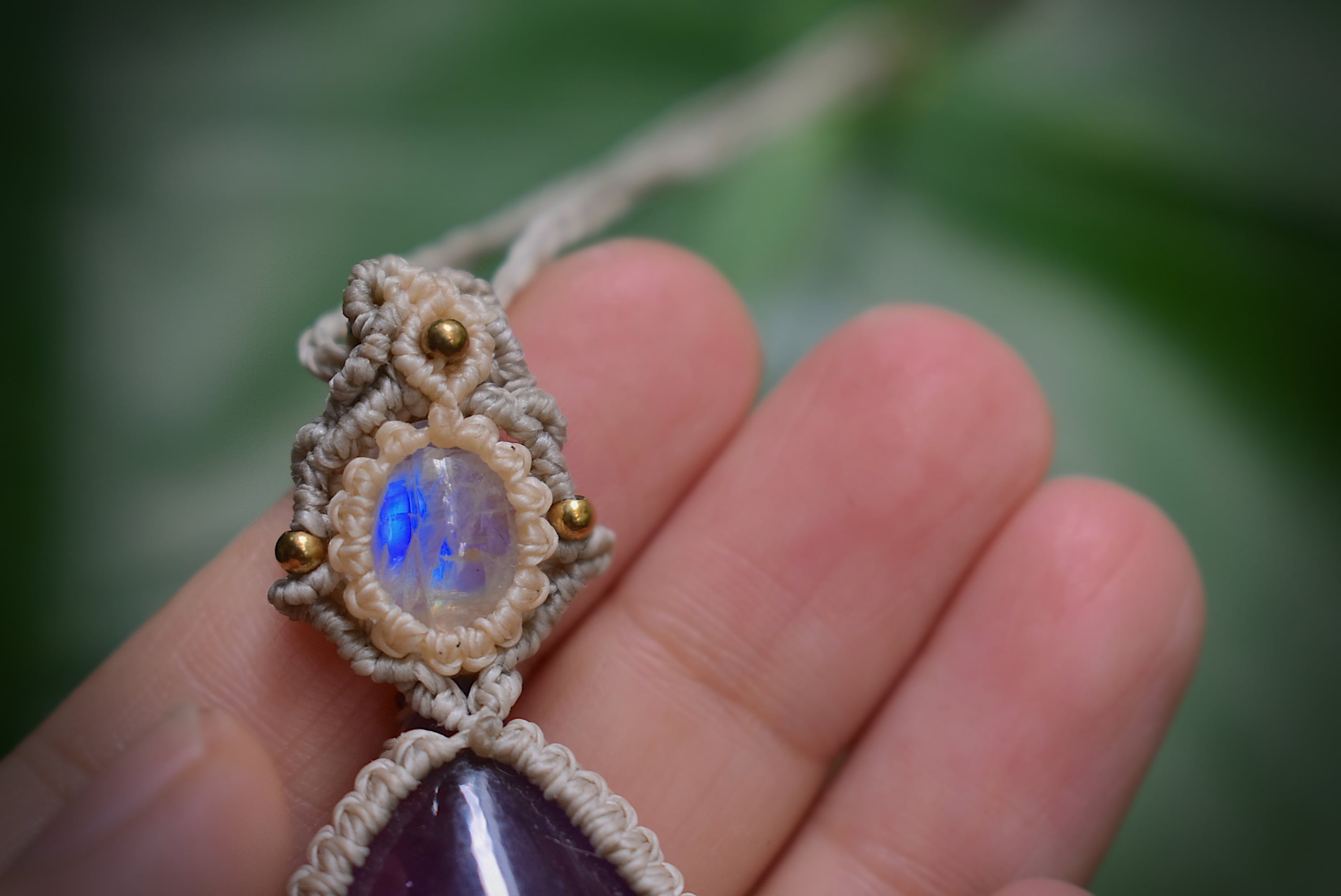 ロイヤル級★ロイヤルブルームーンストーンとアメジスト マクラメペンダント