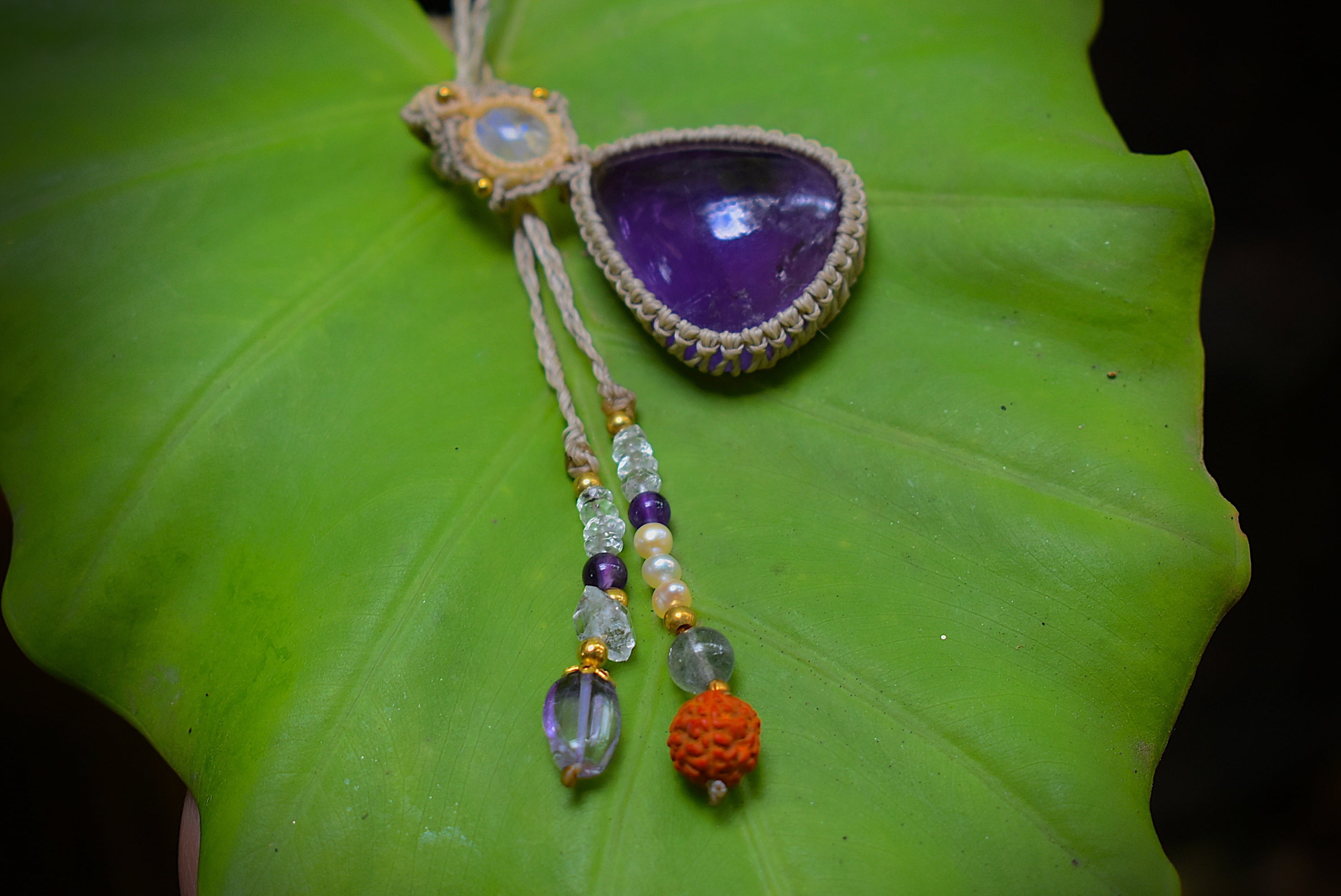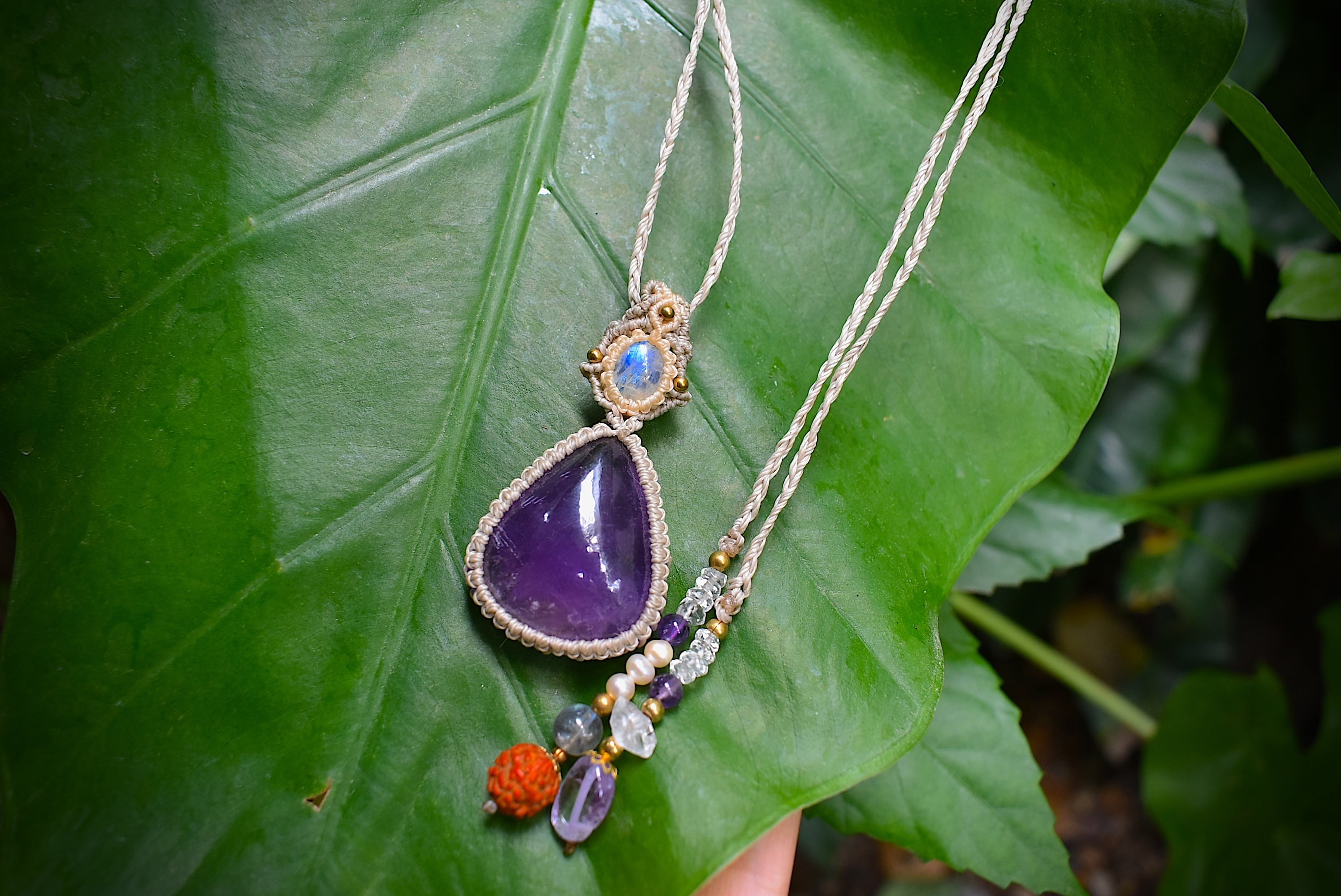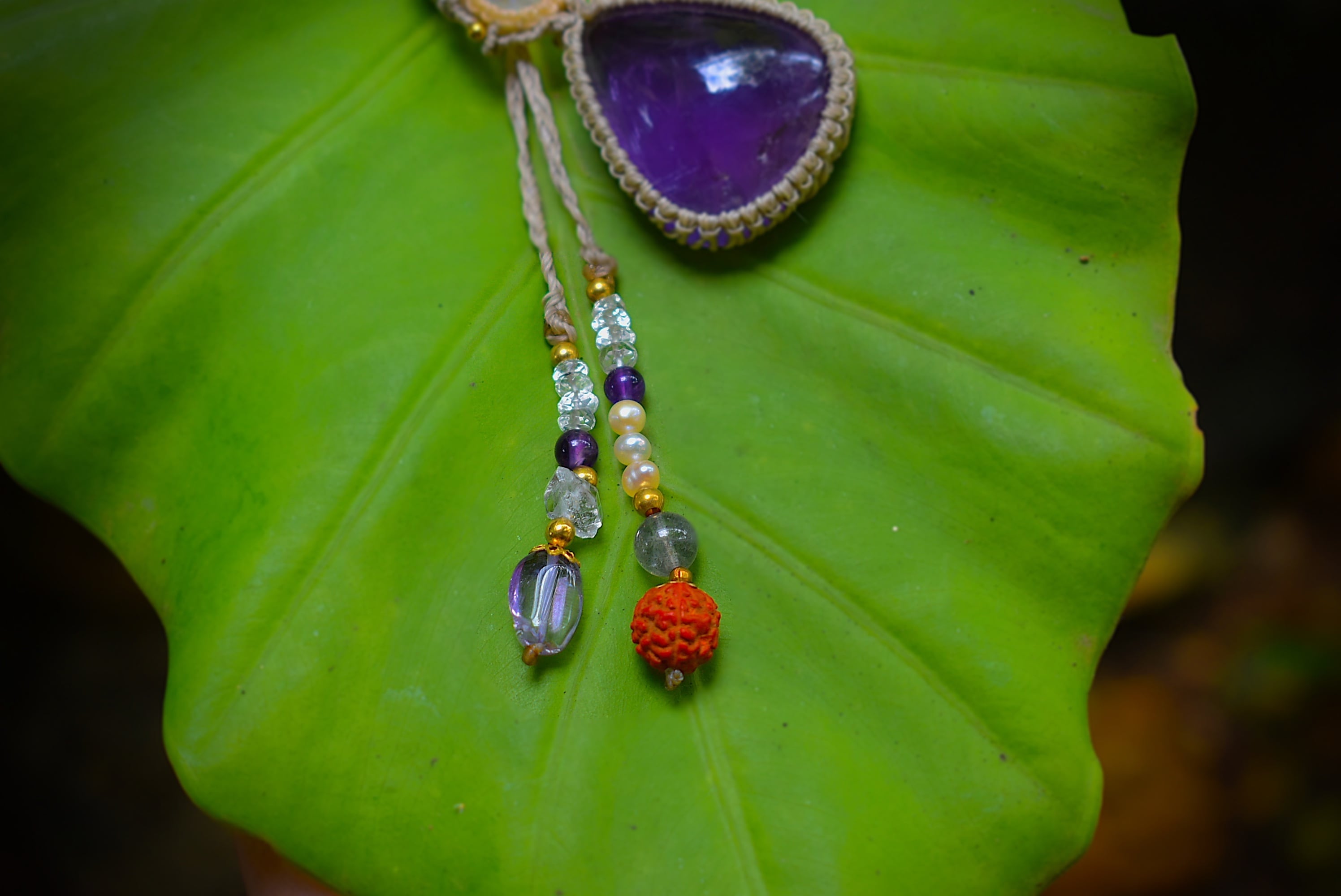 石の中のパープルカラーのシラーとグラデーションが良質な天然石アメジストを使用し、マクラメ編み装飾を施し、ペンダントに仕上げました。