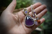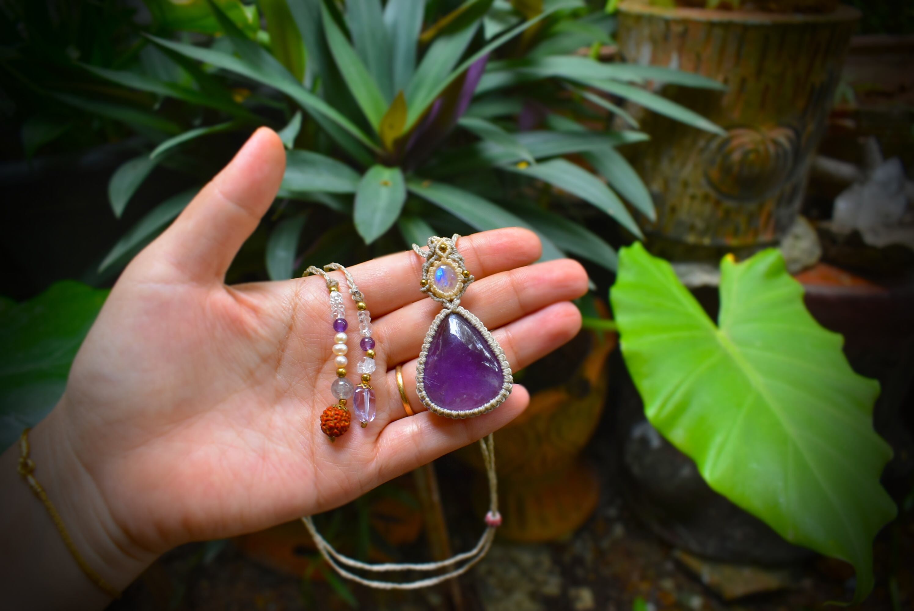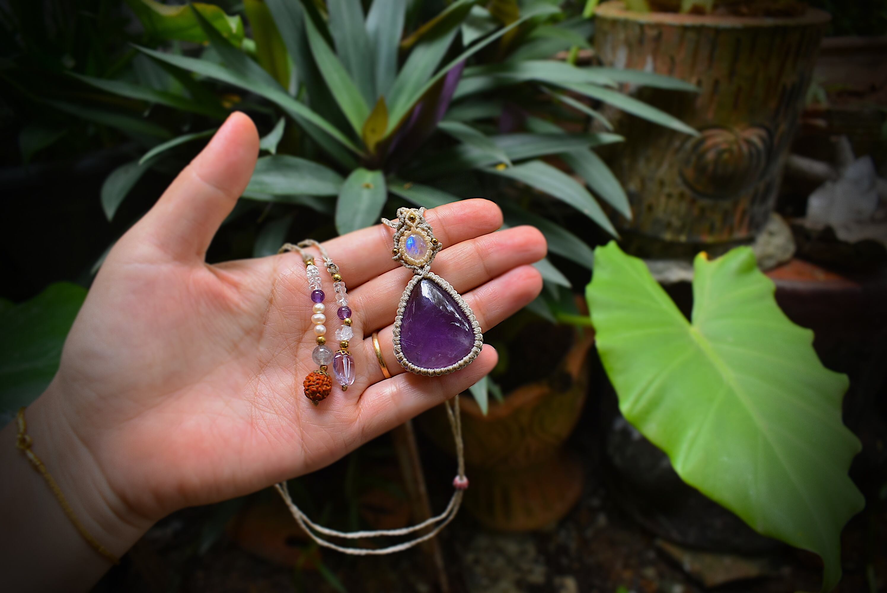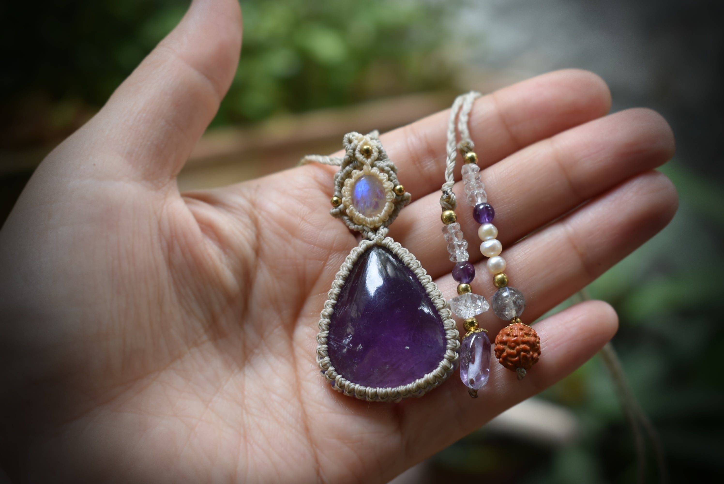石の中のパープルカラーのシラーとグラデーションが良質な天然石アメジストを使用し、マクラメ編み装飾を施し、ペンダントに仕上げました。