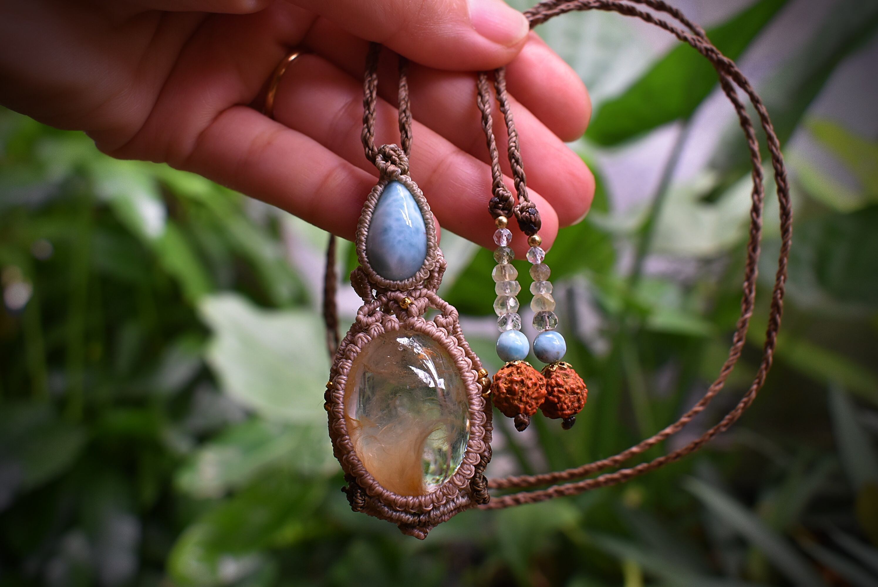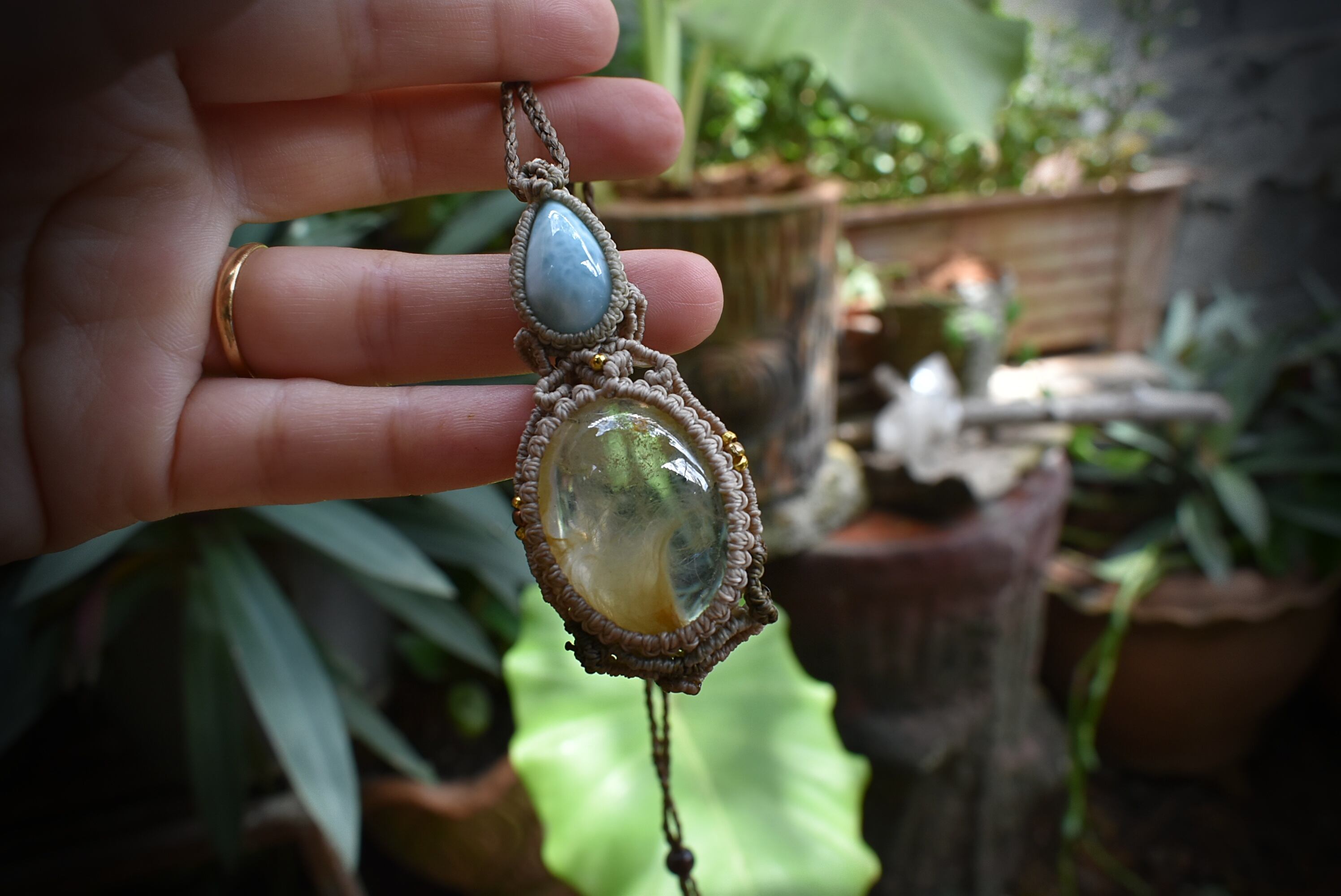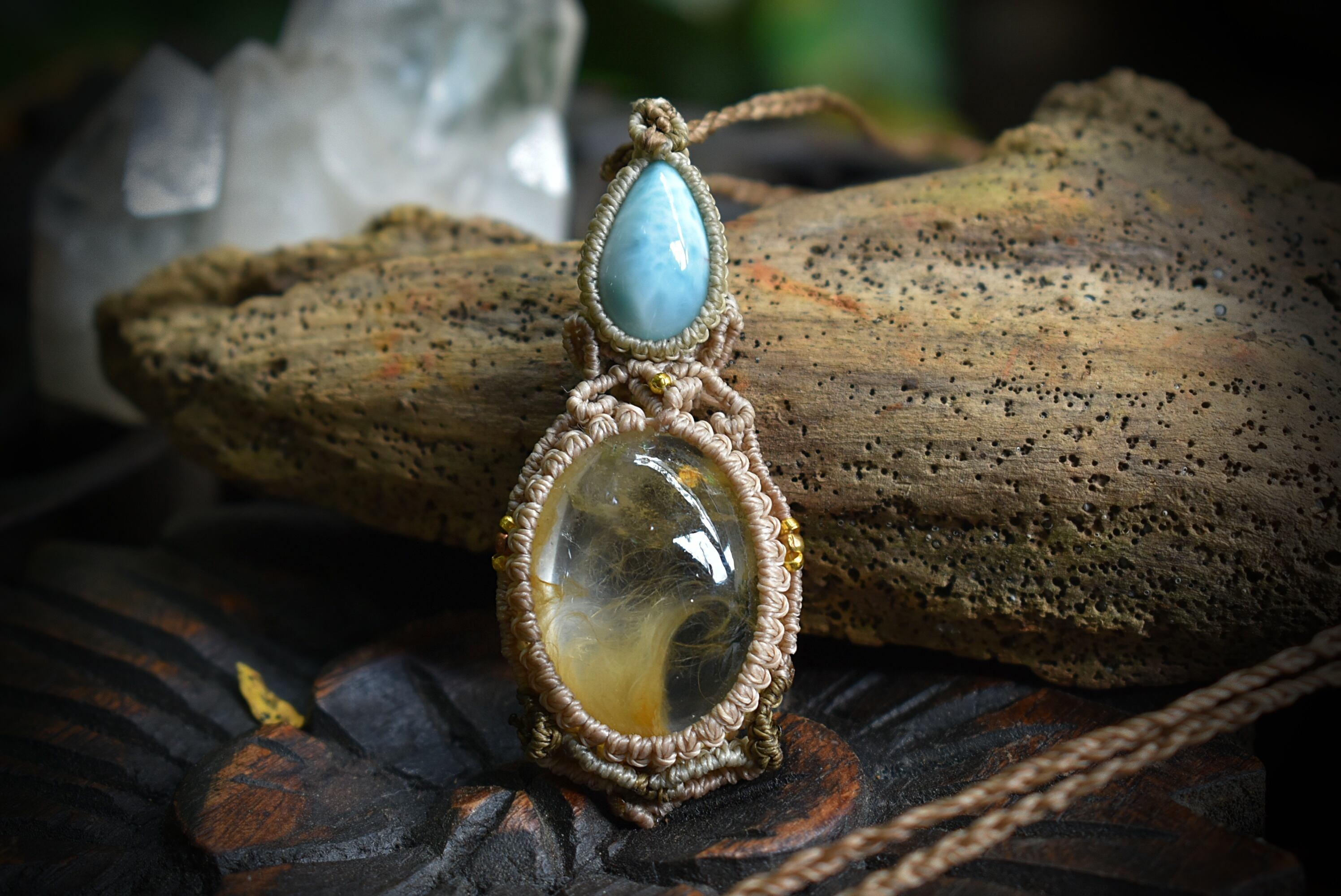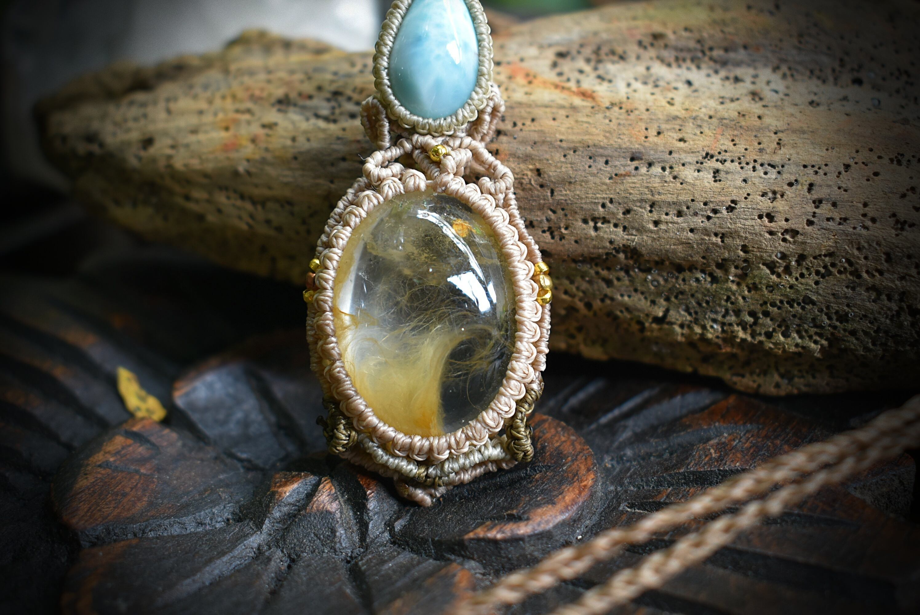 フェザー柄が特徴的なイエローガーデンクォーツを掛け合わせ、大らかな妖精をイメージしてマクラメ編みを施し、ペンダントに仕上げました。