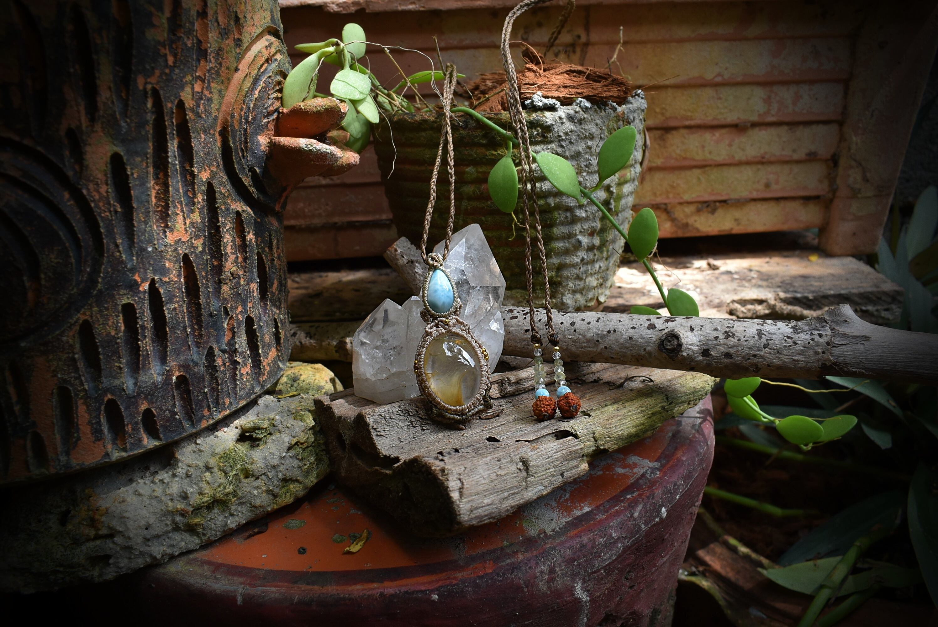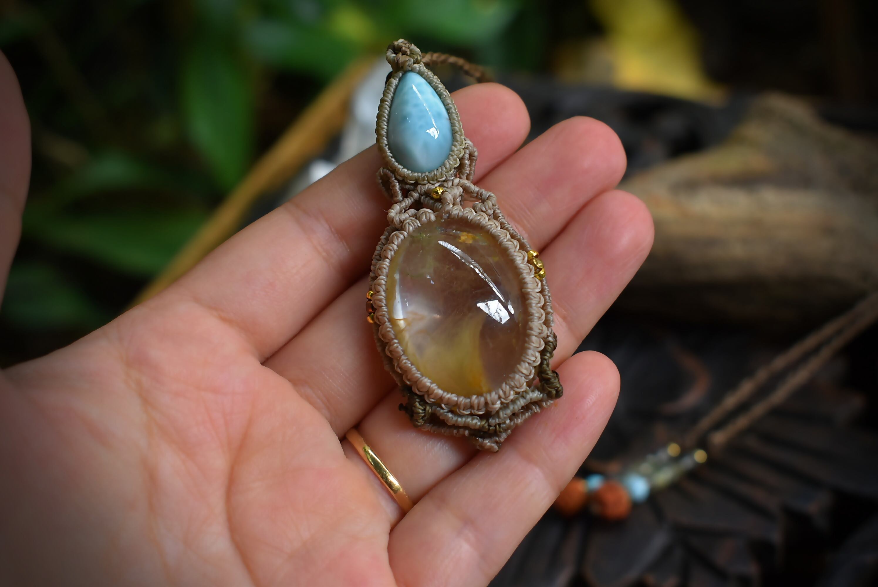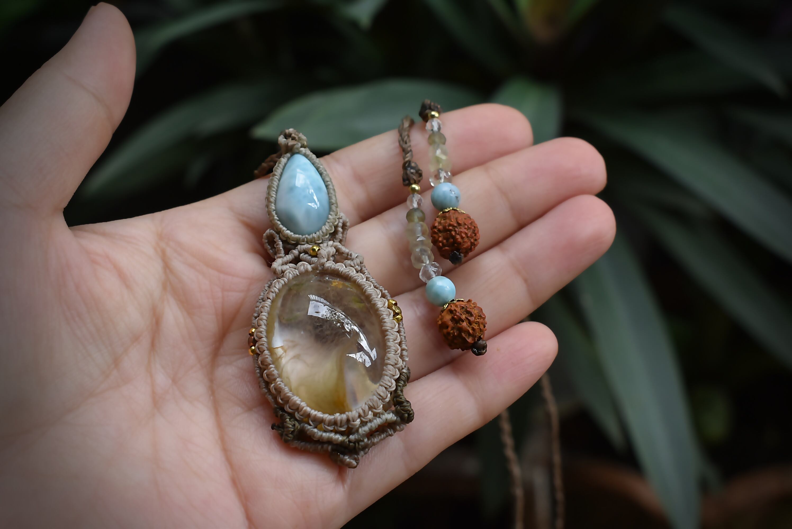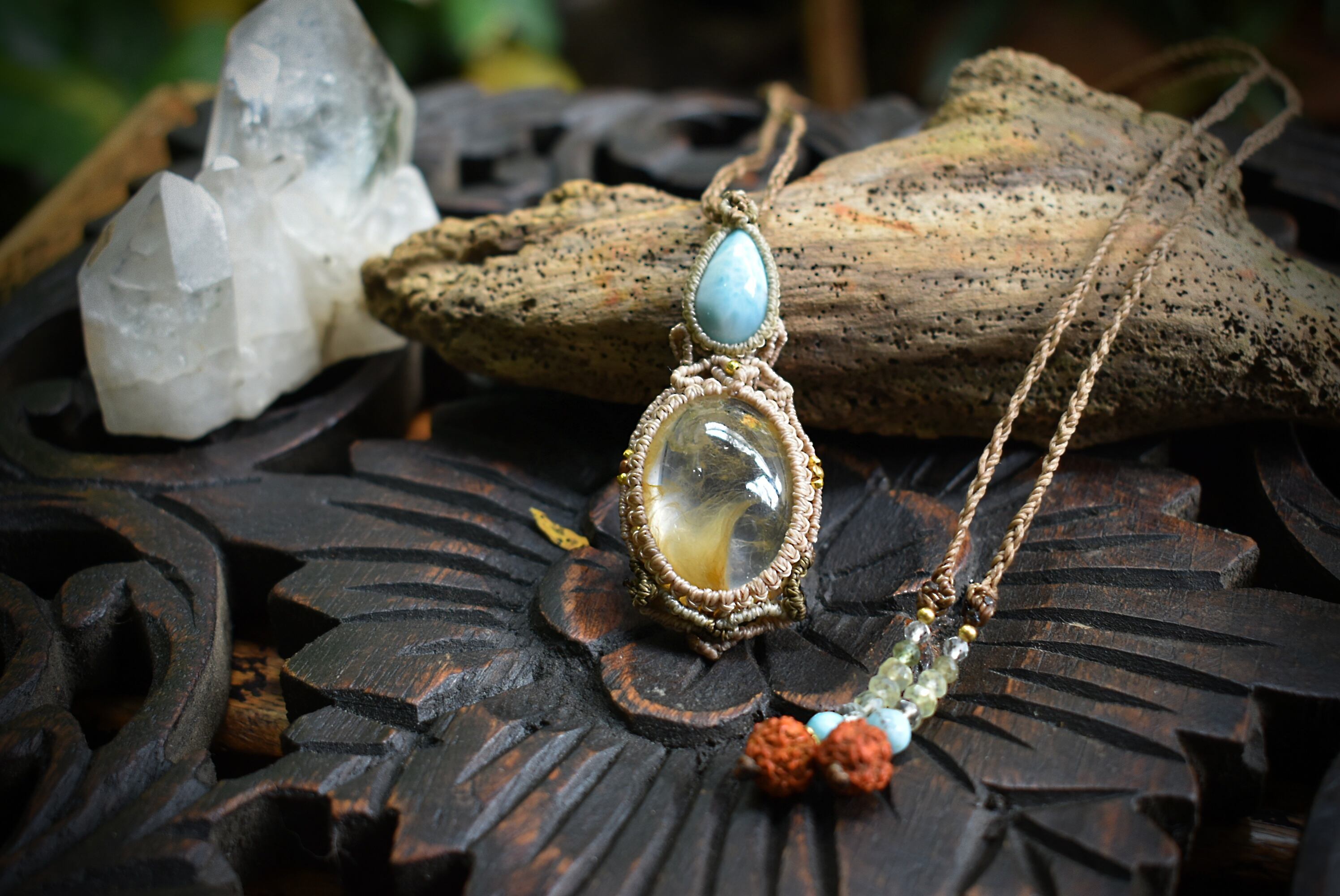 フェザー柄が特徴的なイエローガーデンクォーツを掛け合わせ、大らかな妖精をイメージしてマクラメ編みを施し、ペンダントに仕上げました。