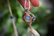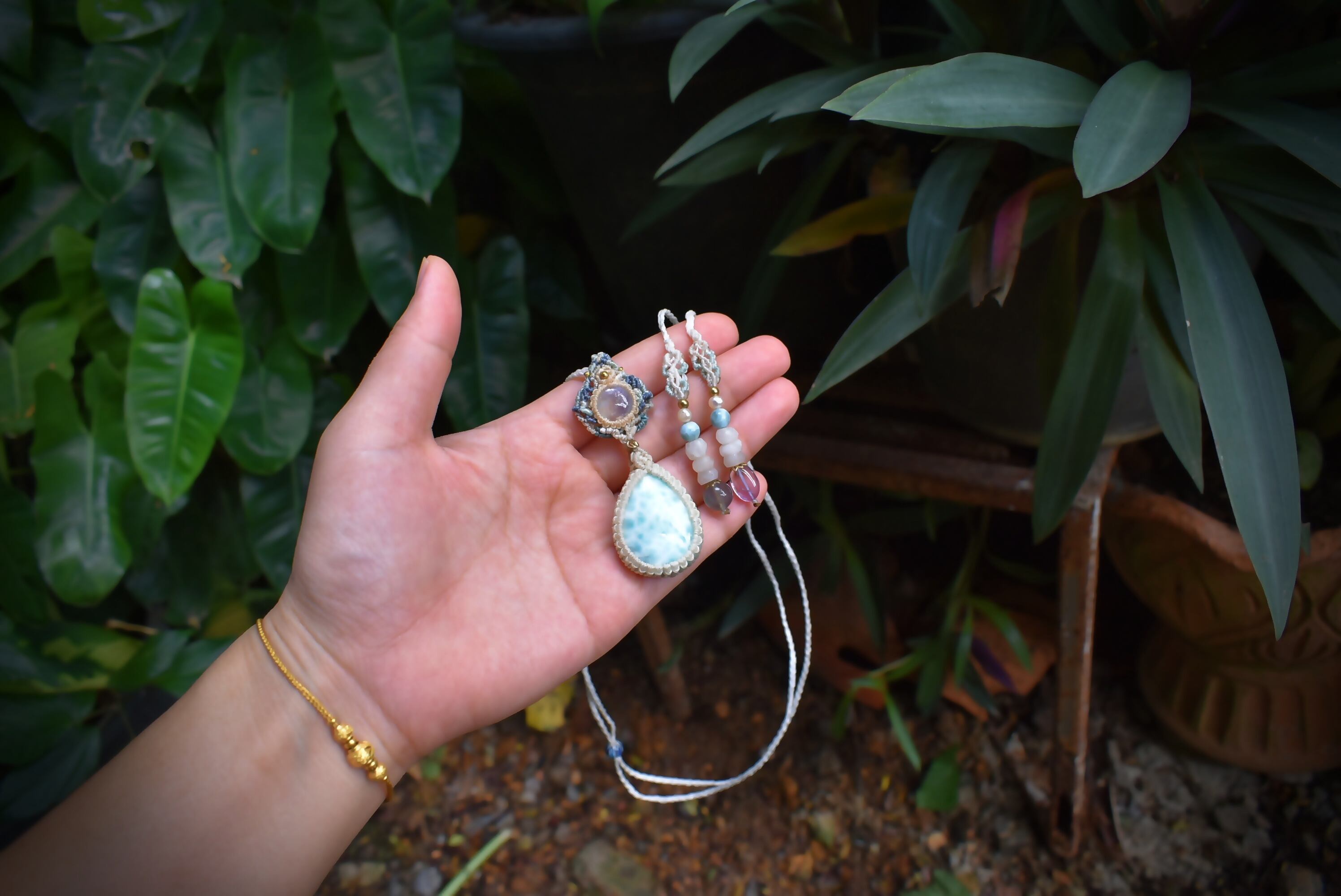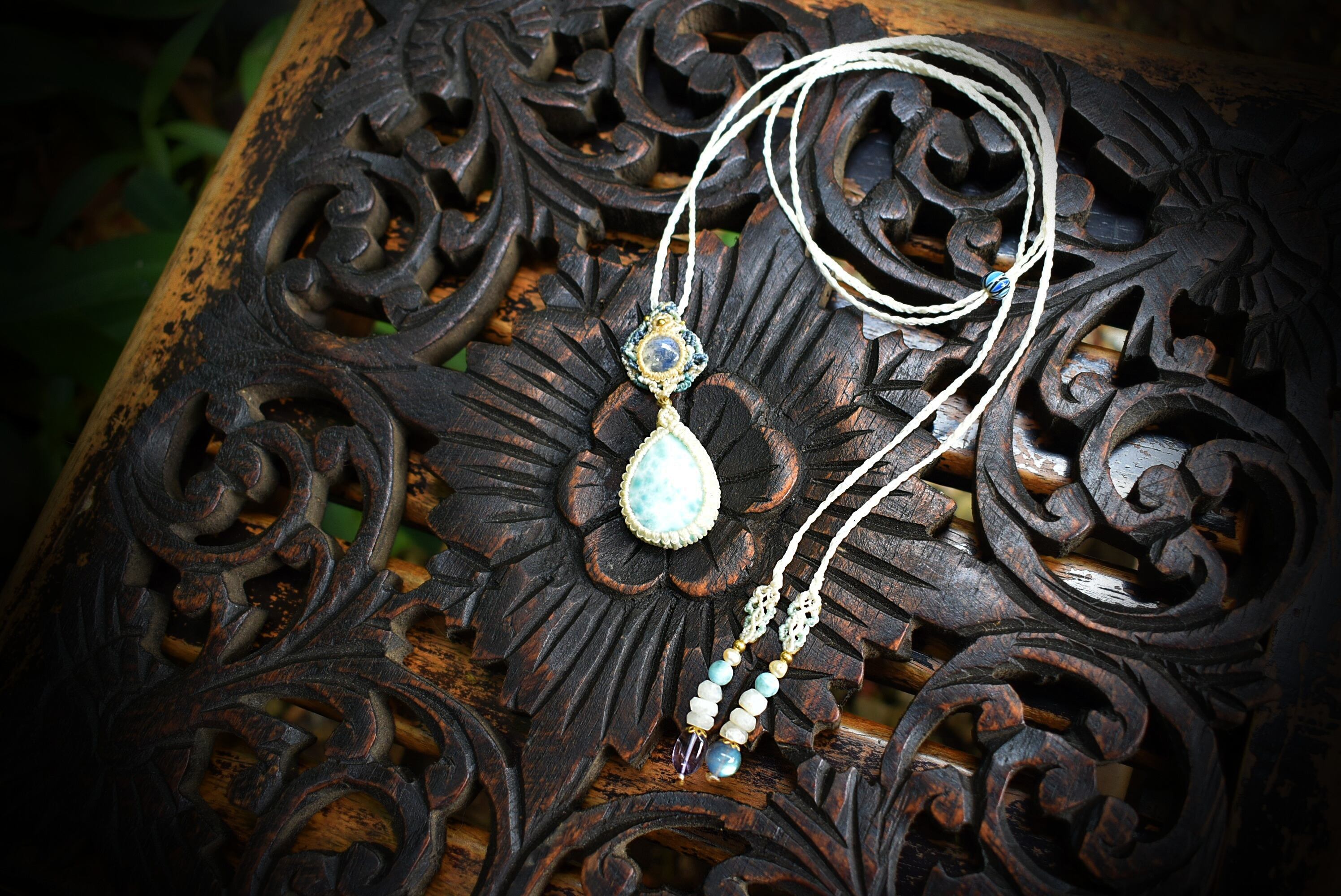 透明感あるホワイトラブラドライト(ブルームーンストーン)と雨模様が特徴的なラリマーのふたつを掛け合わせ、お花と雫をモチーフにしたペンダントにマクラメ編み装飾を施しました。