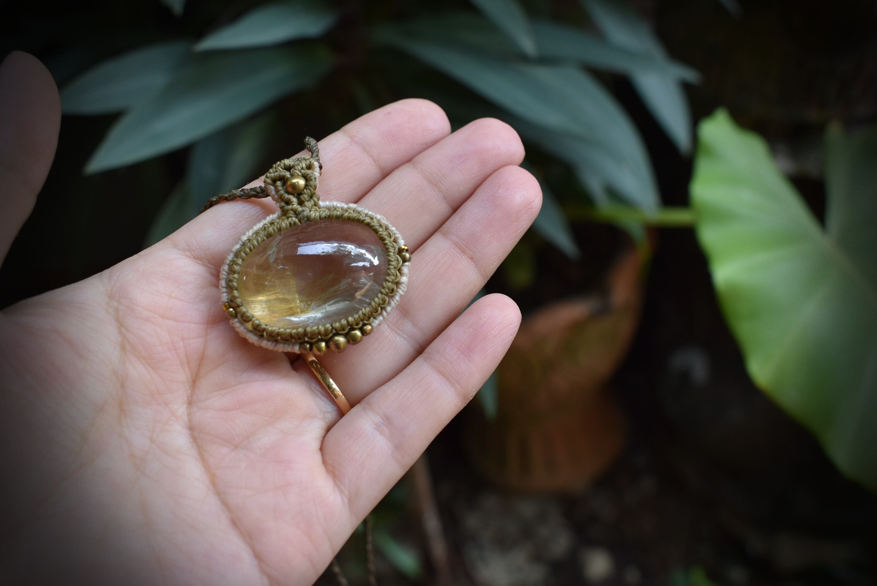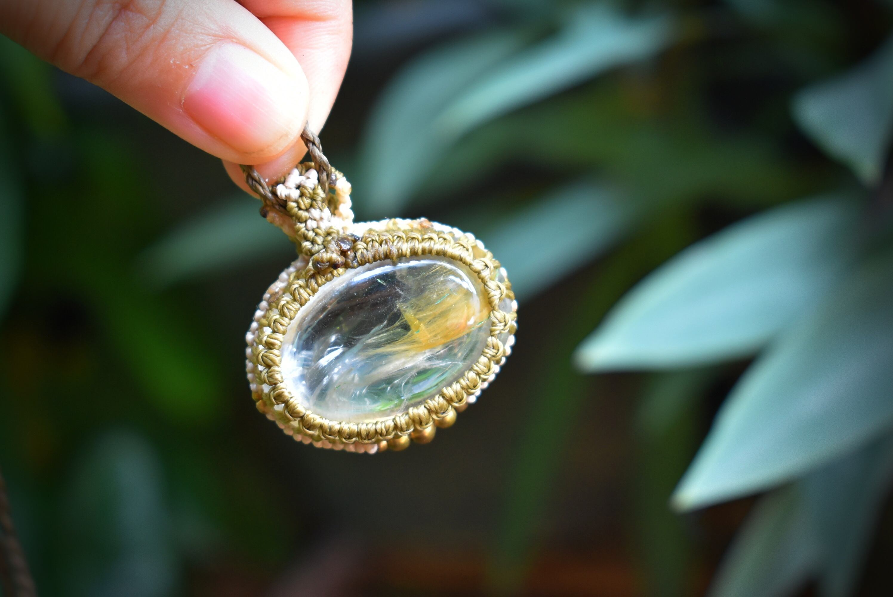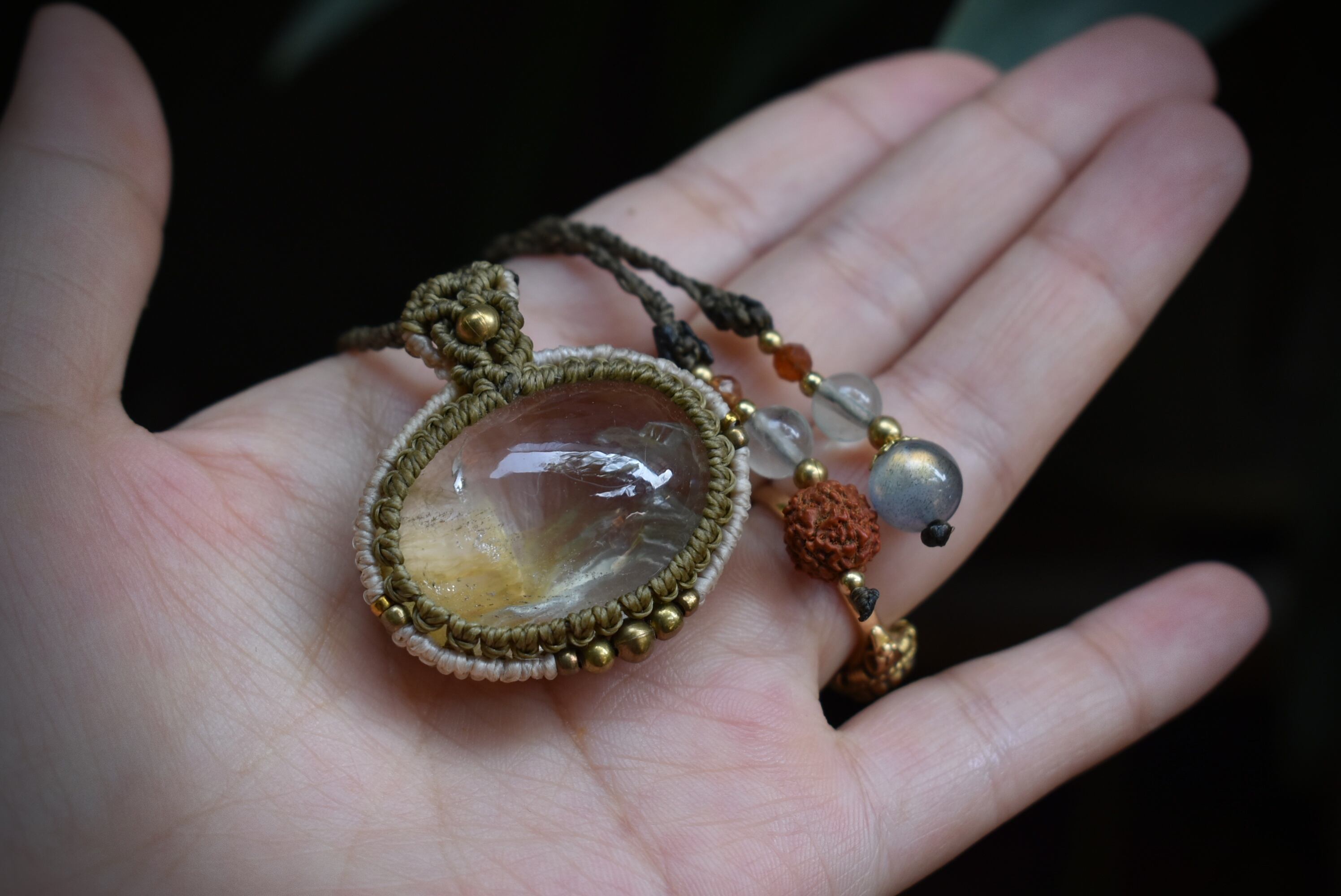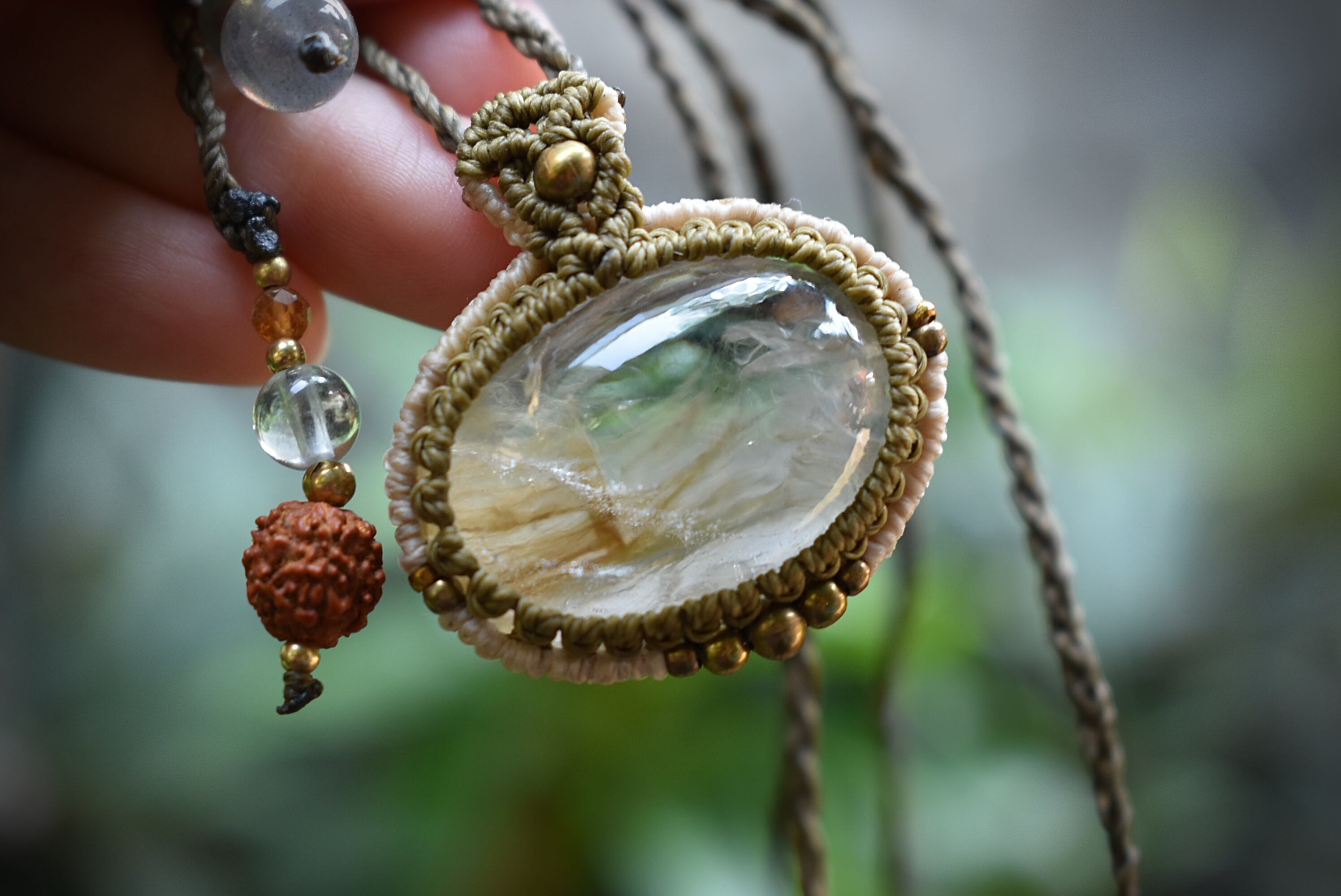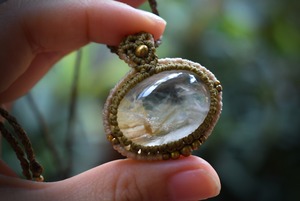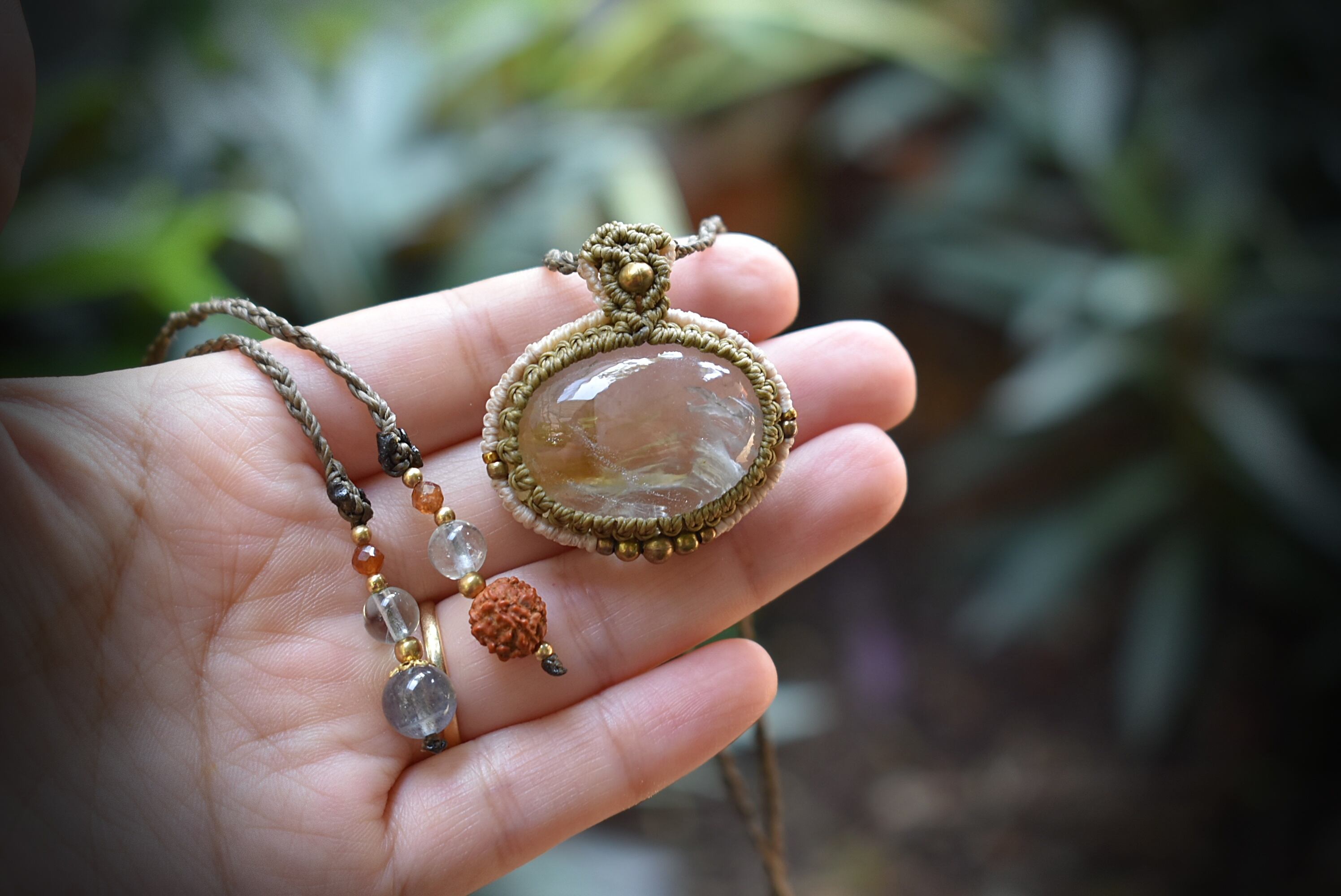 水晶の中に気泡とゴールドカラーの結晶体が入り混じっているガーデンクォーツ 。石の透明度、中からうかがえるシラーはとびっきりの代物。シンプルにマクラメ編み装飾を施してペンダントに仕上げました。