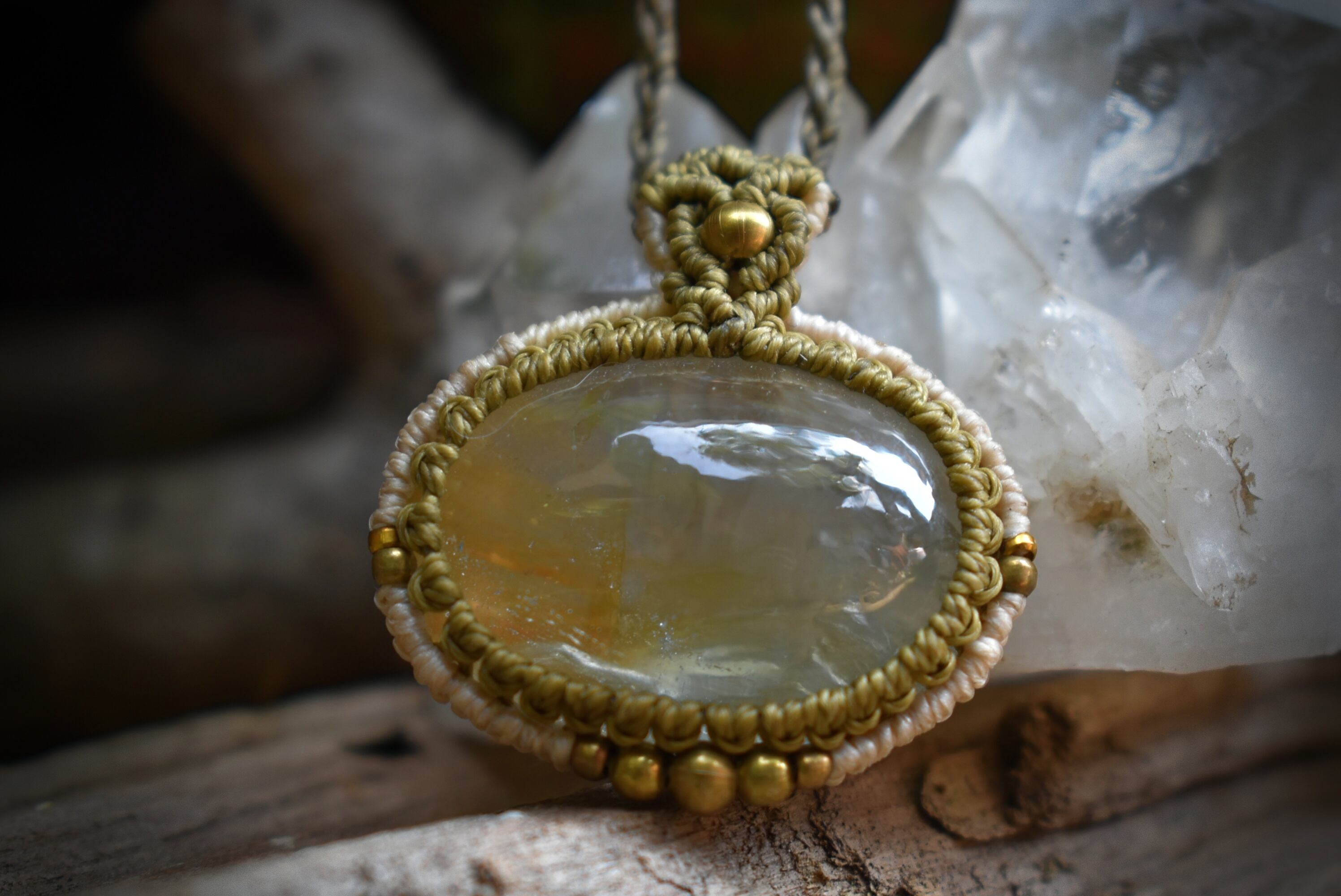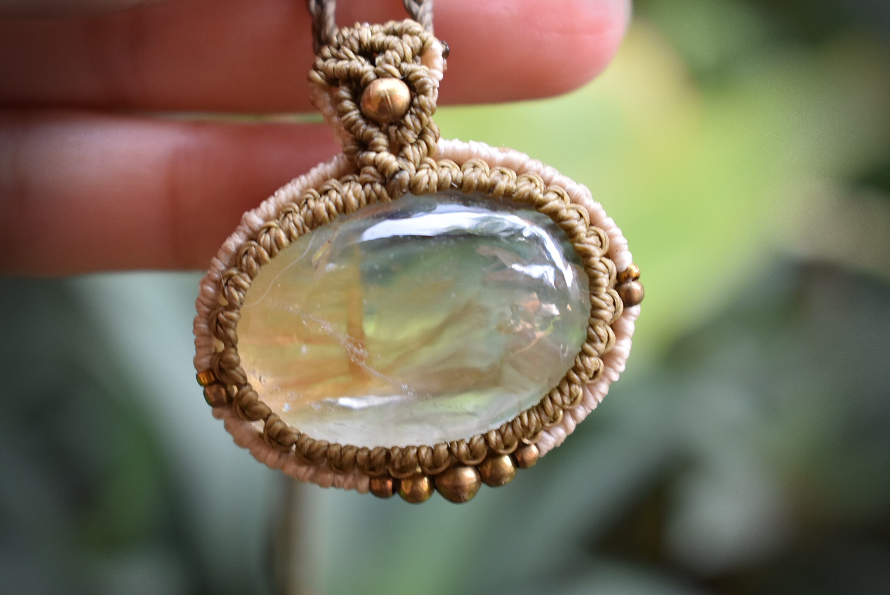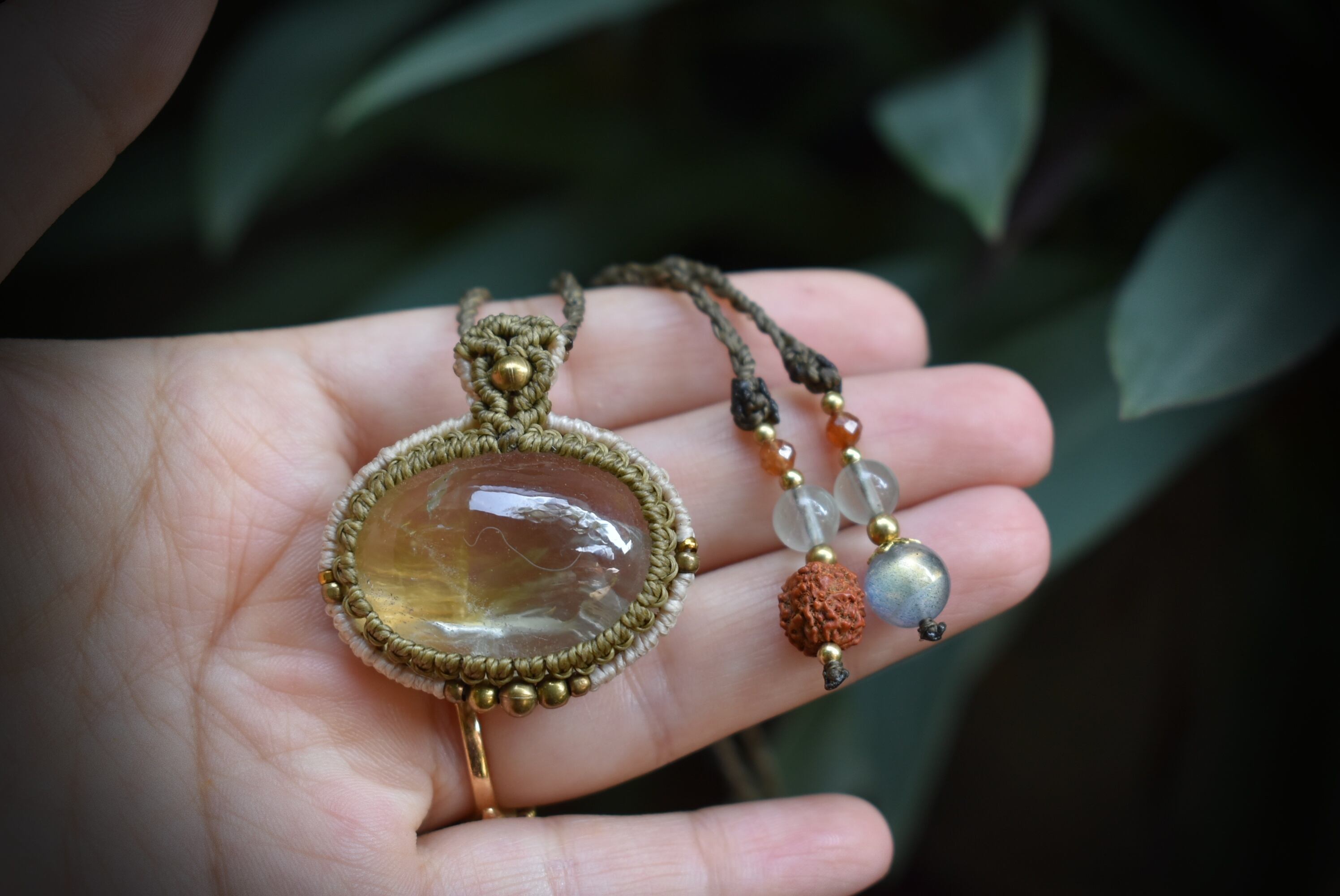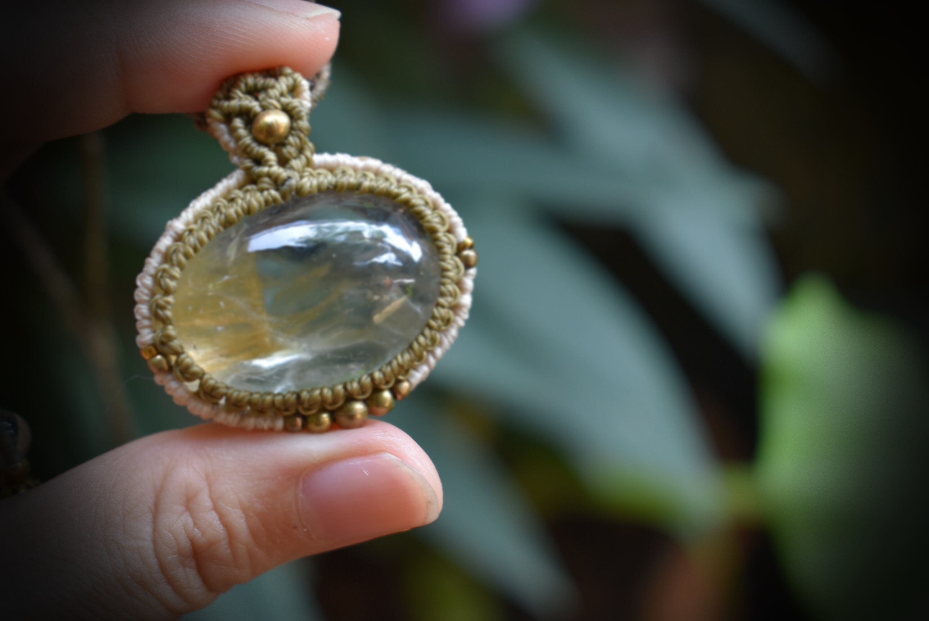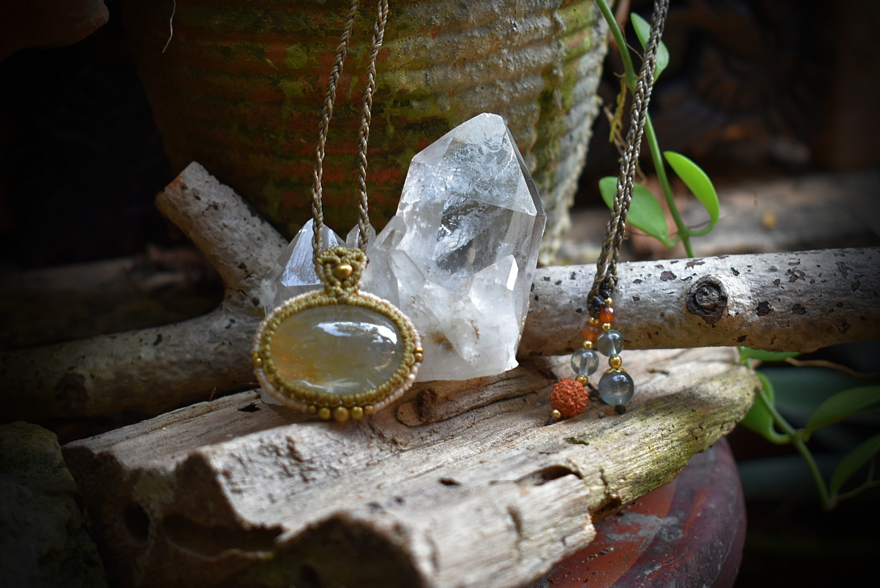 水晶の中に気泡とゴールドカラーの結晶体が入り混じっているガーデンクォーツ 。石の透明度、中からうかがえるシラーはとびっきりの代物。シンプルにマクラメ編み装飾を施してペンダントに仕上げました。