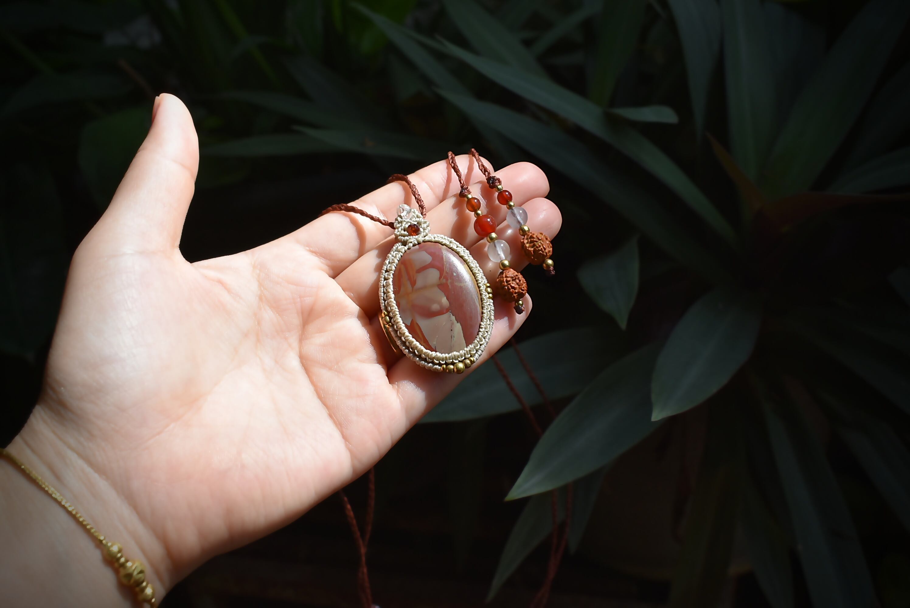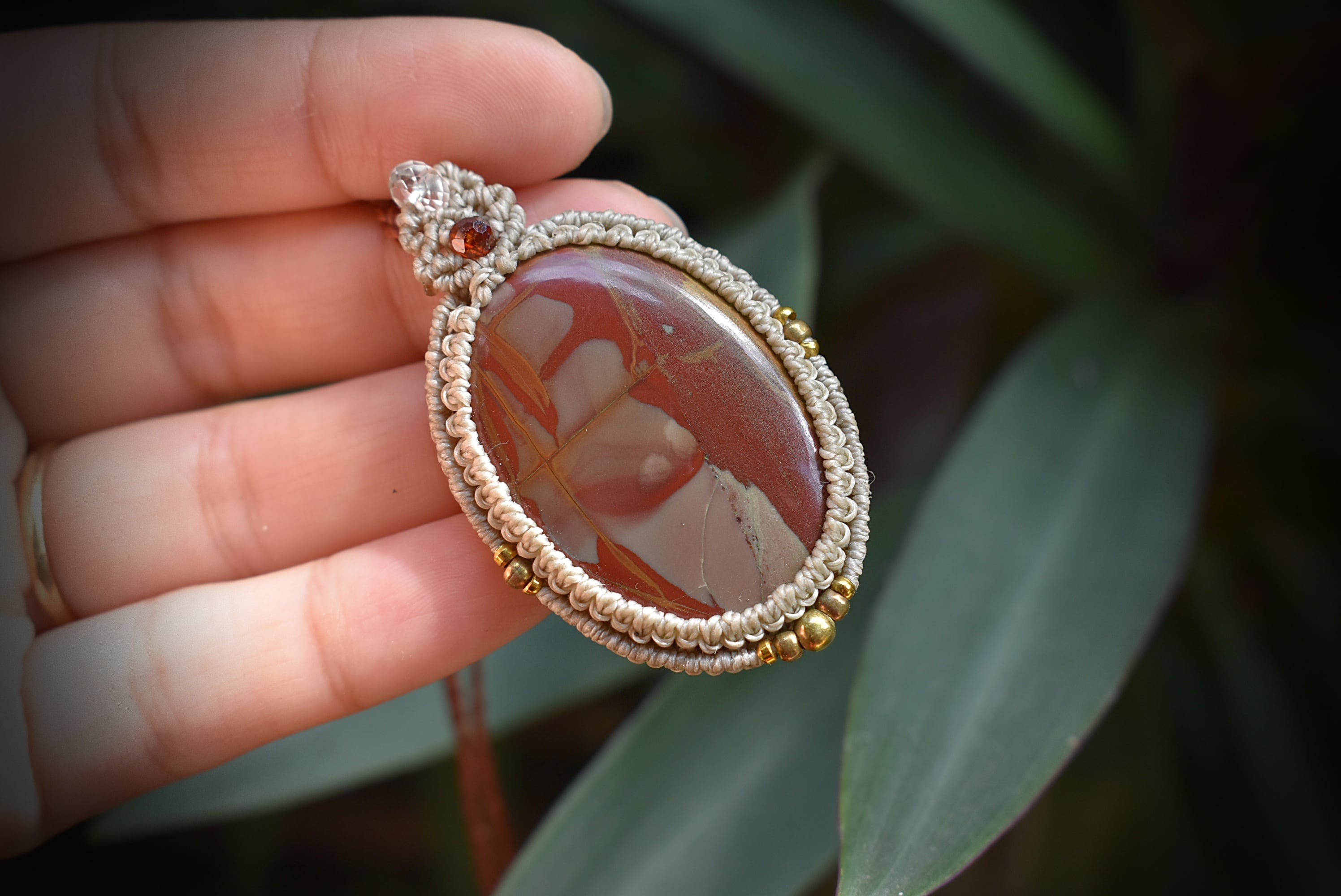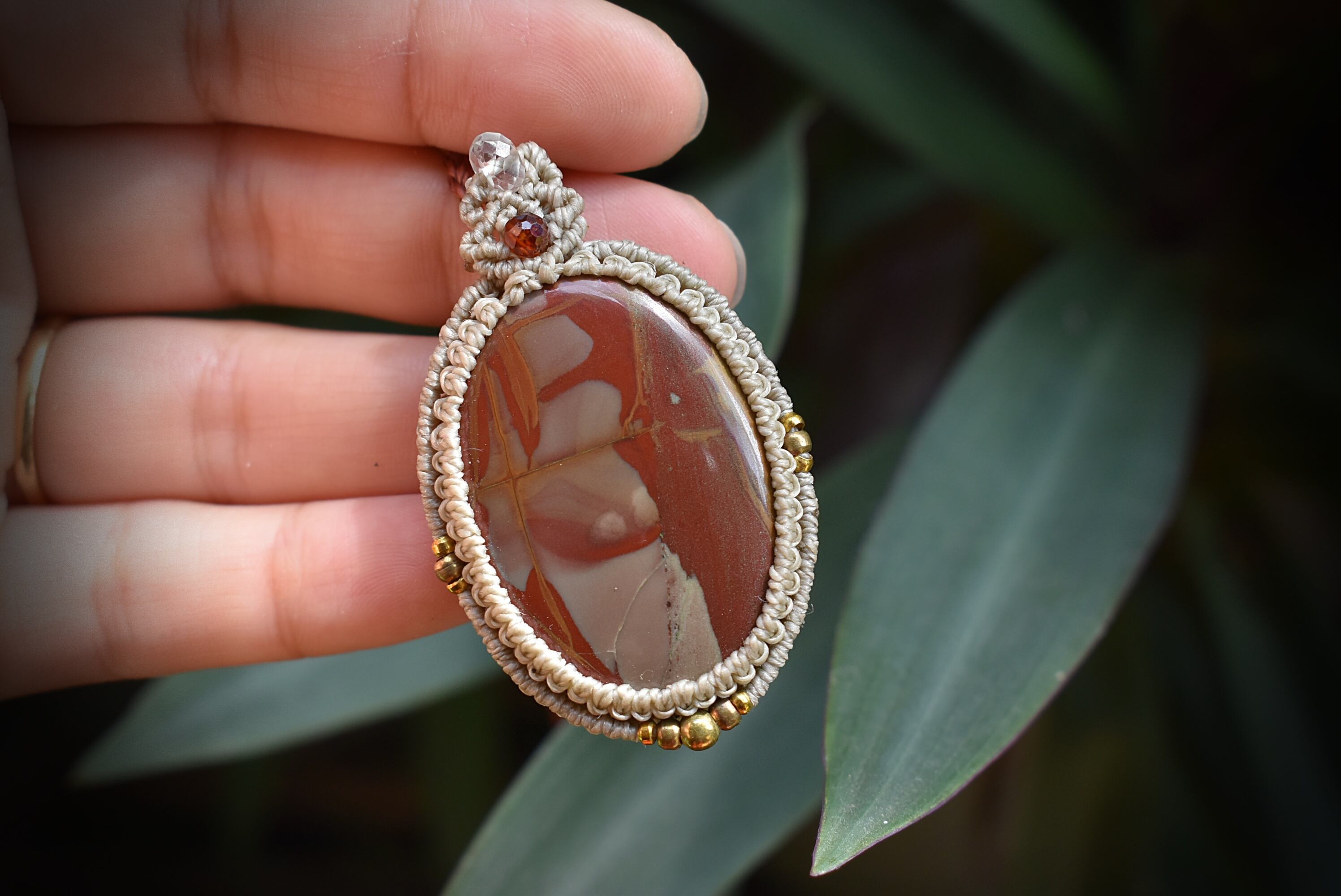 芸術的な模様がトレードマークのムーアカイトルースをマクラメ編み装飾を施し、ペンダントに仕上げました。ペンダントのトップの部分には良質なカッティングが施されたガーネットビーズとアクアマリンビーズを編み込み、アンティーク感溢れるクラシックなデザインに仕上げました。