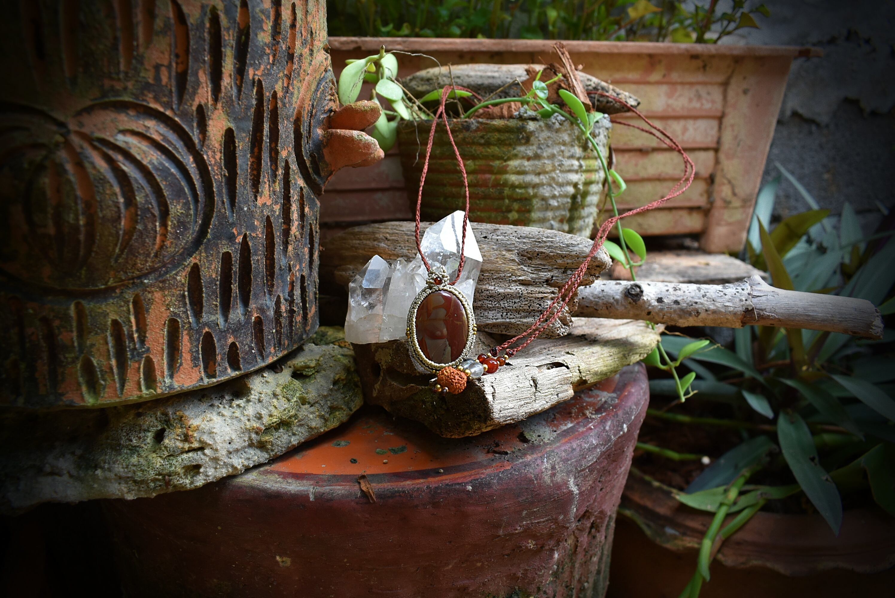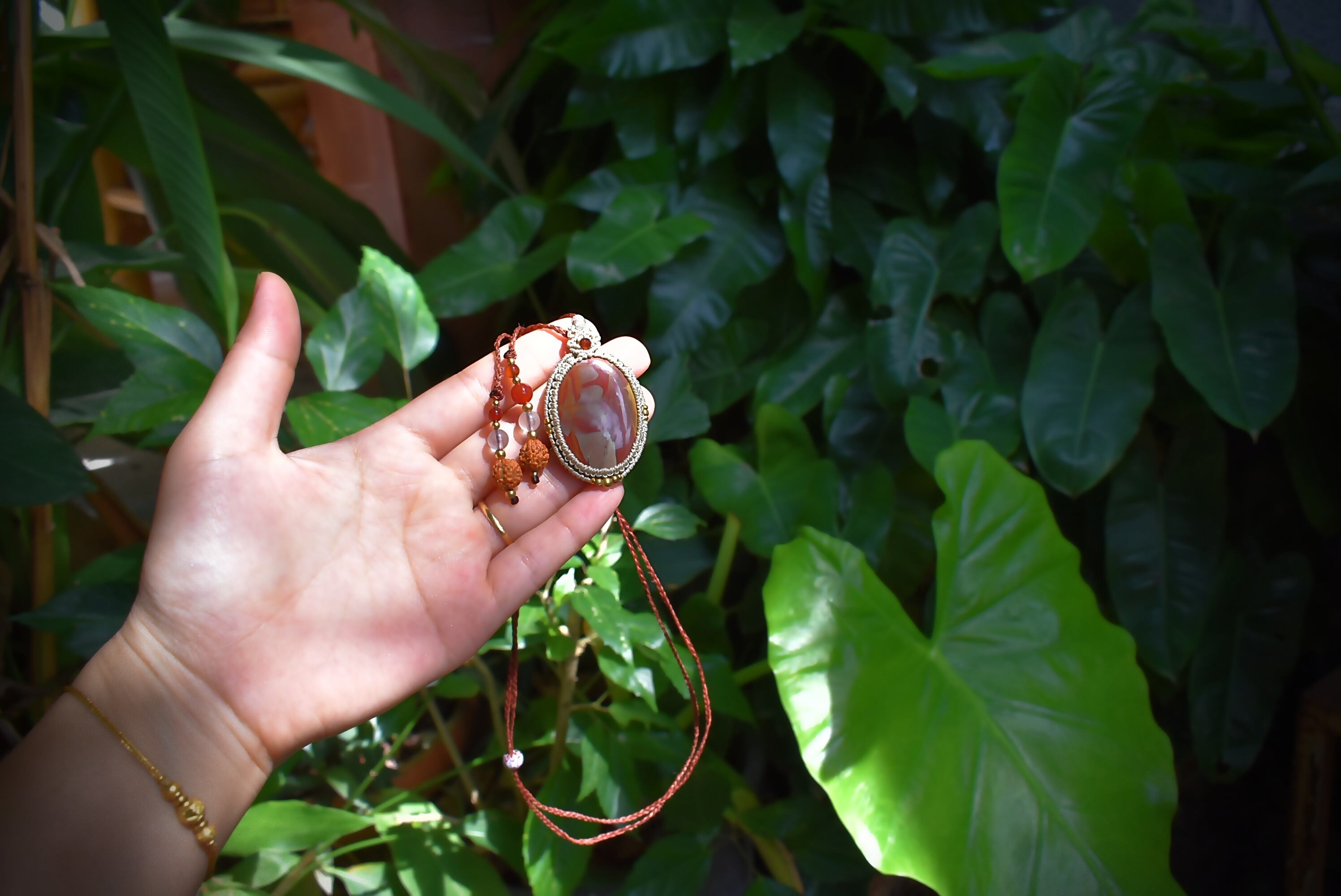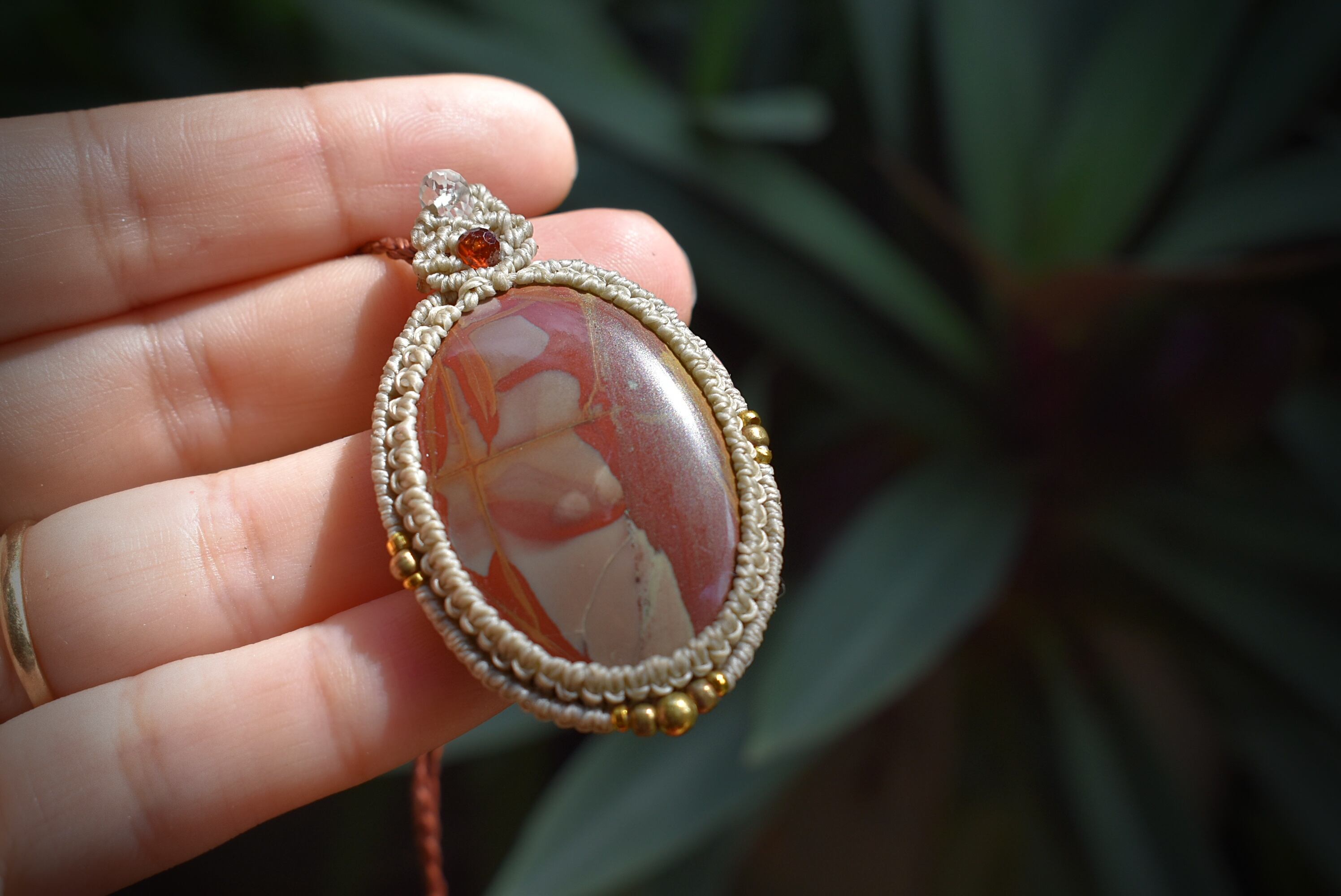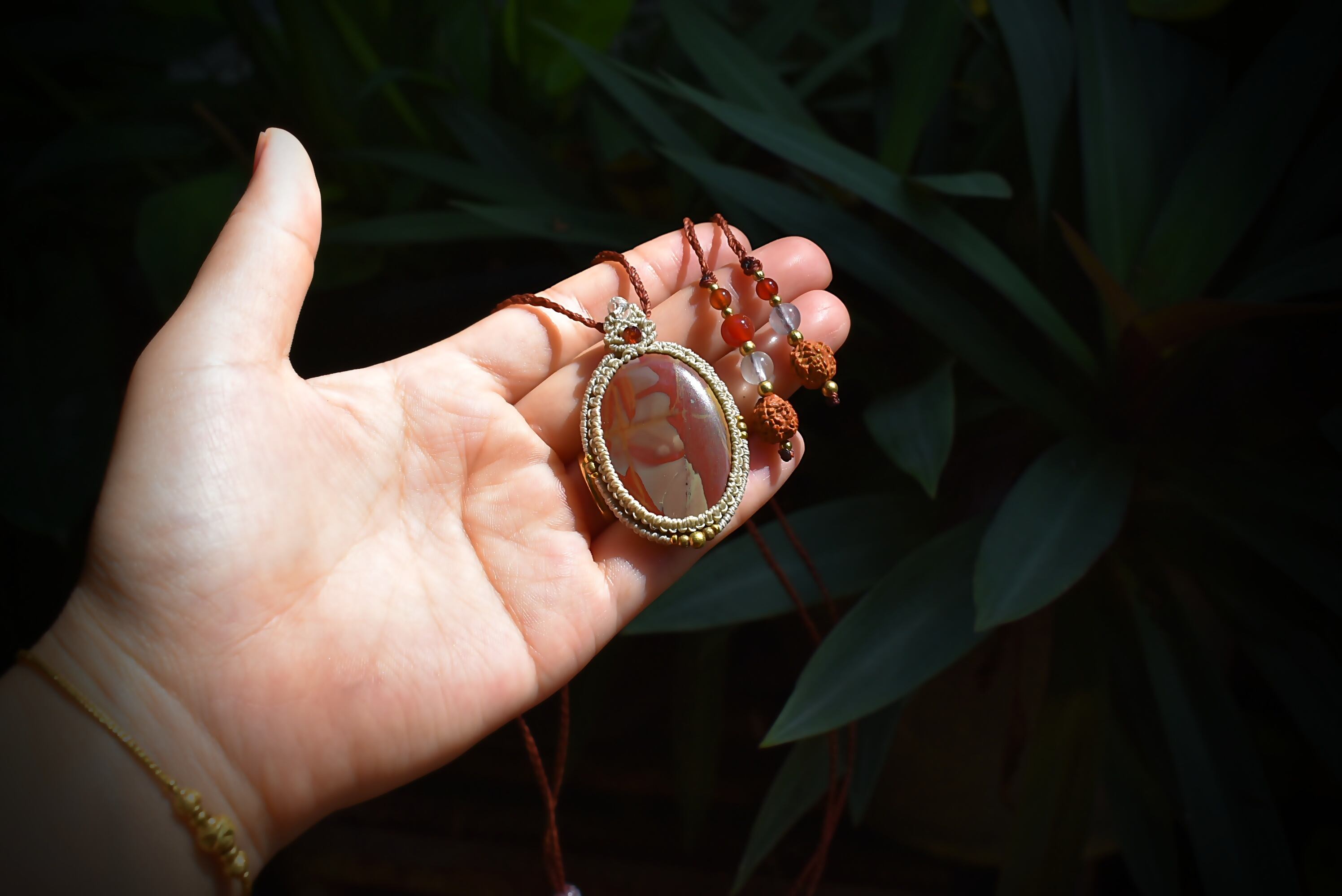芸術的な模様がトレードマークのムーアカイトルースをマクラメ編み装飾を施し、ペンダントに仕上げました。ペンダントのトップの部分には良質なカッティングが施されたガーネットビーズとアクアマリンビーズを編み込み、アンティーク感溢れるクラシックなデザインに仕上げました。