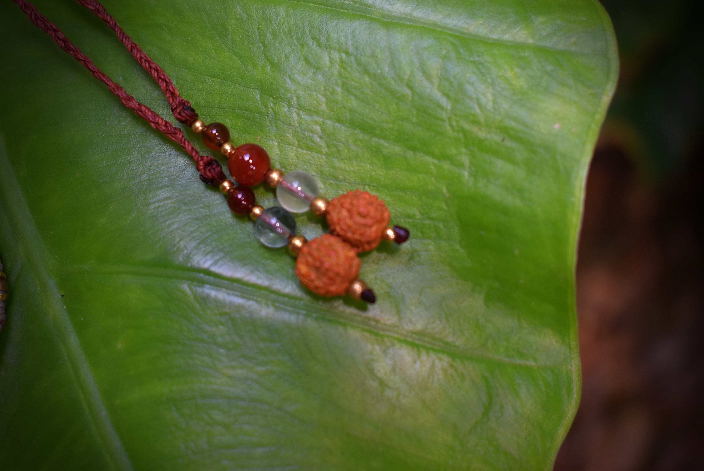 ◆このたびはヘンプ、ダークレッドの2色の蝋引き糸を使用しマクラメ編み装飾を施しました。