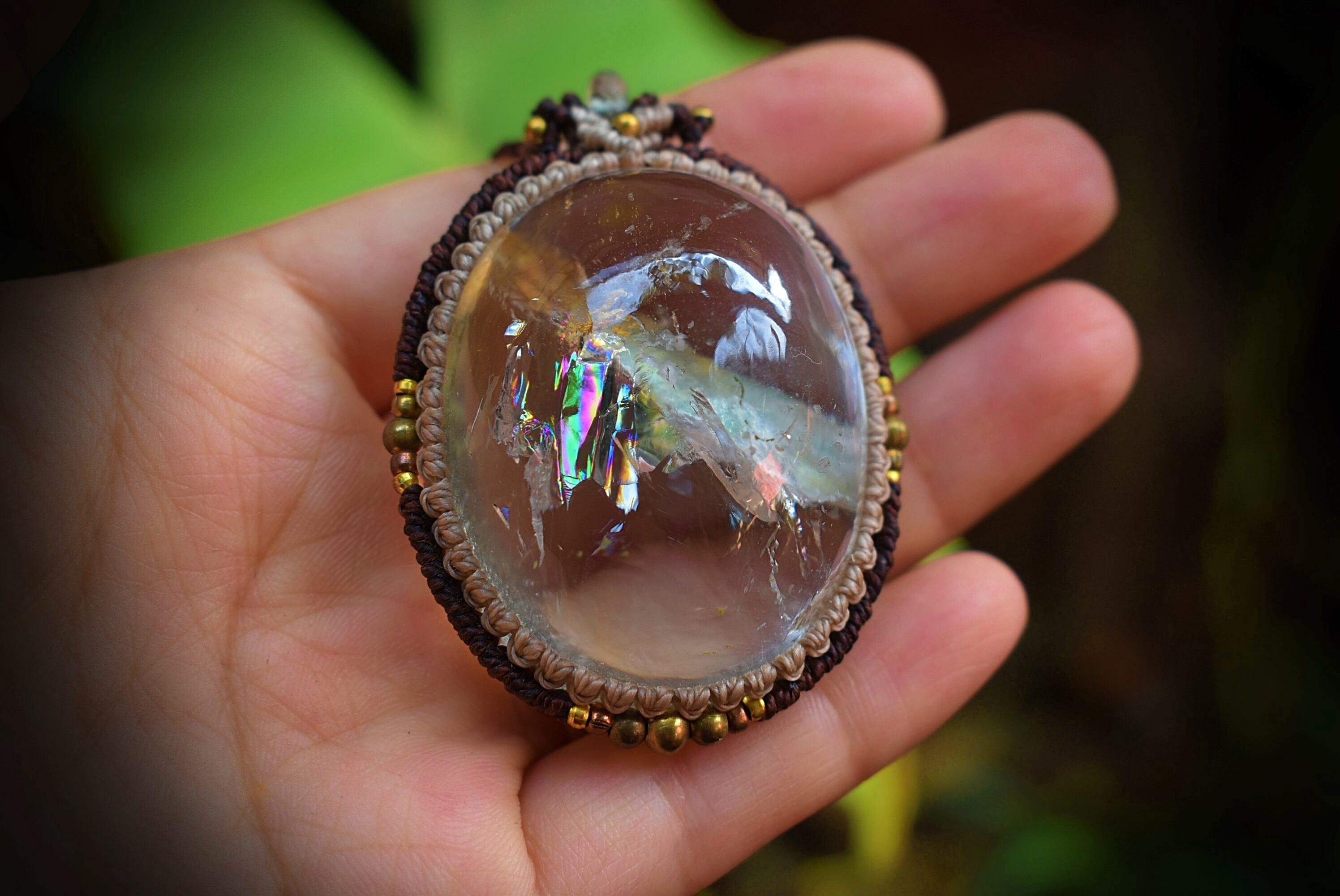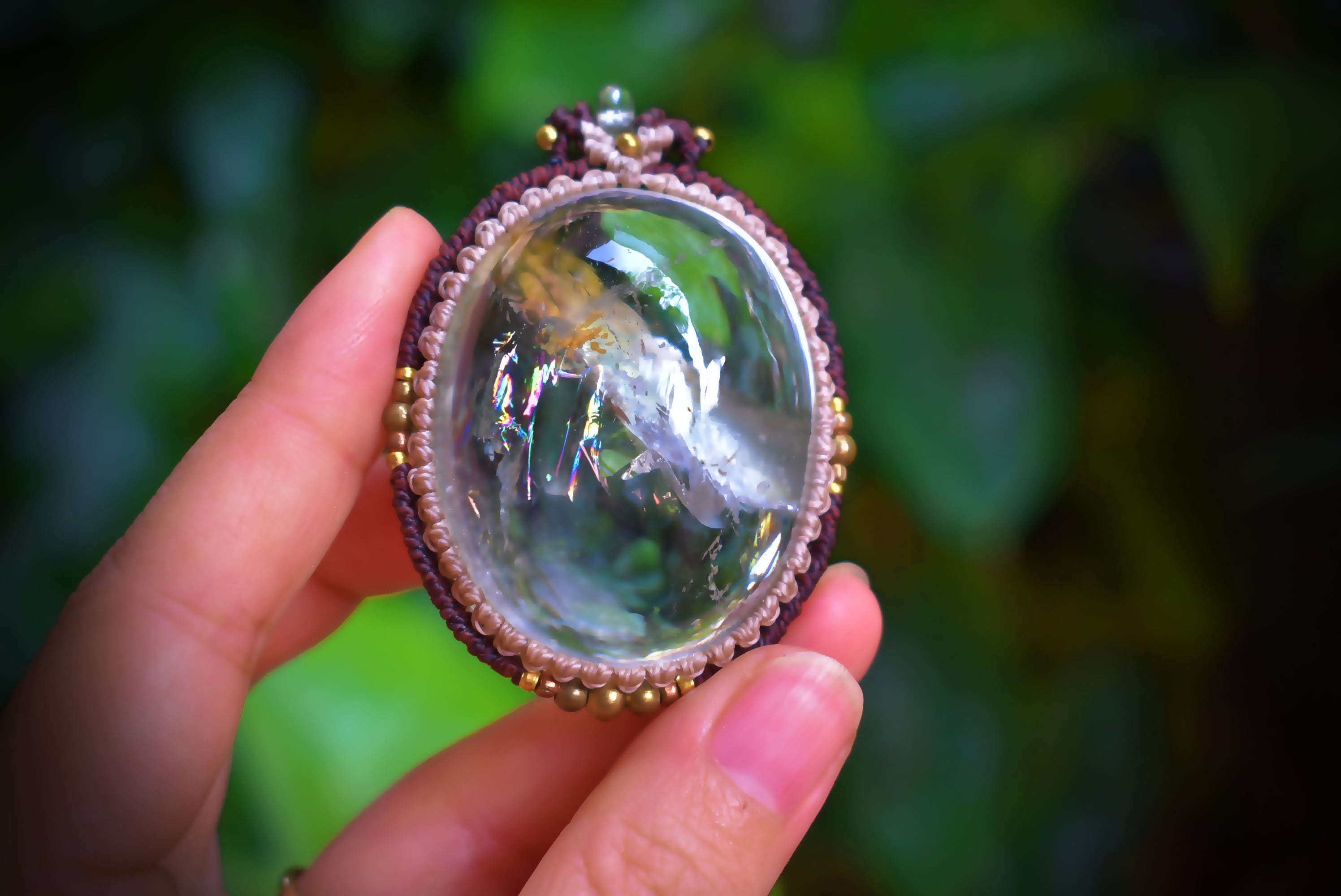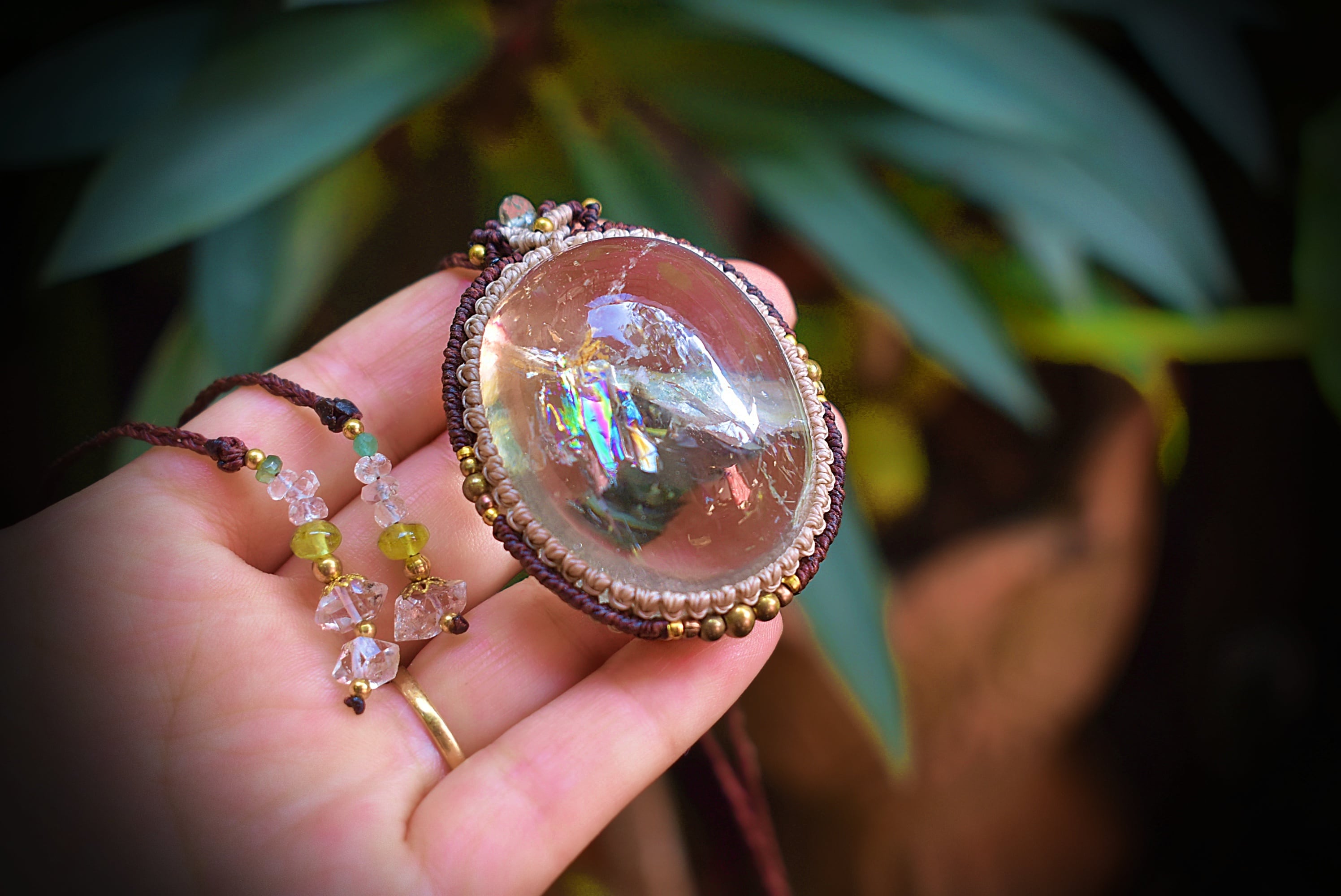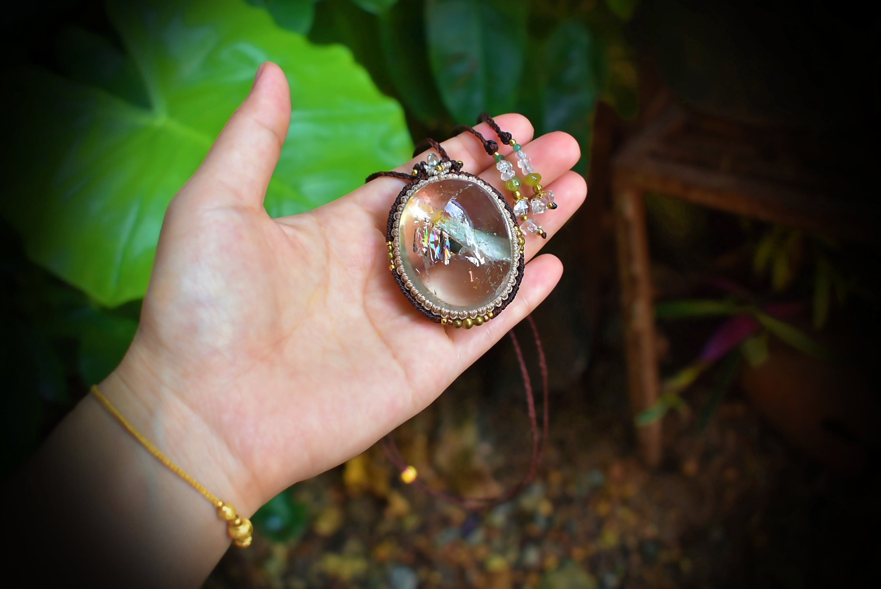 このたびの水晶、透明感溢れる大きな石の中に大きな虹をはっきりと見ることができる、特別なピースのルースをペンダントにマクラメ編み装飾をシンプルに施し、仕上げました。